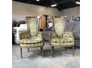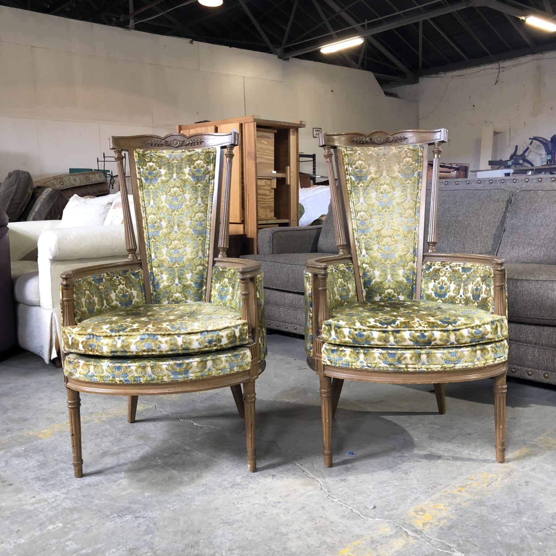 Velvet floral fabric. Seats have hardened with age and fabric is sun faded in the back. Good and sturdy construction