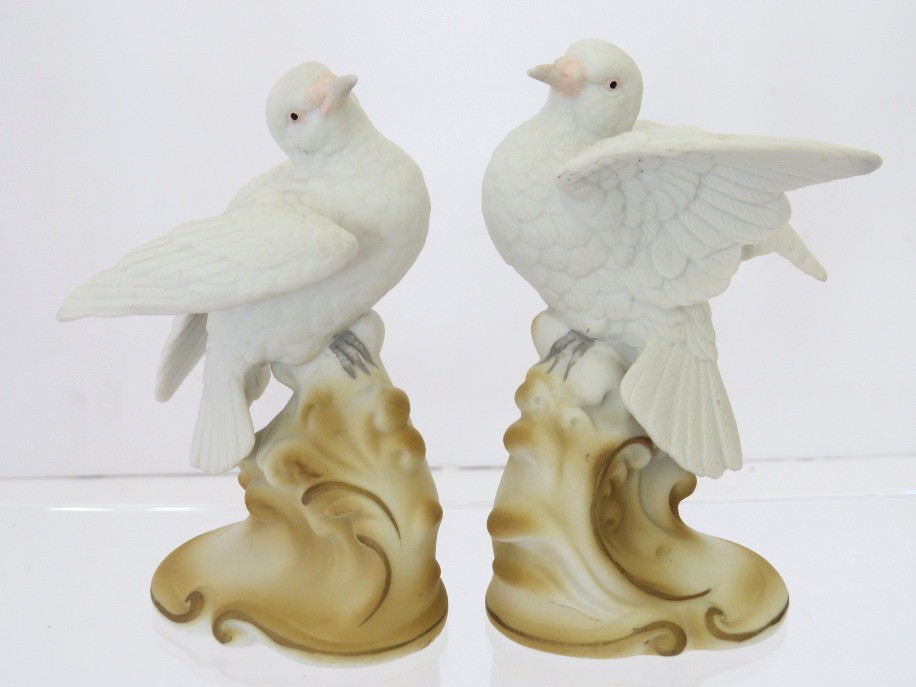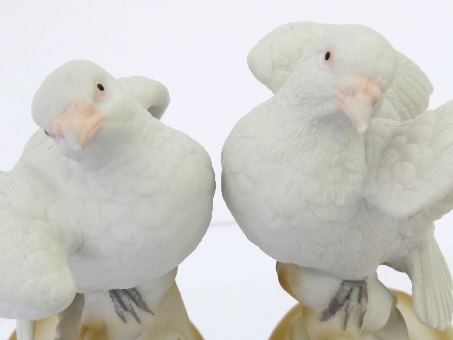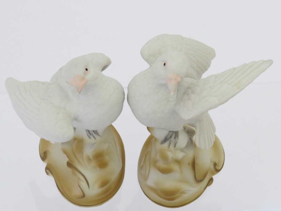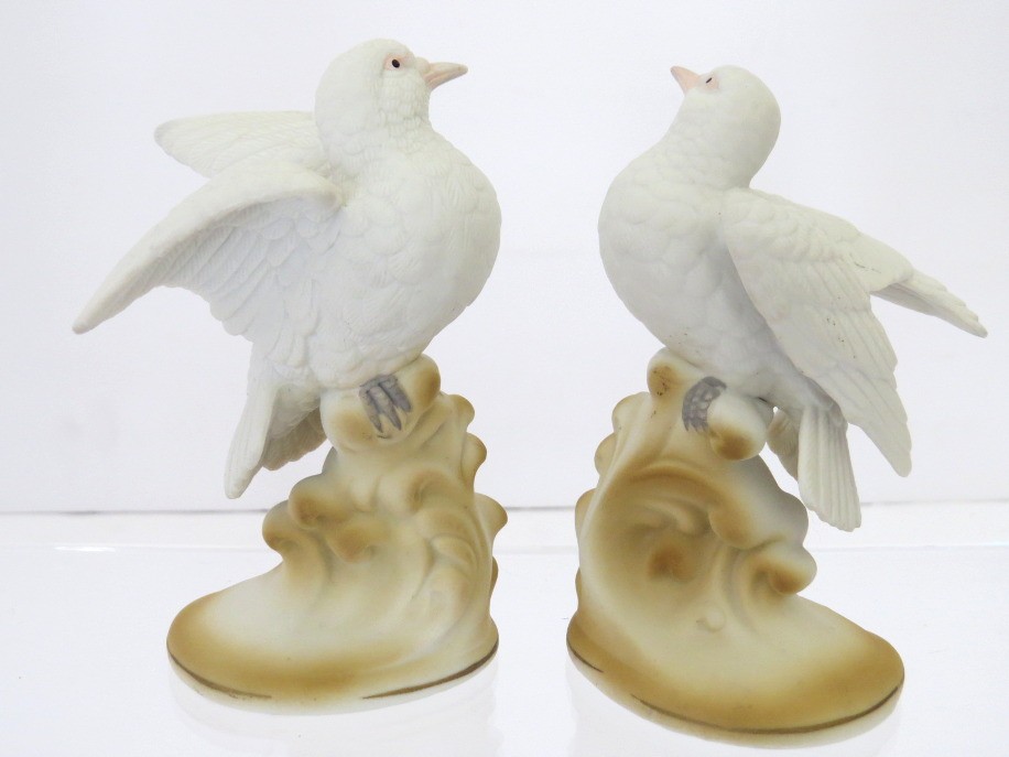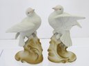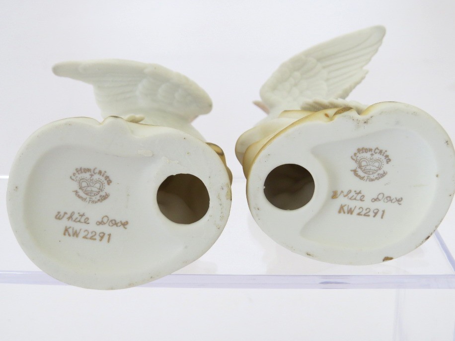 A pair of hand-painted porcelain white dove figurines marked Lefton, China. They are part of the Lefton, China Garden Birds collection. They stand approximately 4" tall. The underside is marked “Lefton China,” “White Dove,” and model number KW2291, confirming its place within Lefton’s collectible bird series. Appear to have no cracks, chips or repairs. Plastic display stand not included.