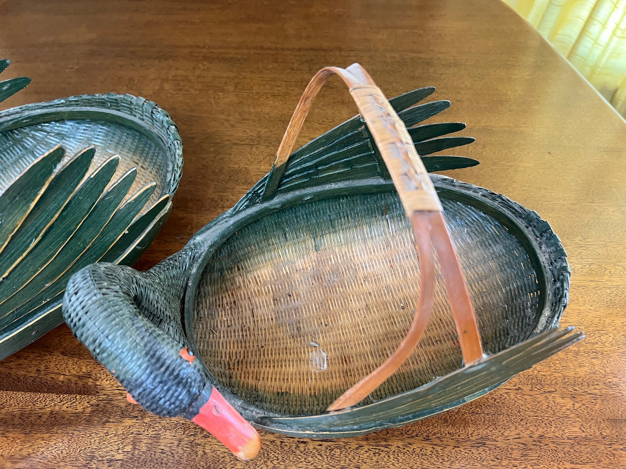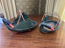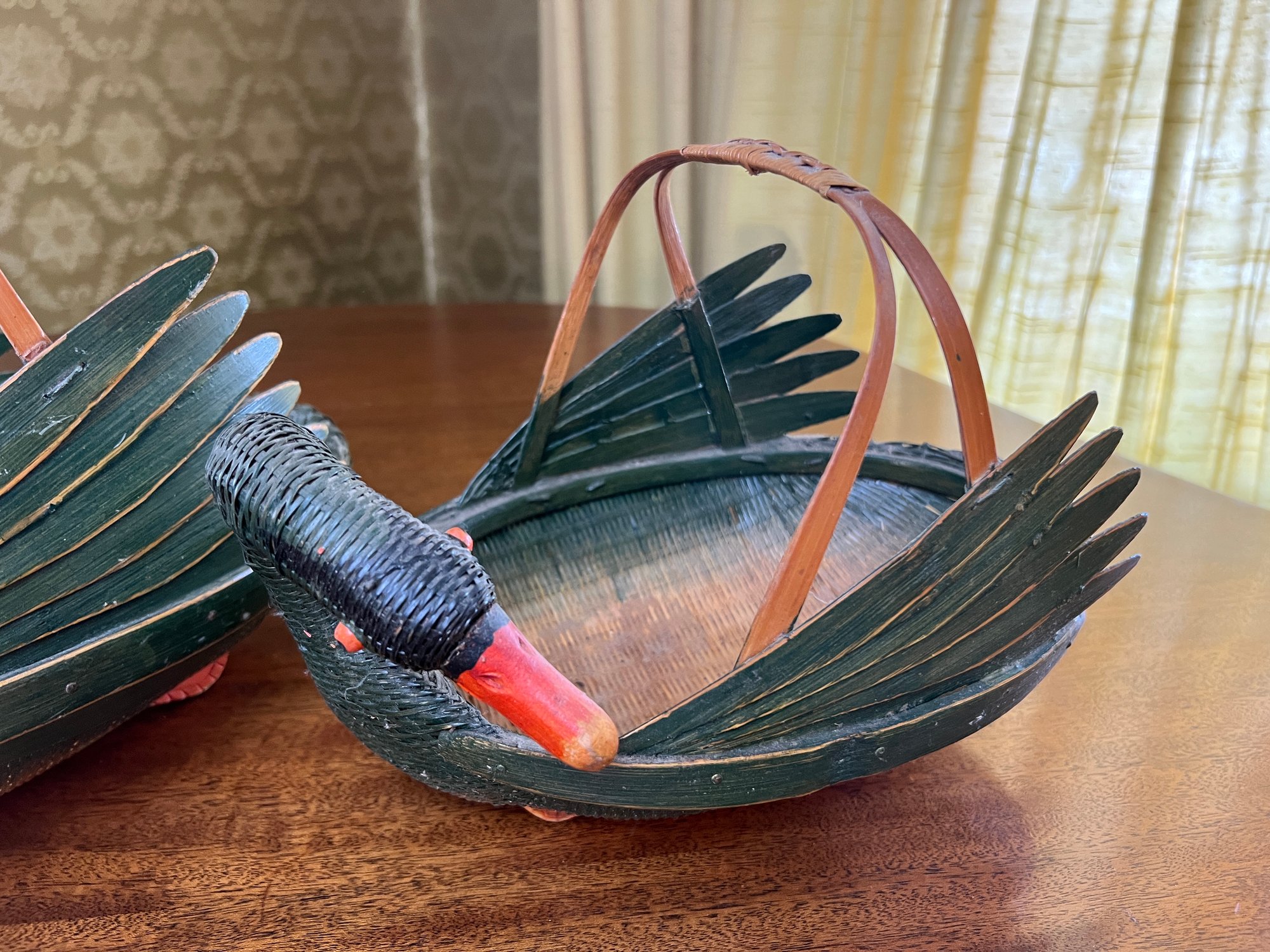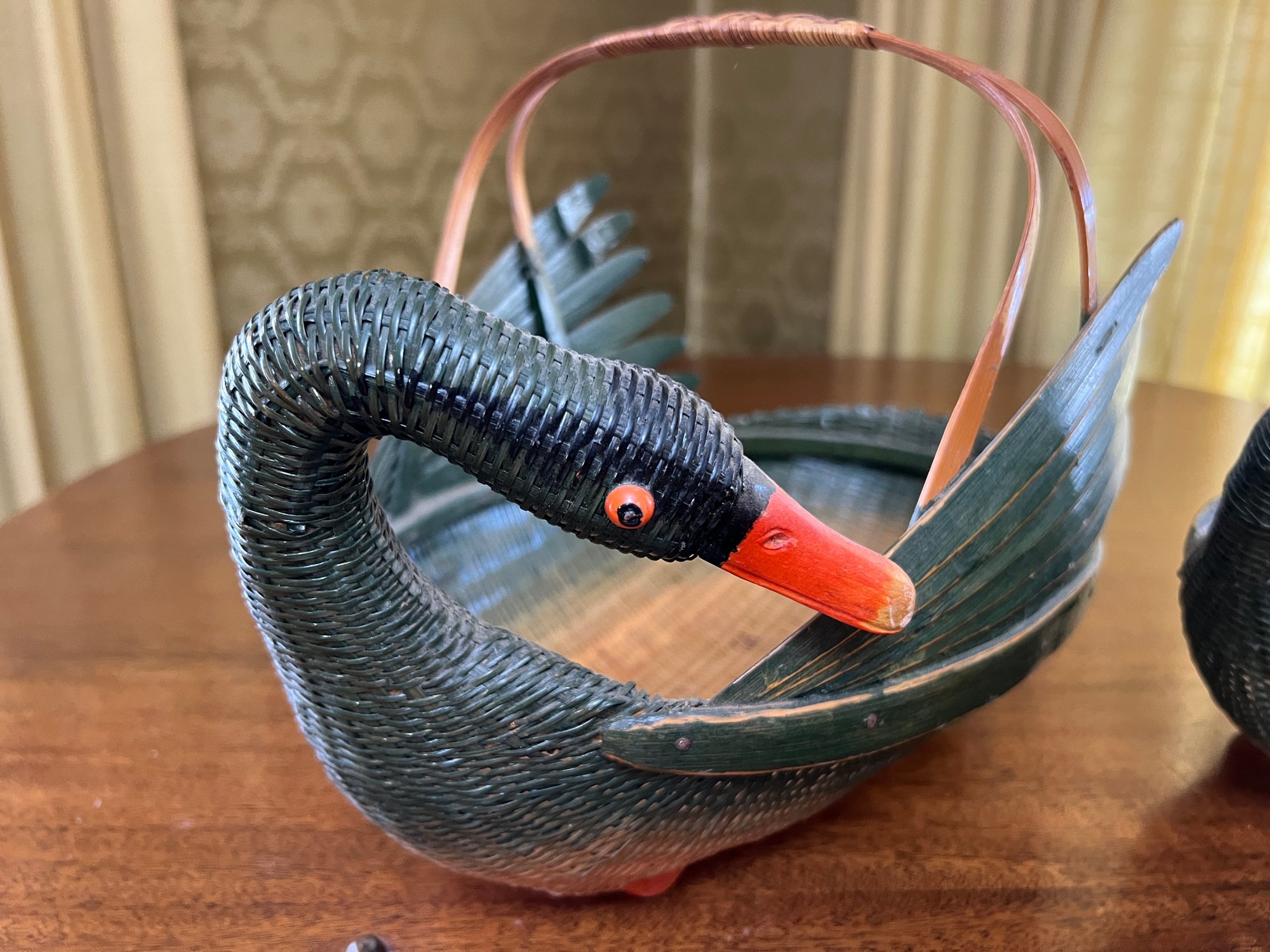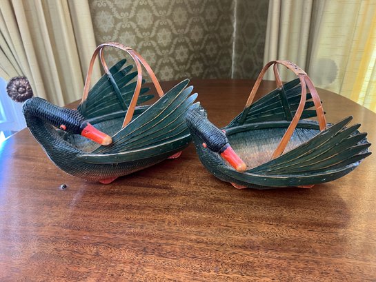 Charming pair of handmade vintage Zhejiang style nesting black swan or goose baskets. Larger basket measures about 12.5" in length.