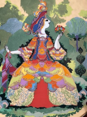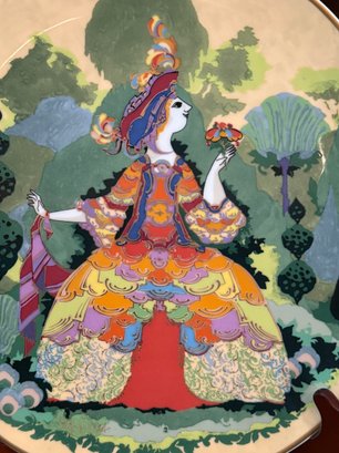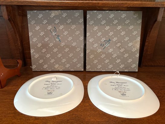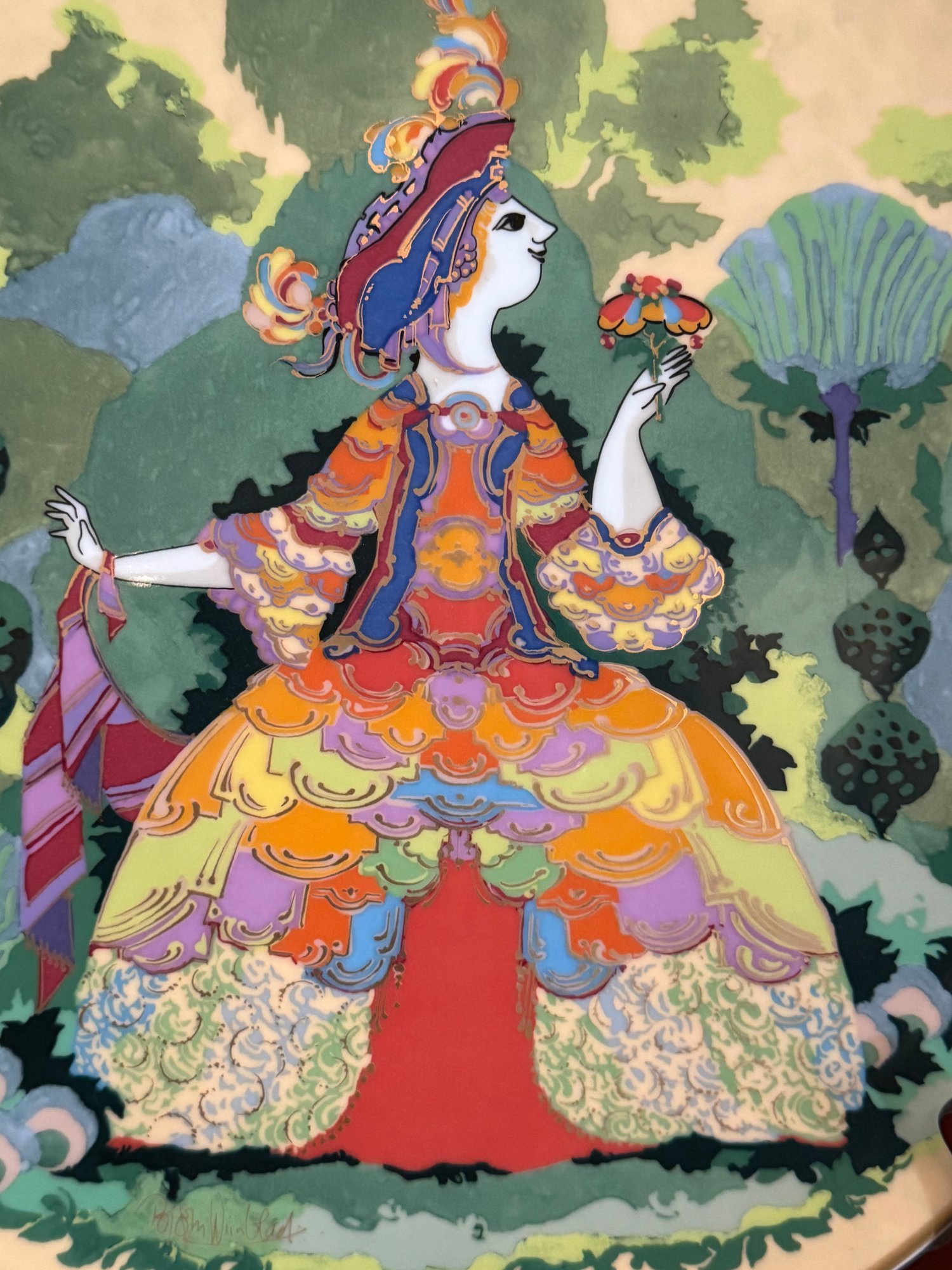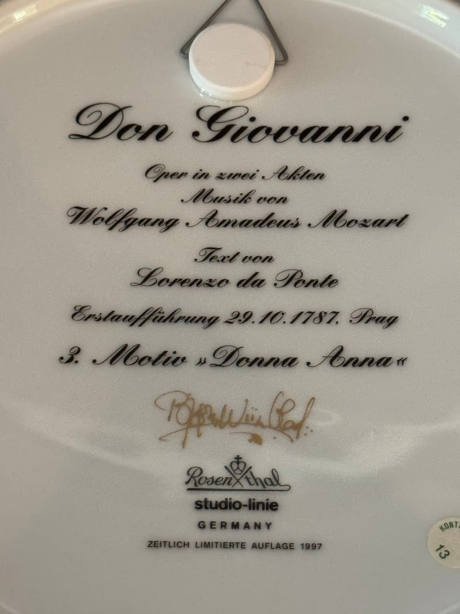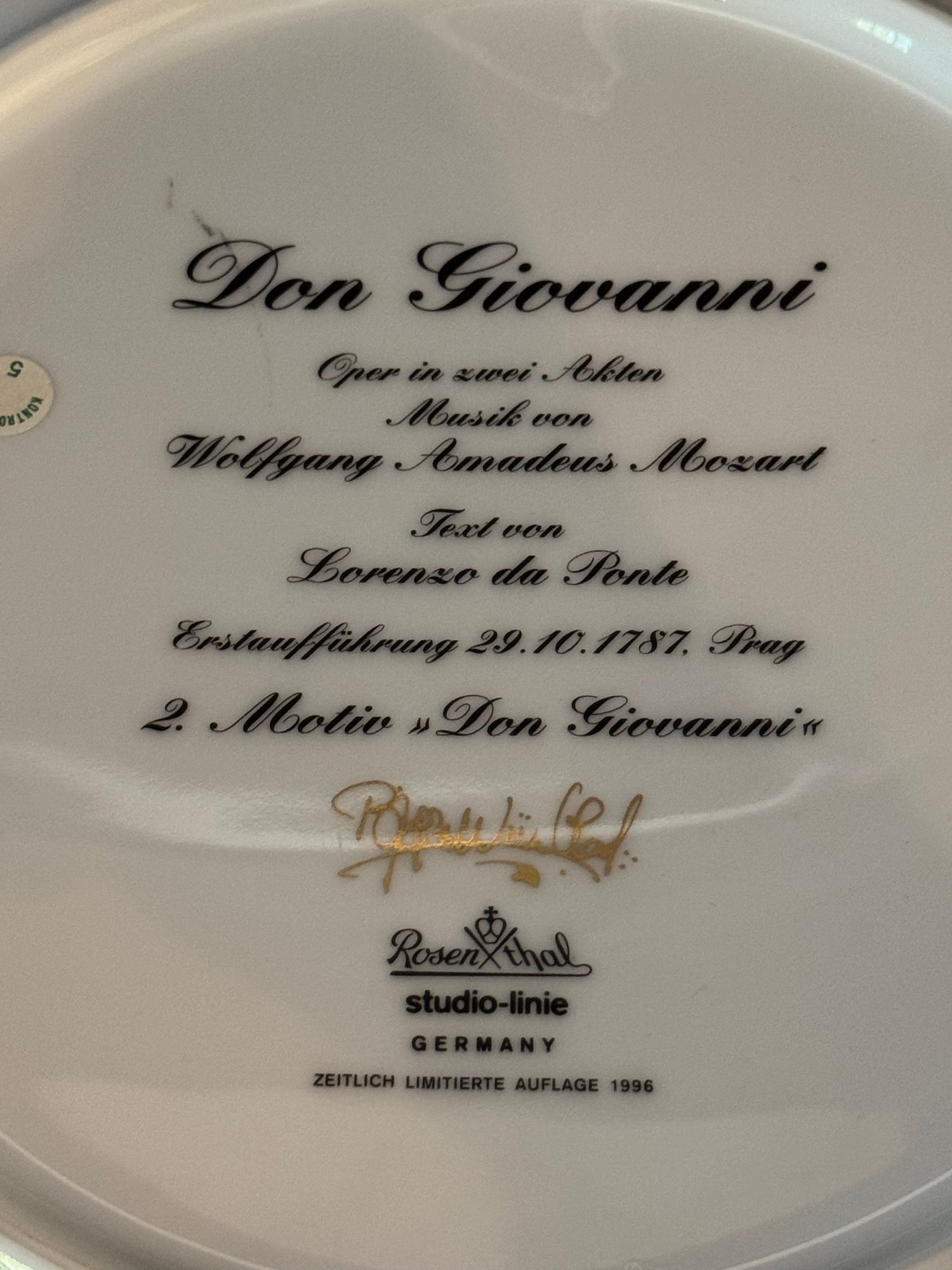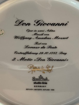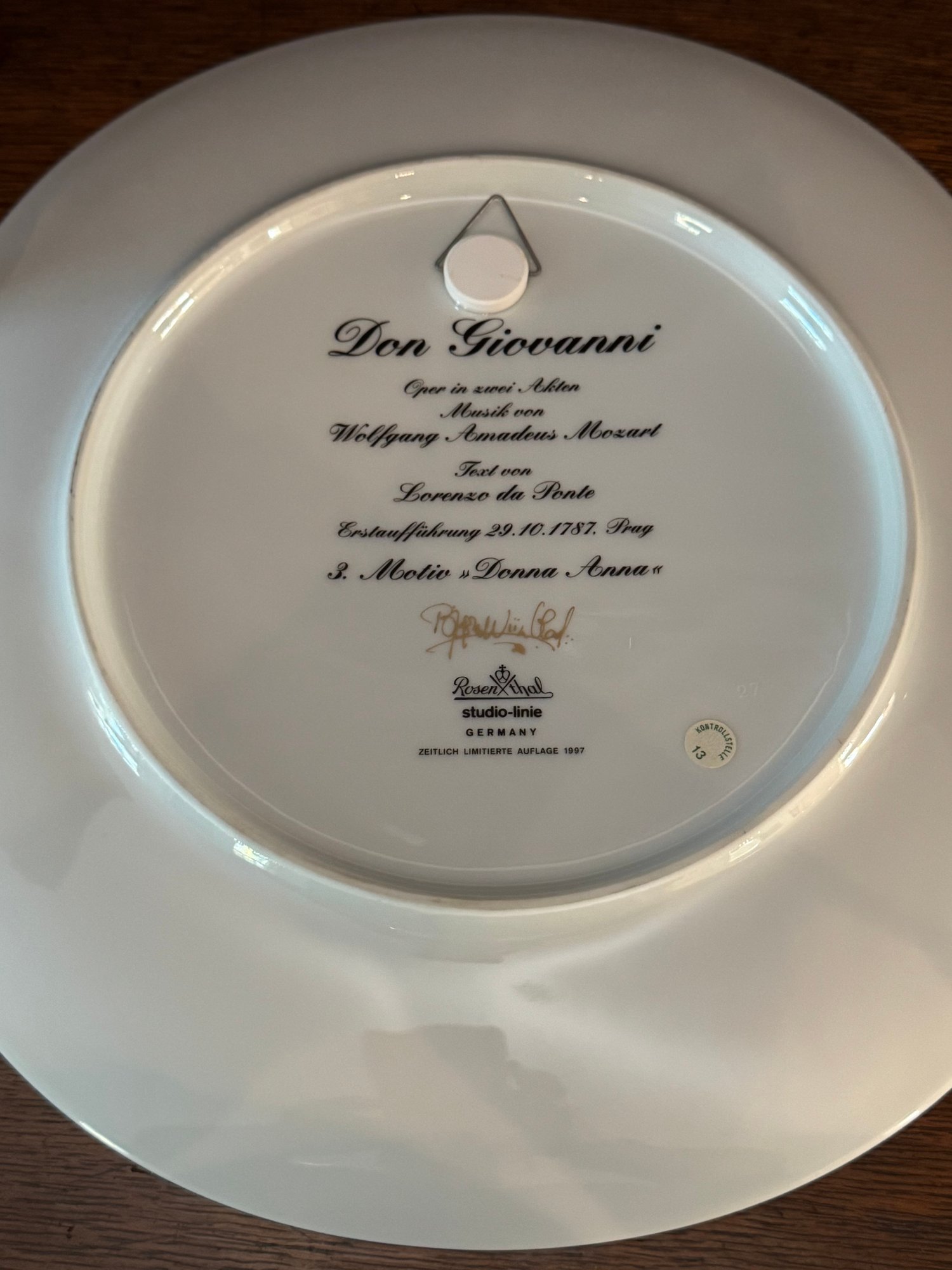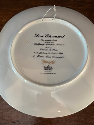 Pair of Studio-Linie Germany BJORN WIINBLAD porcelain plates depicting Wolfgang Amadeus Mozart's opera Don Giovanni, Motif No. 1, Donna Elvira & Motif No 2, Don Giovanni. They come with their original boxes and are in almost new condition. Absolutely charming, colorful eye candy decor! Size 12 H x 11 W