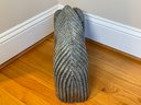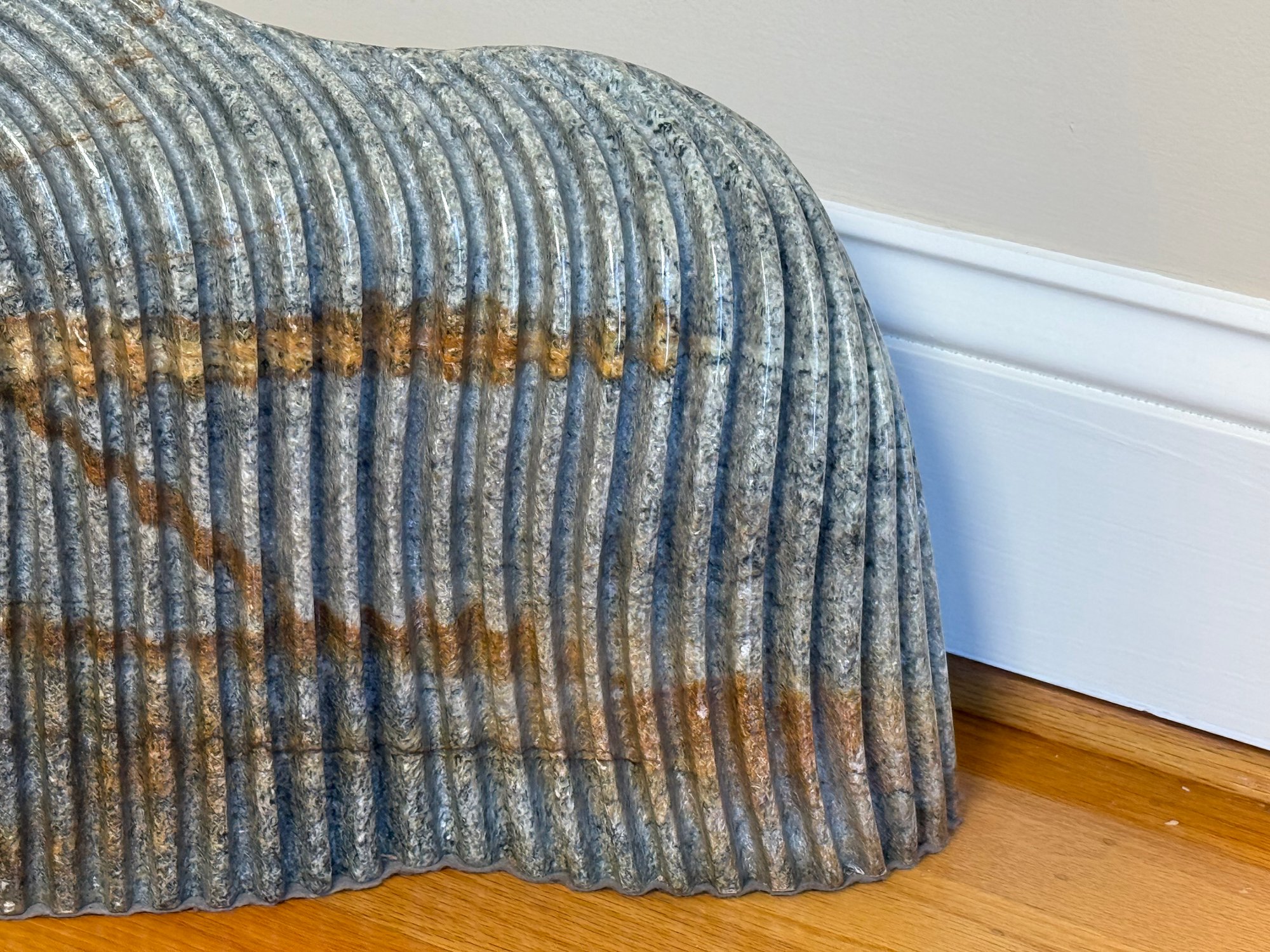 There is what appears to be a line running across side that we didn’t notice in person but notice in photos, perhaps just a natural line from the stone, the piece is in tact.