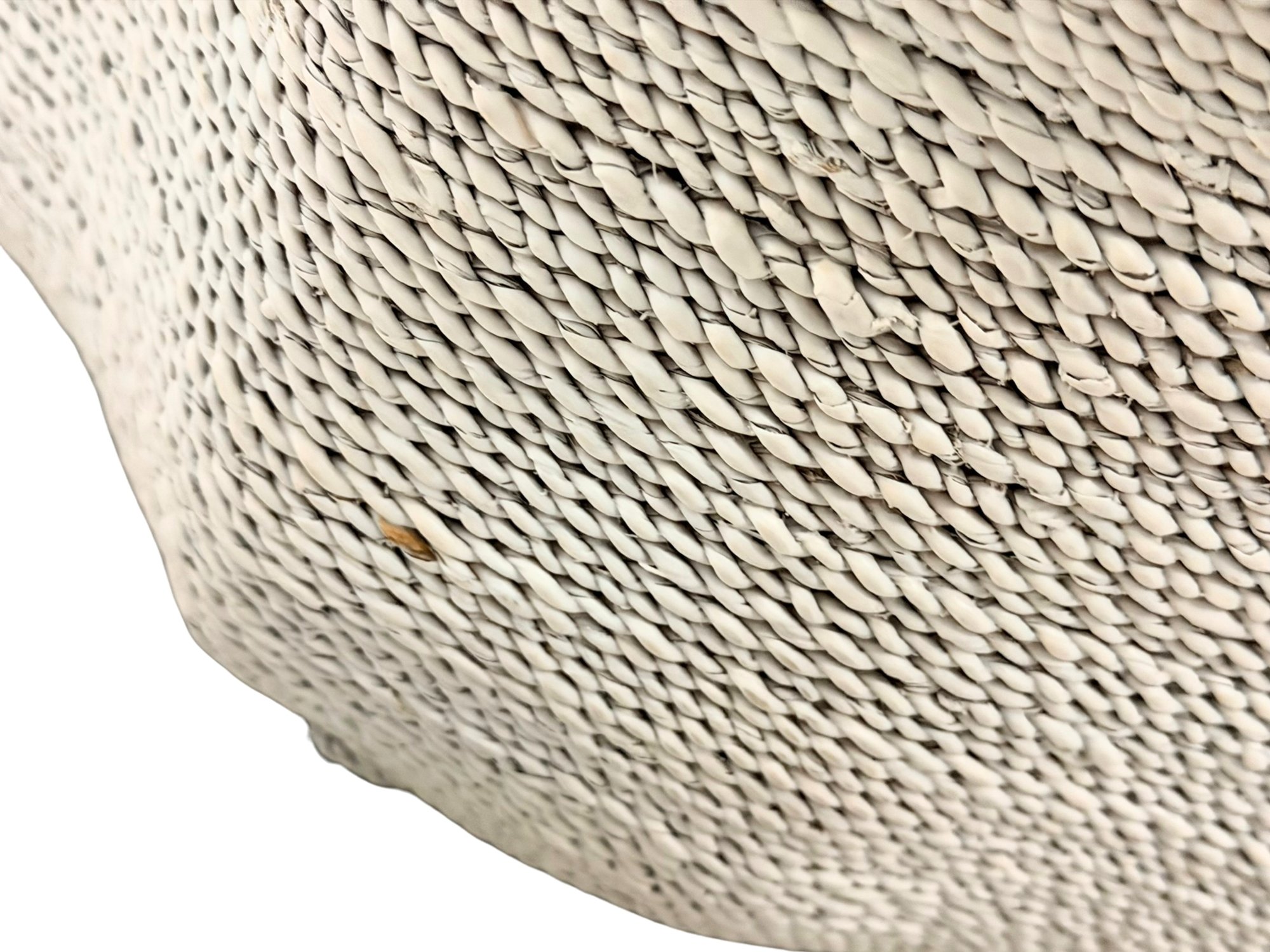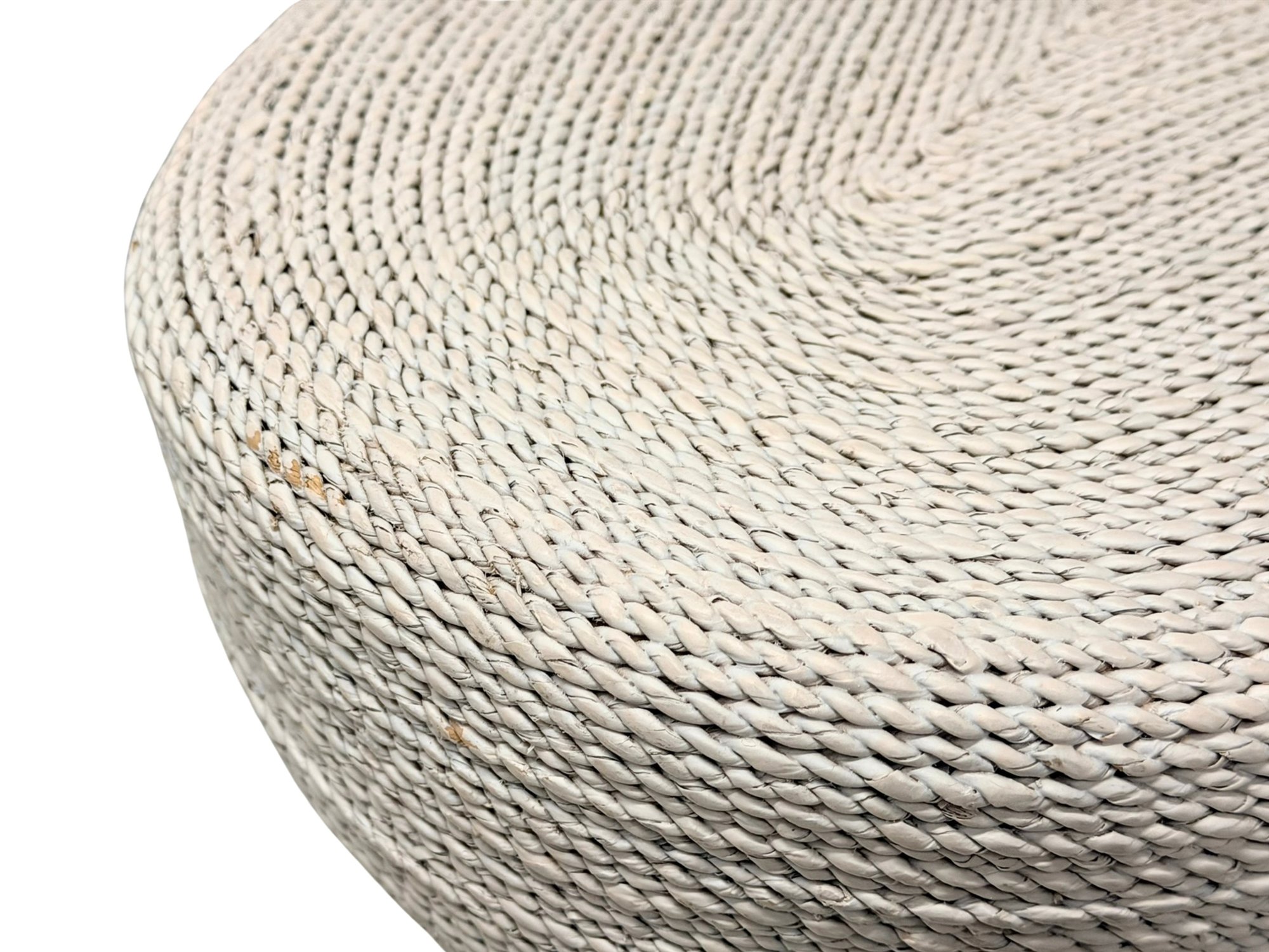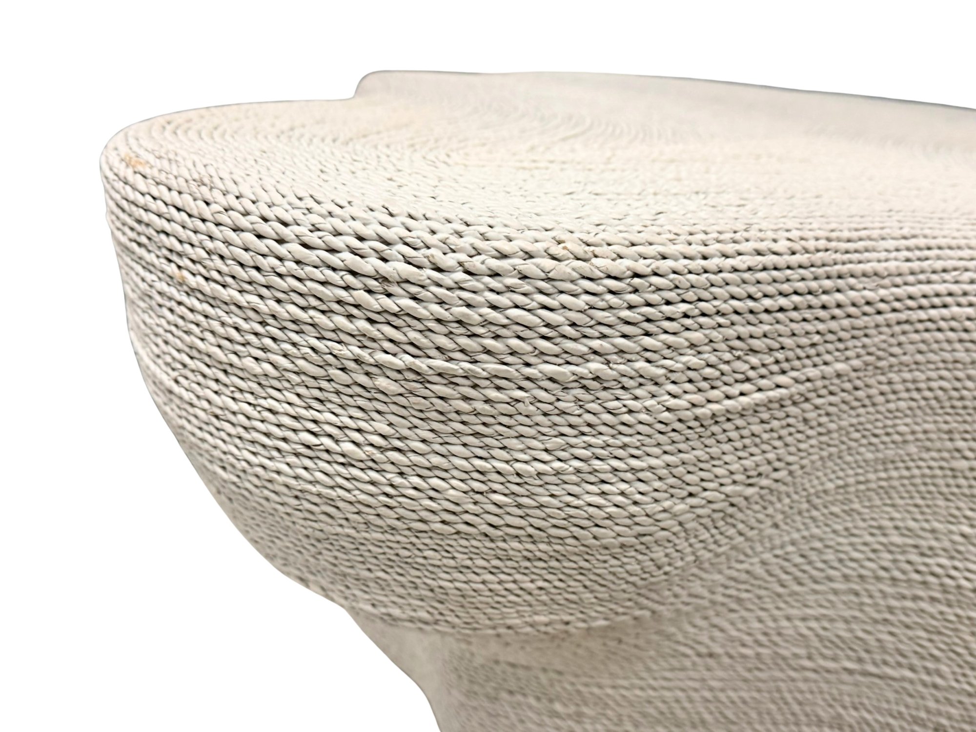 Striking contemporary coffee table with an abstract, biomorphic form, expertly crafted with hand-woven lampakanay rope in a white-wash finish over a metal frame and hardwood top. The piece blends natural materials with modern design, offering both texture and visual interest.