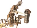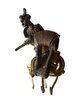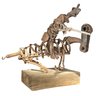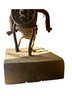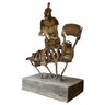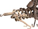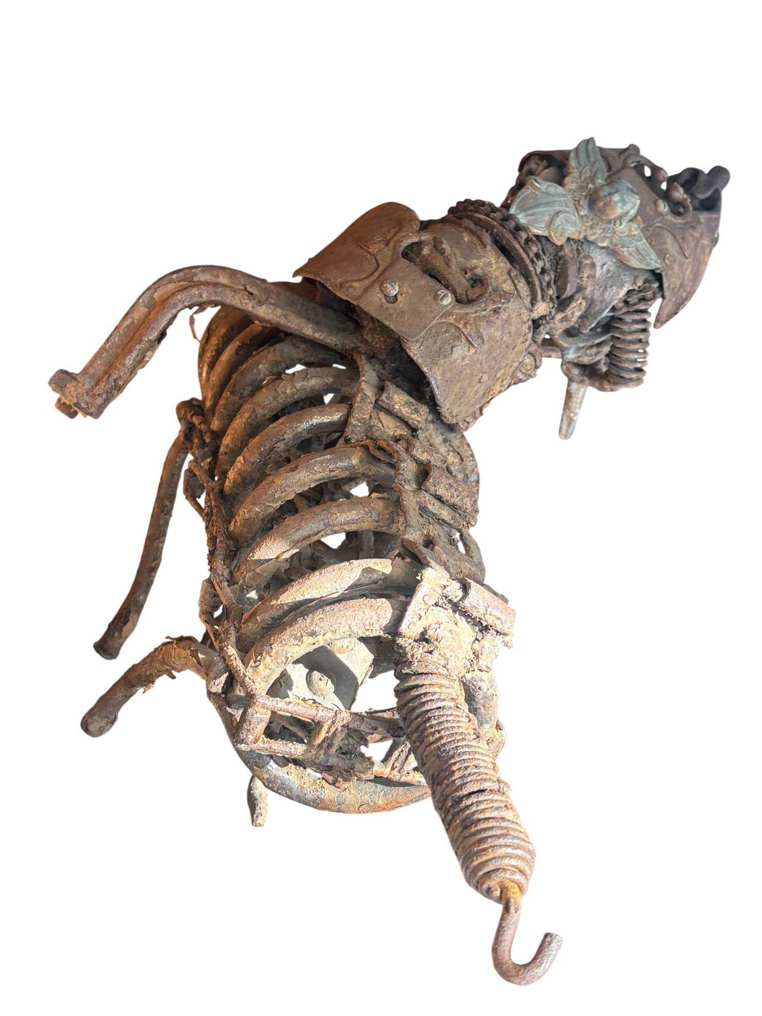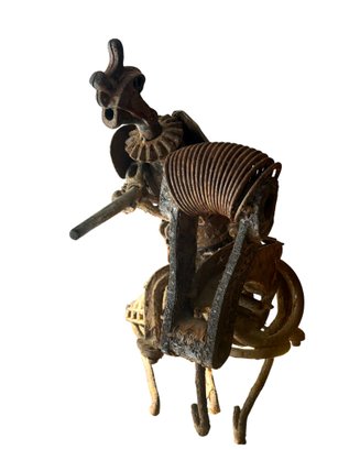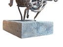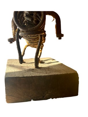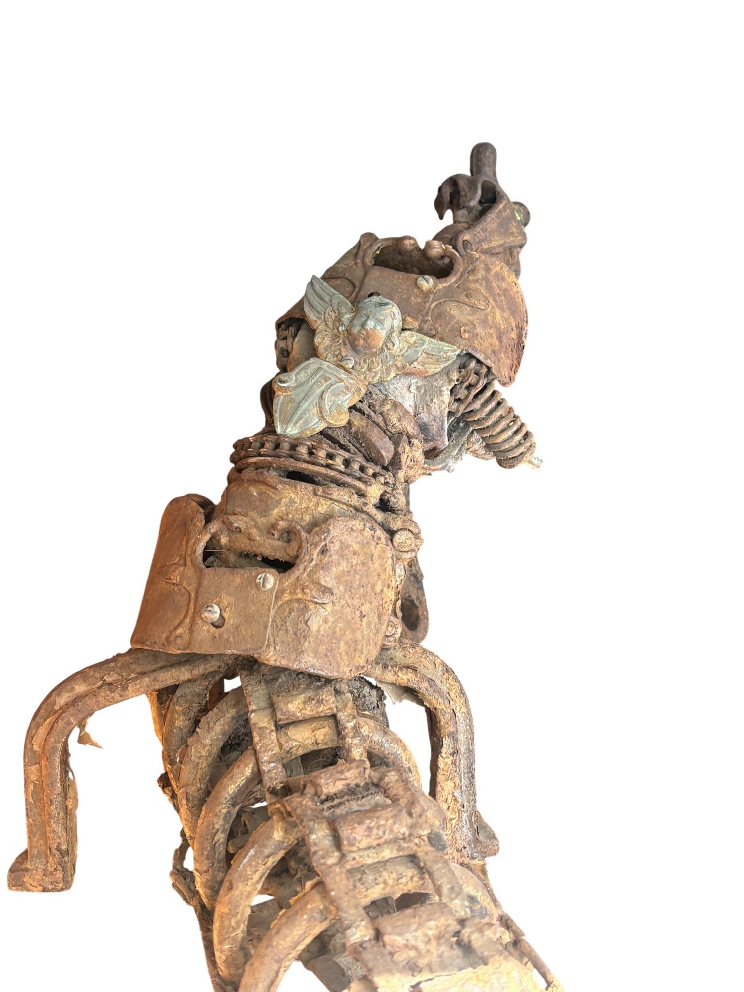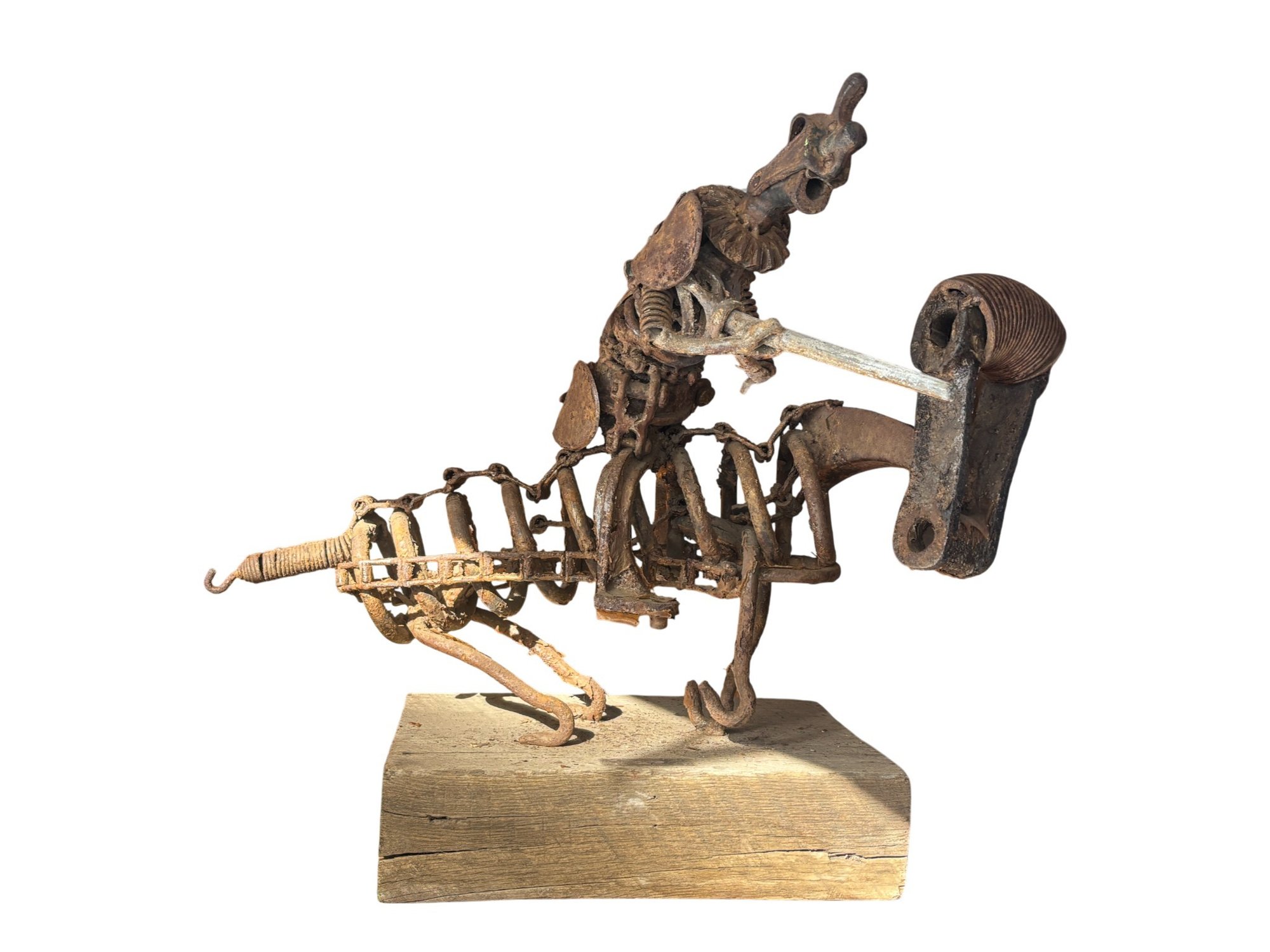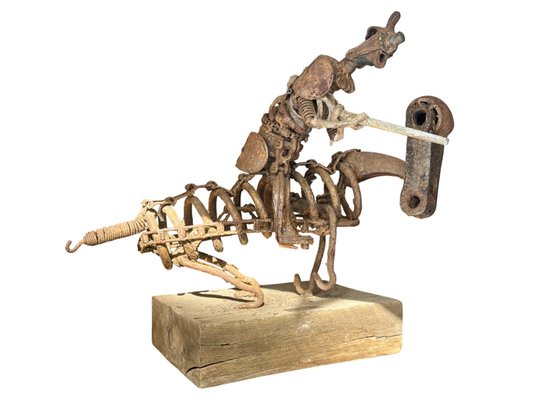 The artist’s use of reclaimed materials gives the piece depth, texture, and a raw honesty—each component visibly intentional, from the ribbed torso to the articulated limbs and lance. Mounted on a substantial wood base, the sculpture commands presence and reads equally well as contemporary art, outsider sculpture, or collectible industrial folk art.