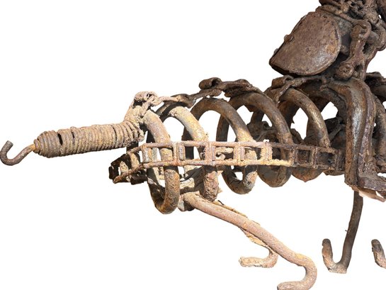 A powerful, exhibition-worthy statement sculpture depicting Don Quixote, masterfully assembled from salvaged metal, springs, coils, and found industrial elements. The skeletal horse and armored rider are rendered with striking movement and tension, evoking both medieval myth and modern brutalist aesthetics.