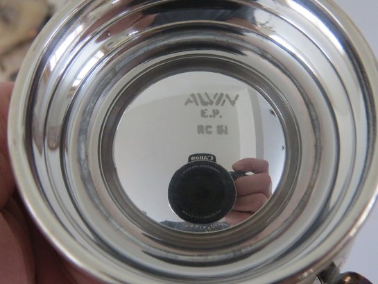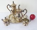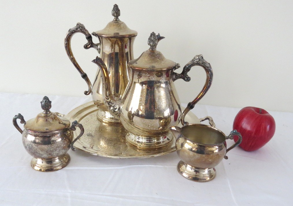 A 5 piece set by Alvin Electroplate that includes coffee pot, teapot, creamer and covered sugar plus undertray, all silverplated. Light tarnish but otherwise in good shape, mid-century era.