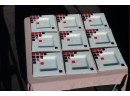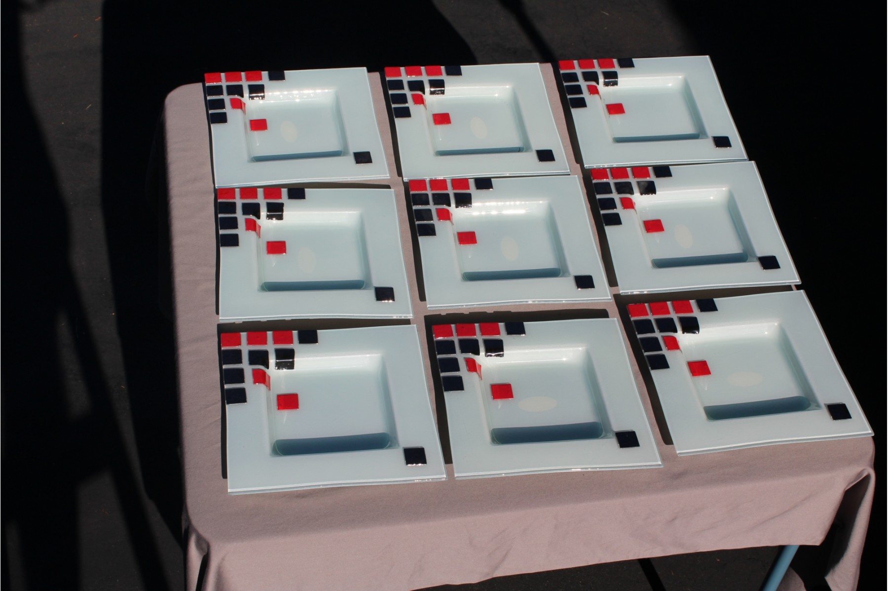 Again these are hand-blown plates if you see the glass squares they are not always lined up exactly. Fantastic set for a larger dinner party. Some scratches can be seen on some plates but overall they are really amazing pieces. The dinner plates are 10" diameter, the salad plates are 8.5".
