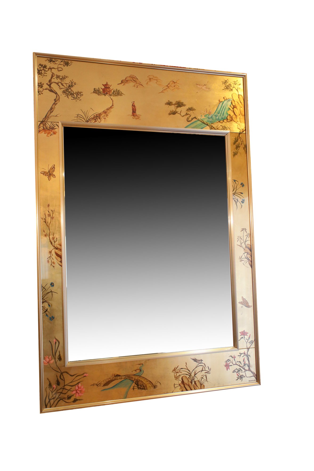 A finely detailed wall mirror having a ridged brass frame and expressive hand painted chinoiserie decoration, signed by the artist. 2 of 3 in the sale