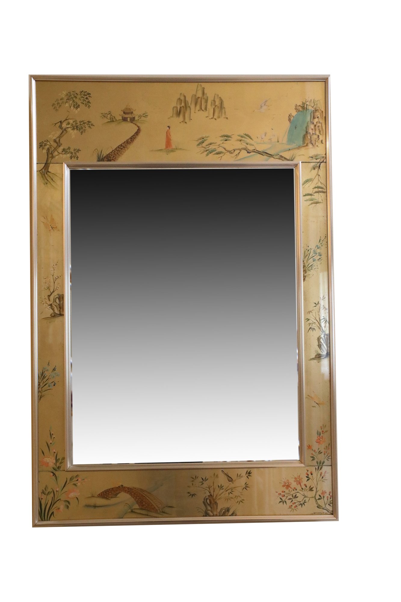 A finely detailed wall mirror having a ridged brass frame and expressive hand painted chinoiserie decoration, signed by the artist.