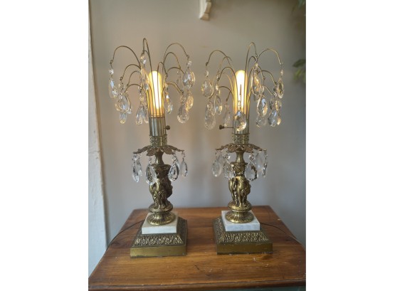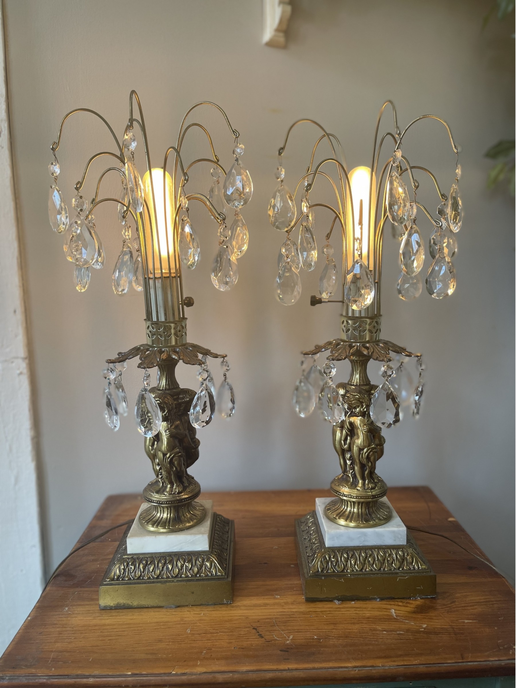 These are a stunning pair of vintage parlor lamps with spelter cast cherubs & marble as the base. Zoom in to see all the amazing details throughout. The base for each is a 5.5 inch square and they sit 21 inches tall. Check out the next lot with a matching center crystal bowl, lot 22.