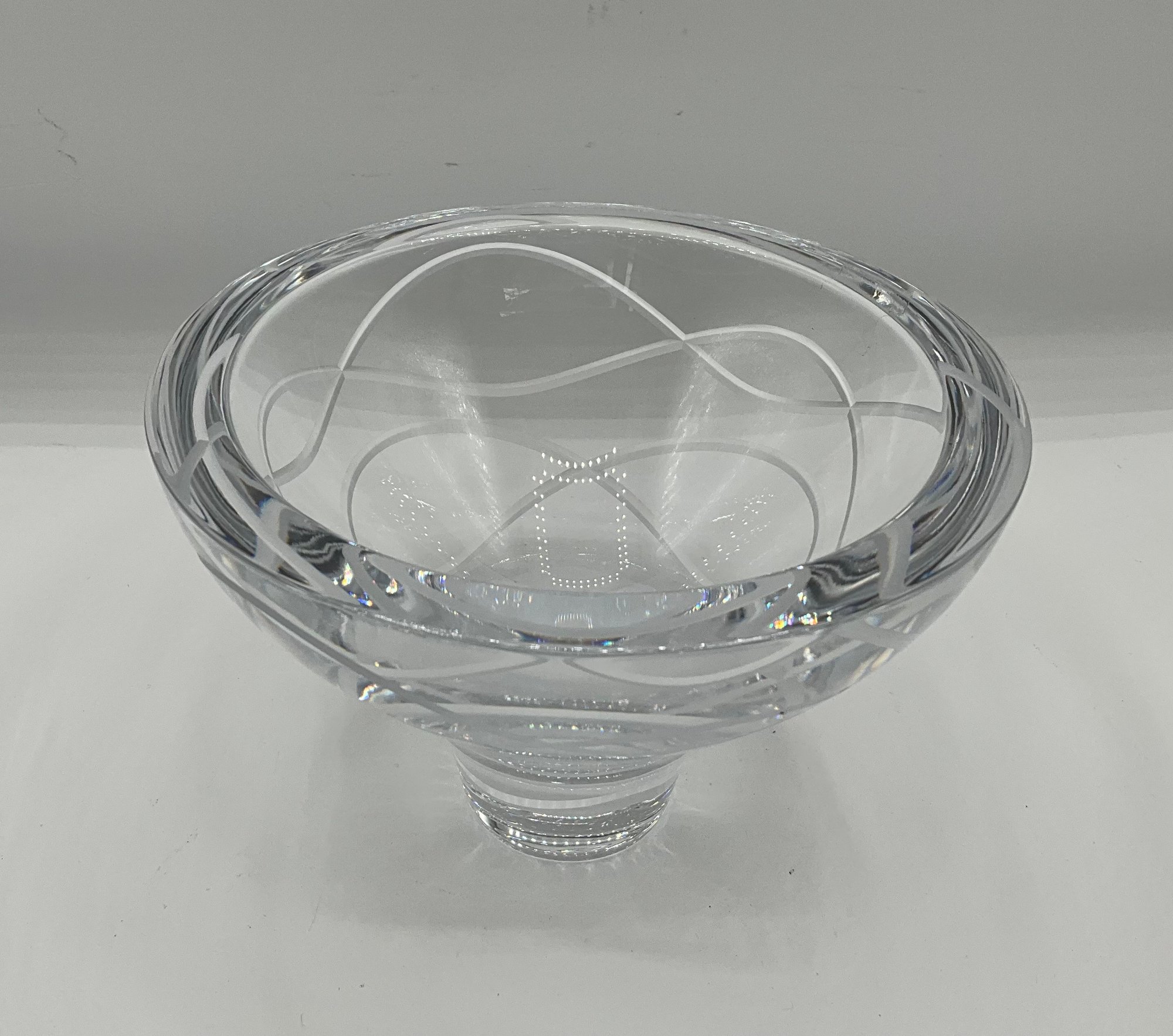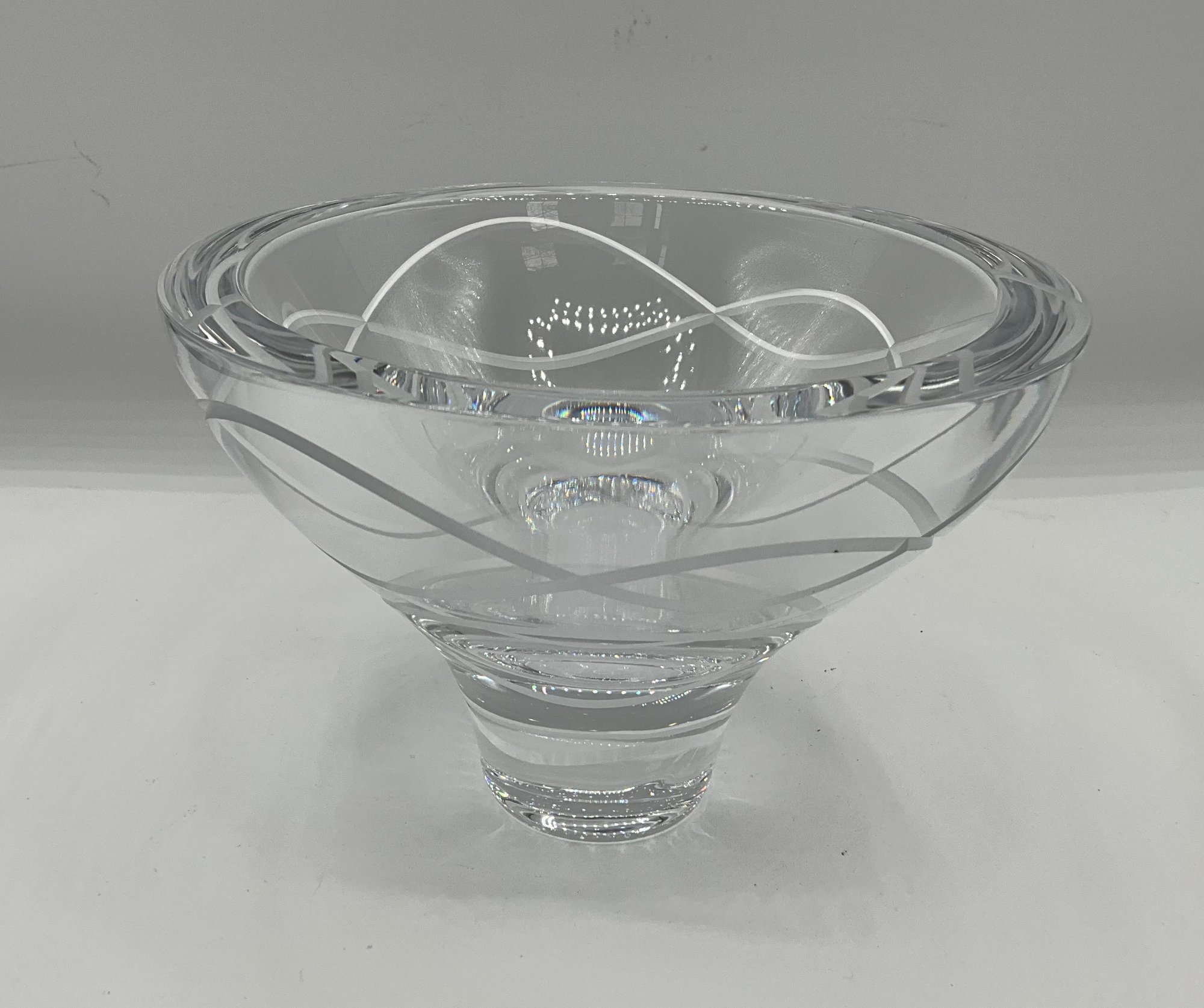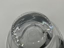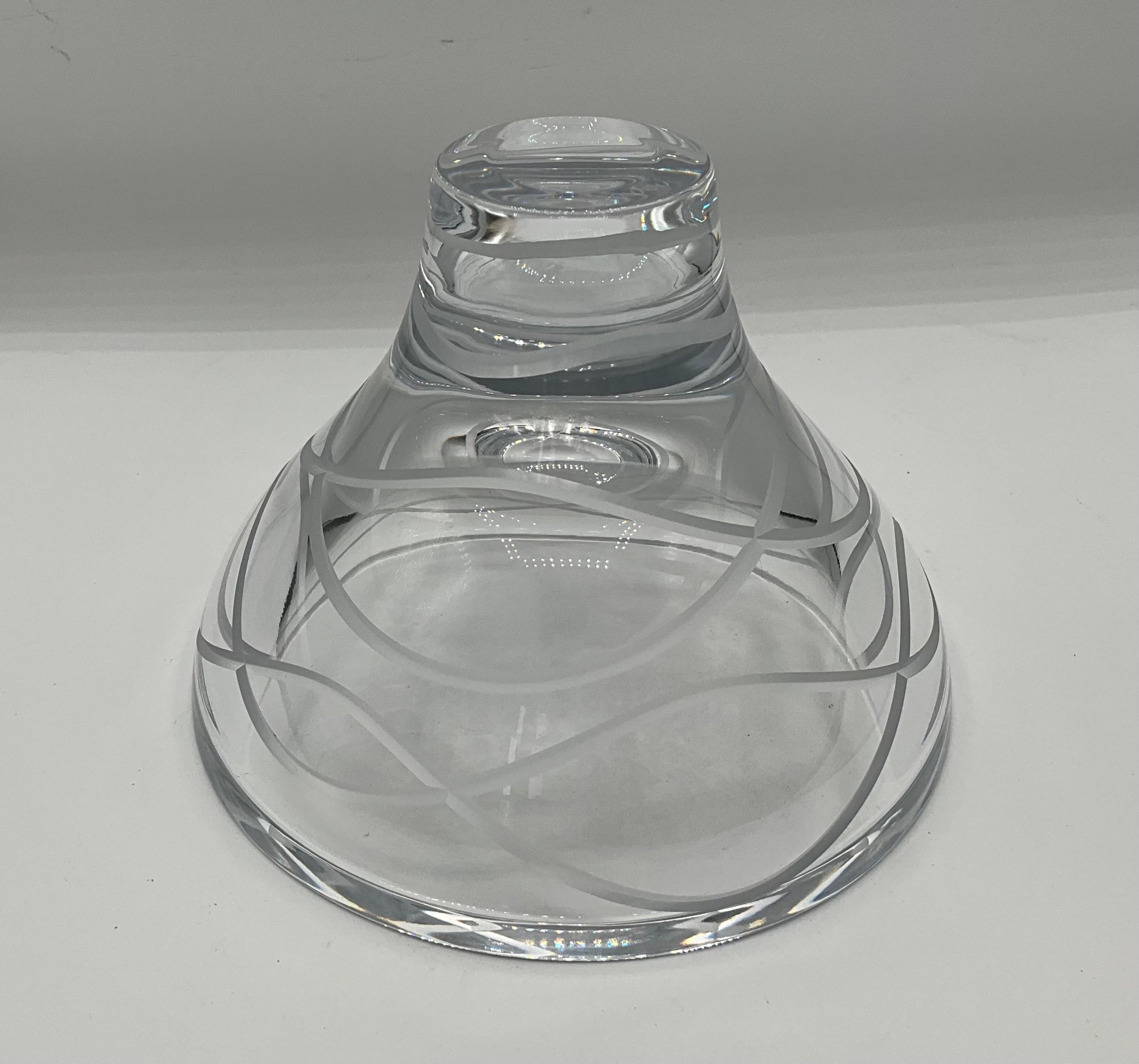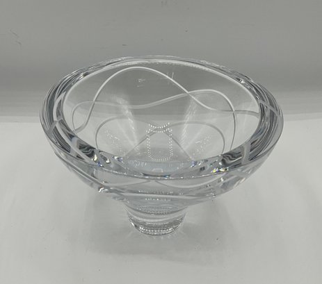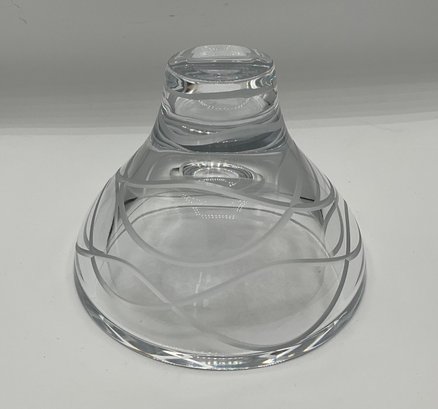 Authentic Nambé crystal pedestal bowl featuring a sleek modern profile with elegant frosted etched swirl detailing encircling the body. Crafted from heavy, high-quality clear crystal with a thick stepped pedestal base.