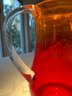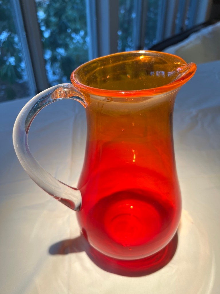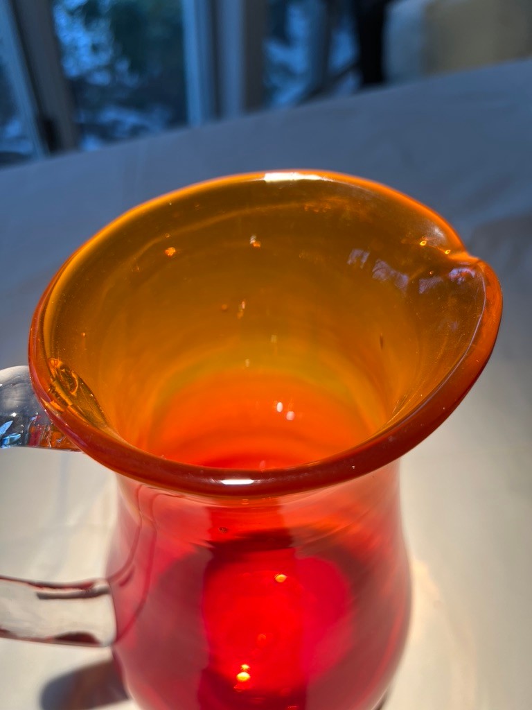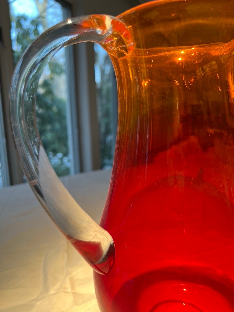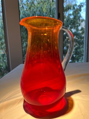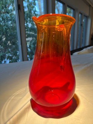 This is a vintage hand-blown amberina art glass pitcher, Blenko 2511DP Diamond Optic Pitcher in tangerine and red.