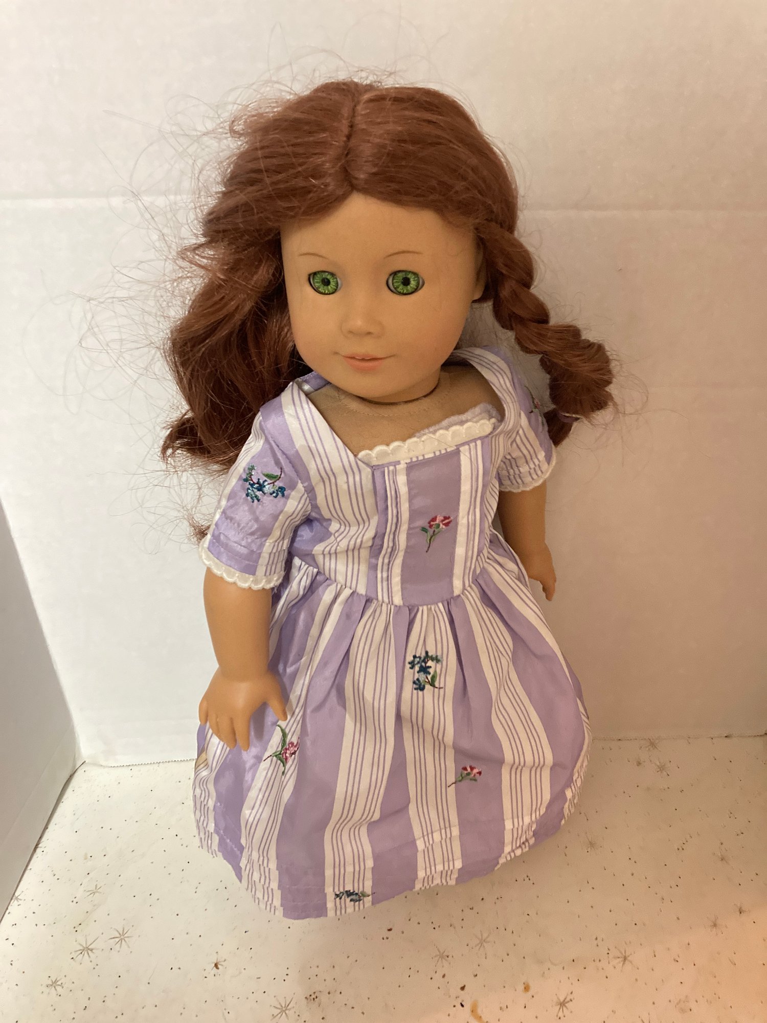 not sure of her name, has bright green eyes comes with outfit , pleasant company on dolls neck
