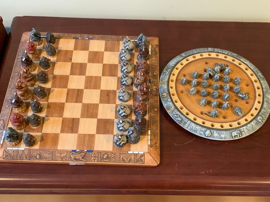 The second game is made by Kumbula Mouldings in Africa - info we found online: Also called marble solitaire, our peg solitaire sets are some of our best sellers as they are beautiful, affordable and require little display space. The board has a frame boasting intricately designed African scenes and wildlife. The solitaire pieces are sculpted by hand, cast in polystone and hand-painted.