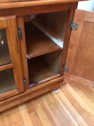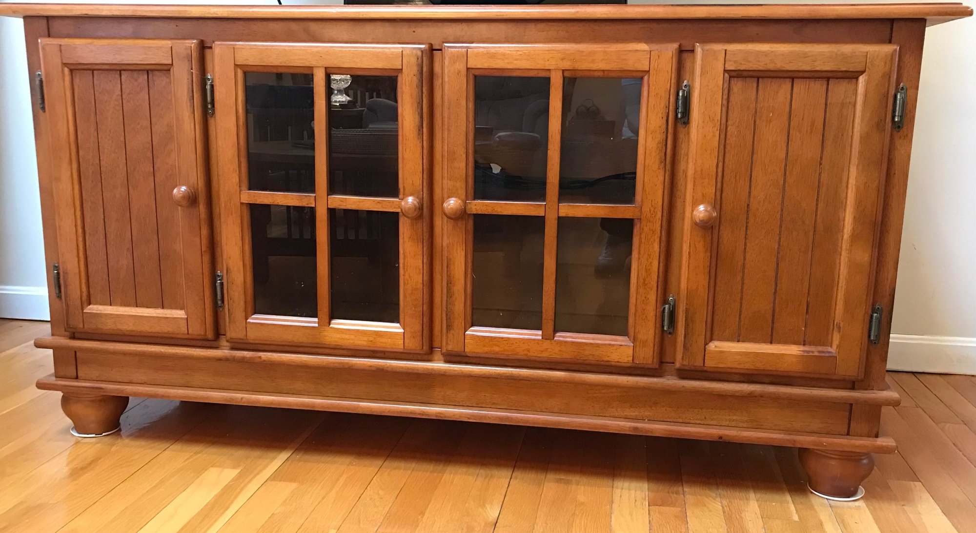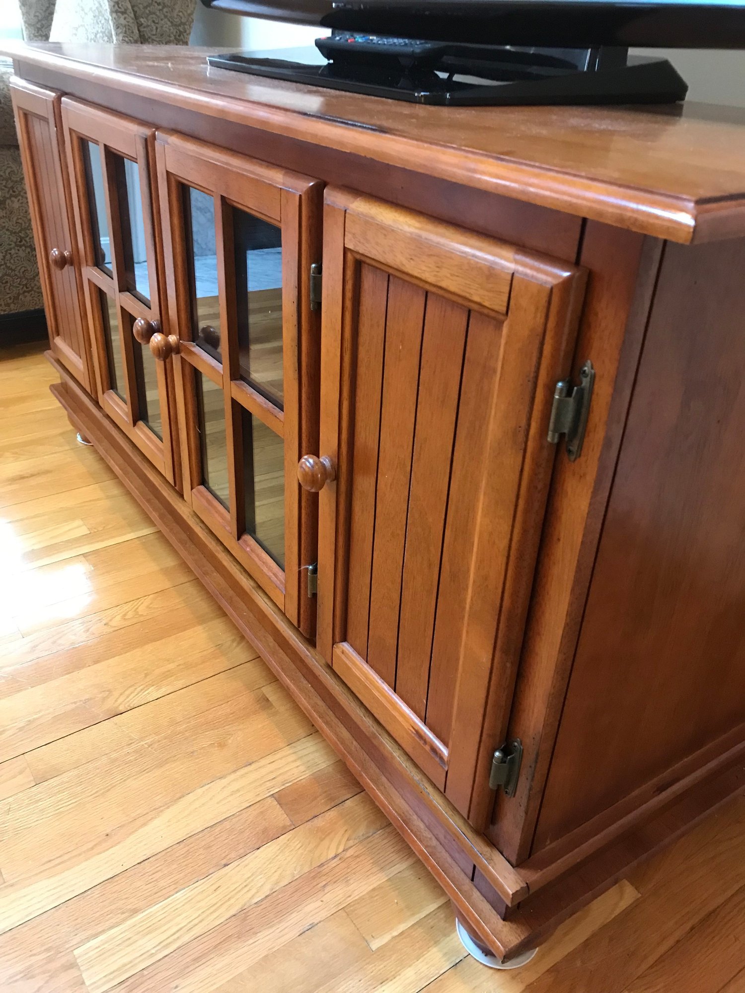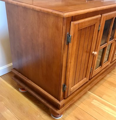 media console by Amesbury Chair features a classic, warm honey finish and versatile storage options. It’s a sturdy, well-crafted piece made in Malaysia, perfect for use as a TV stand, buffet, or entryway sideboard.
