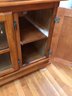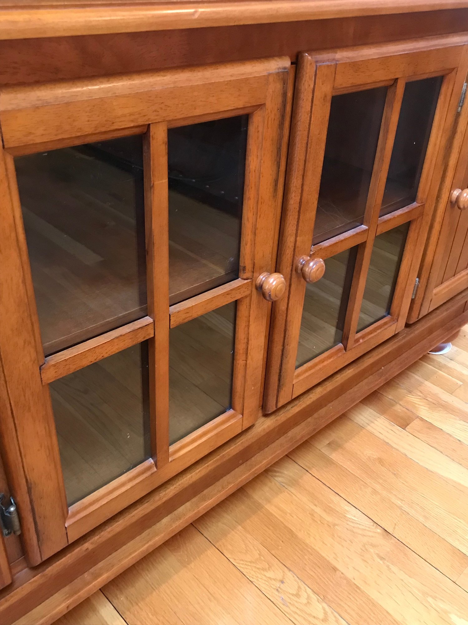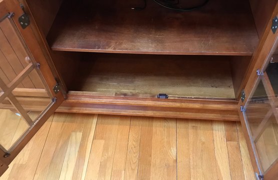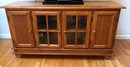 Storage: Two side cabinets with solid wood doors and two central glass-pane doors for easy viewing of electronics or decor.