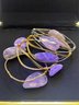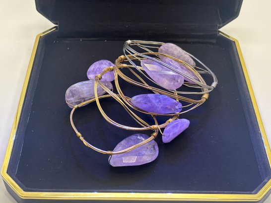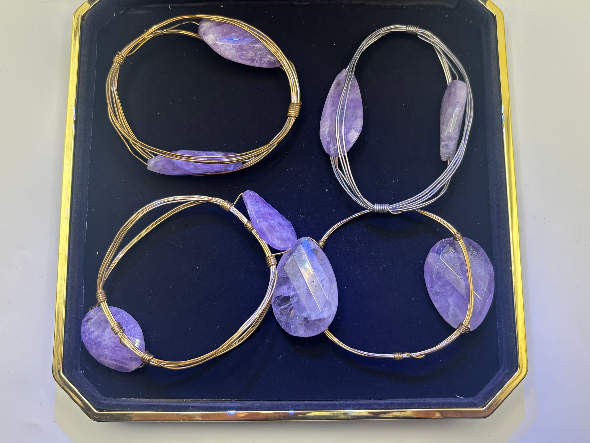 A striking set of four wire-wrapped bangles featuring faceted and polished amethyst stones in rich violet hues. Three are gold-tone wire and one is silver-tone, each designed with an organic, artisan feel. The natural variation in the stones gives every bracelet its own character. Beautiful worn stacked together or mixed individually for a layered look.