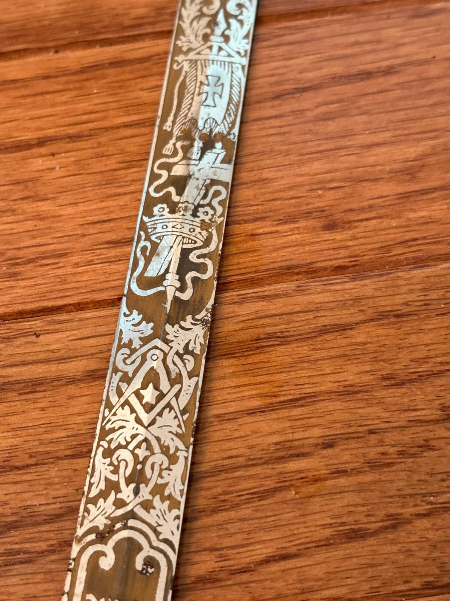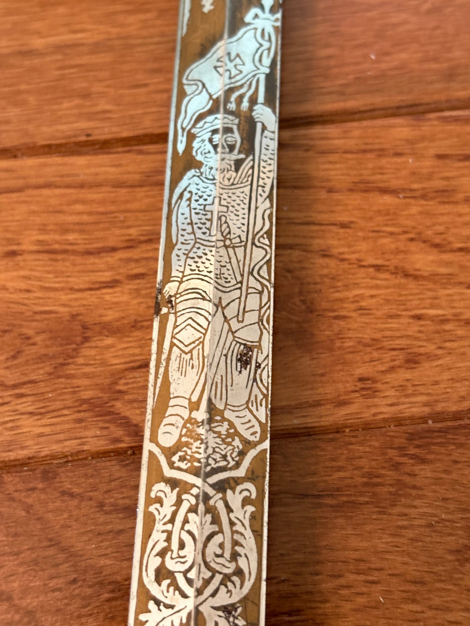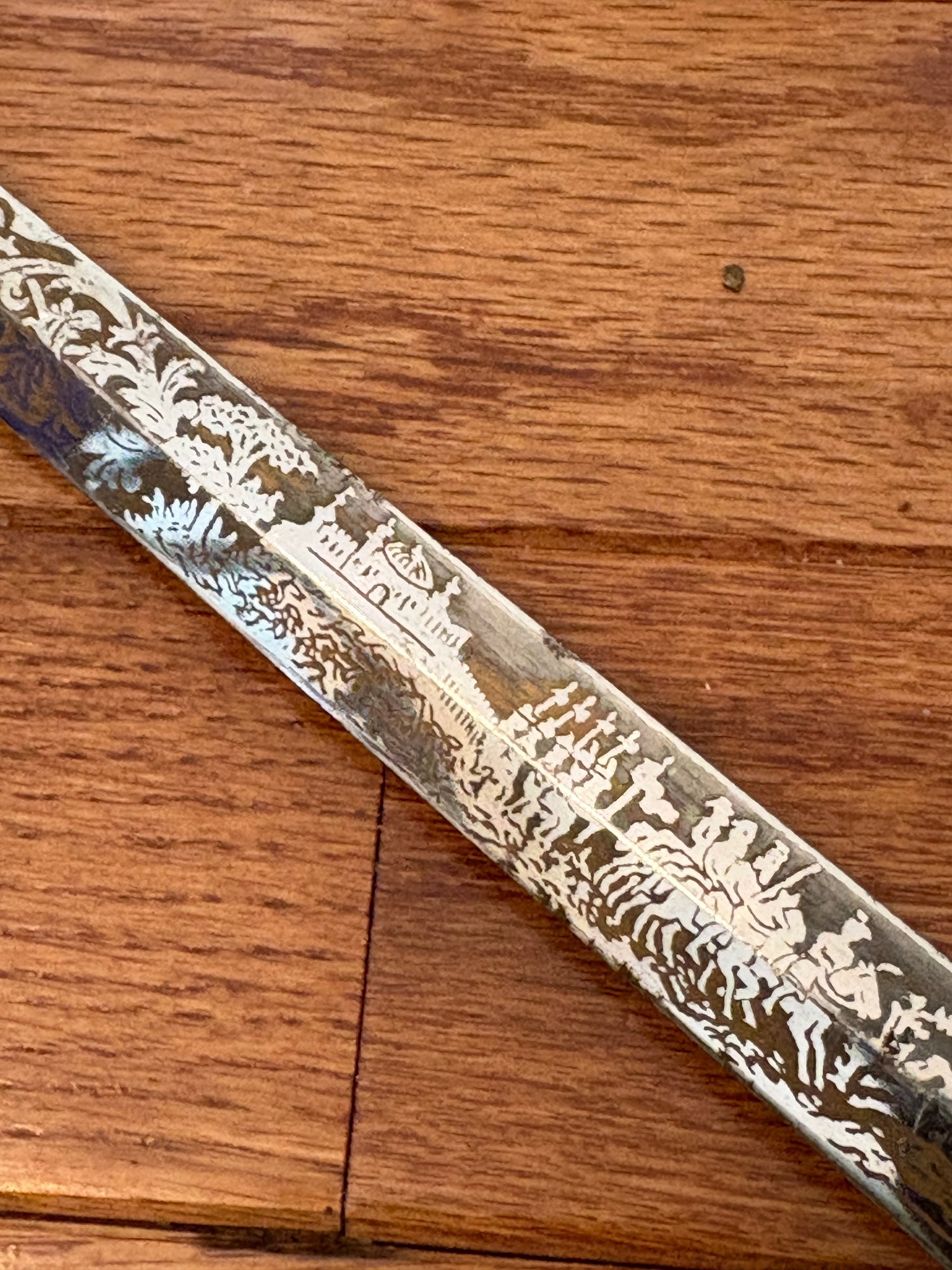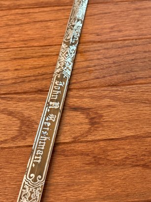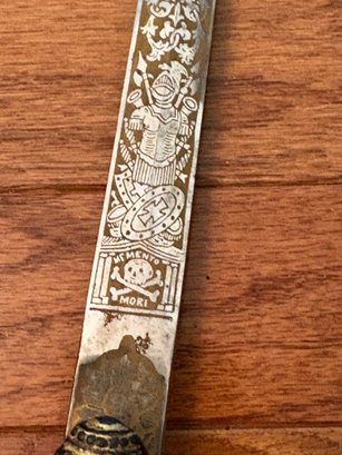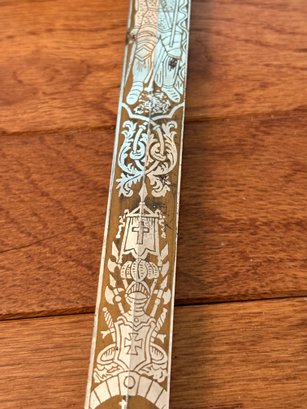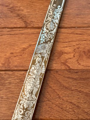 This antique sword featuring captivating etchings . owner name is also on the sword .