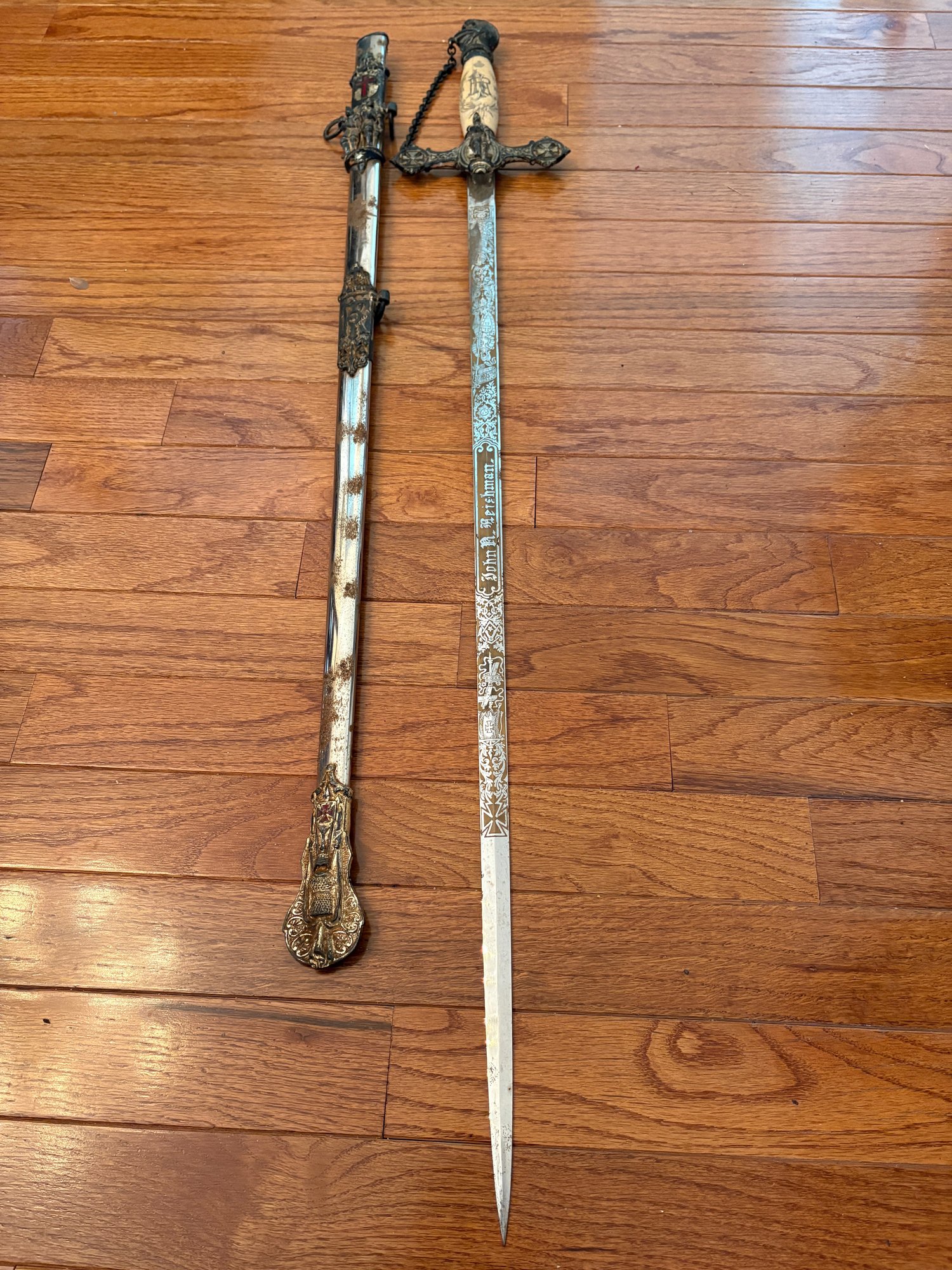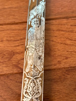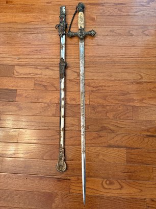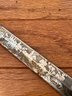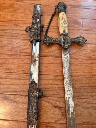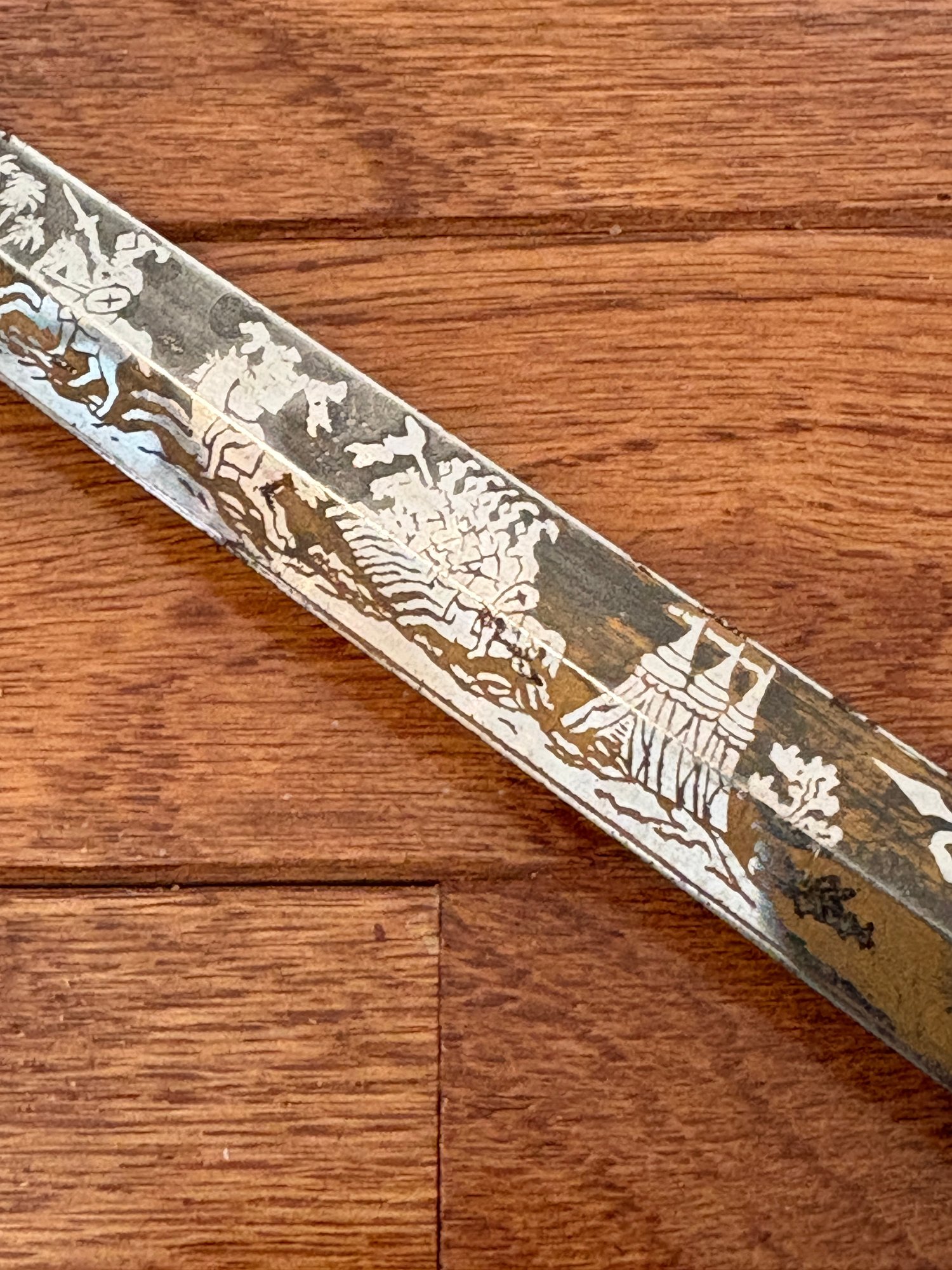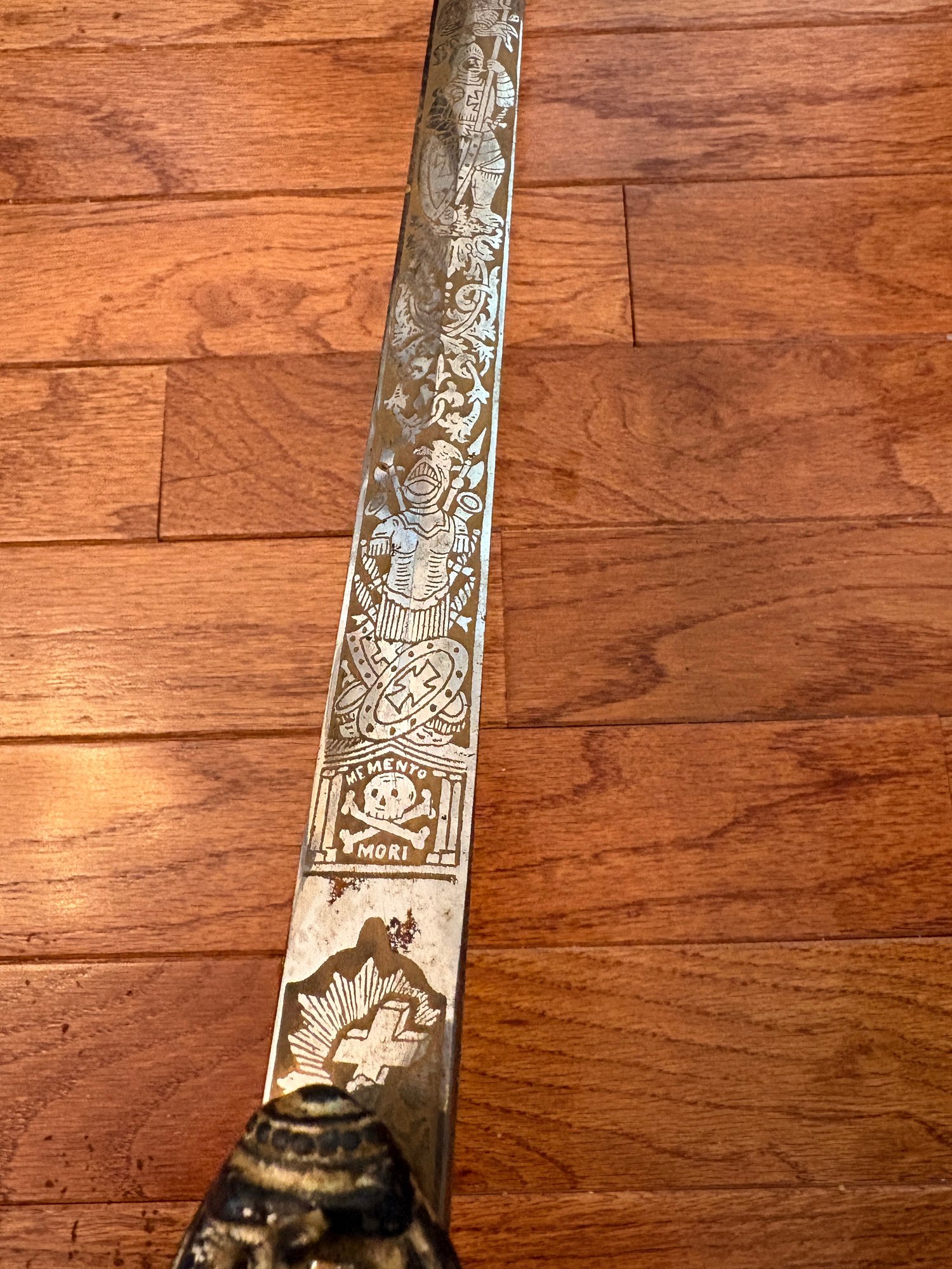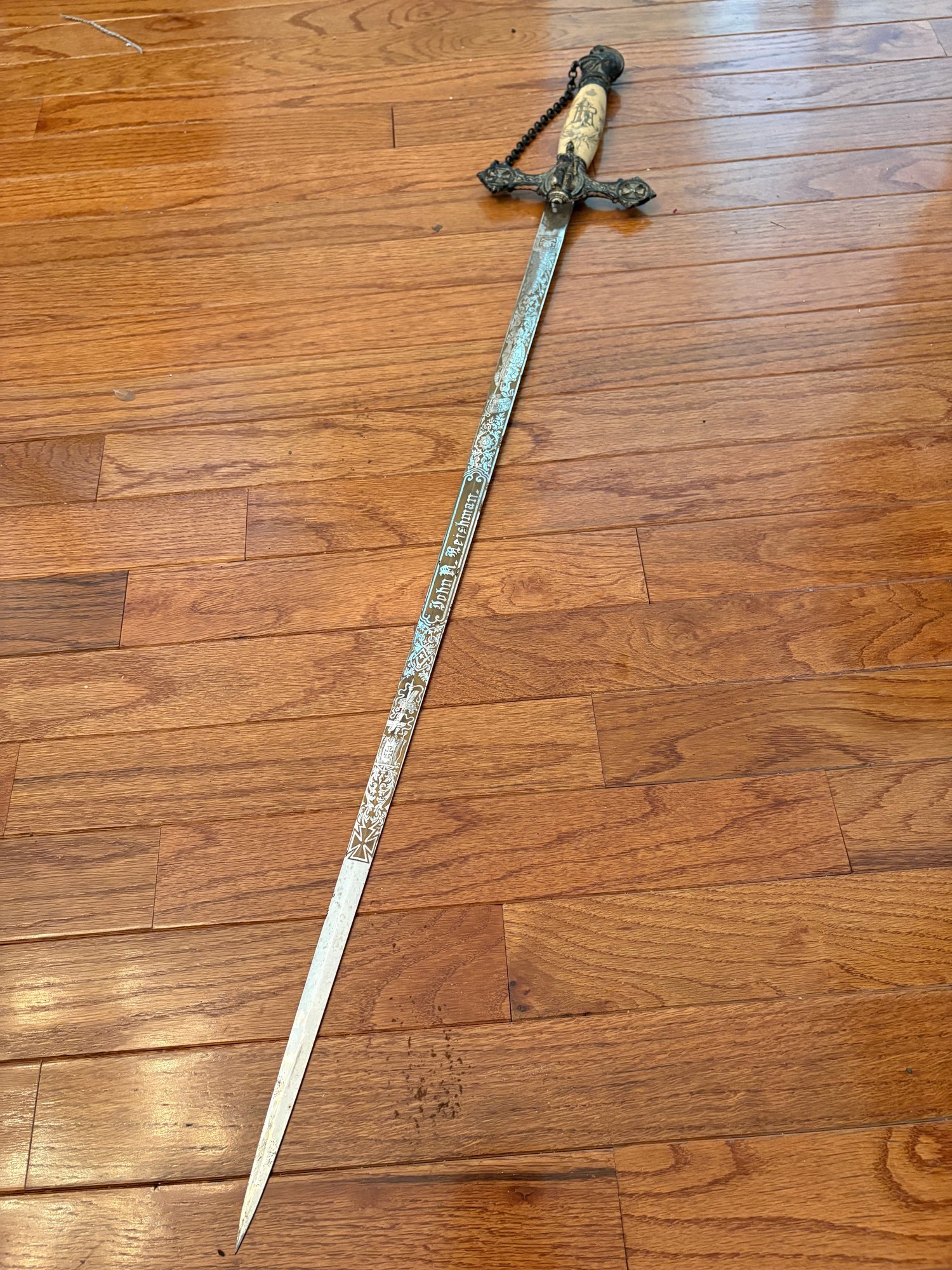 This antique sword featuring captivating etchings . owner name is also on the sword .
