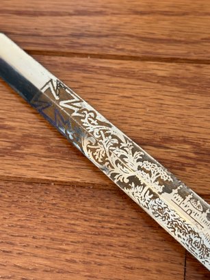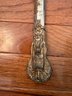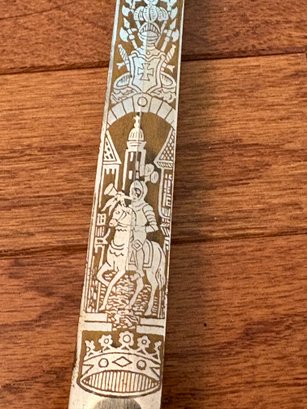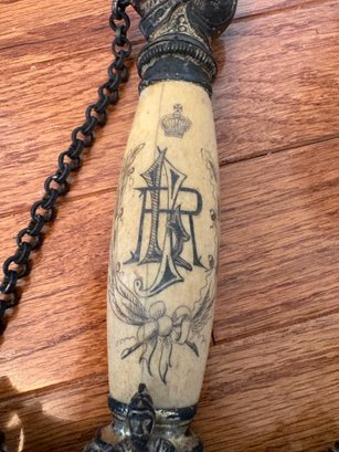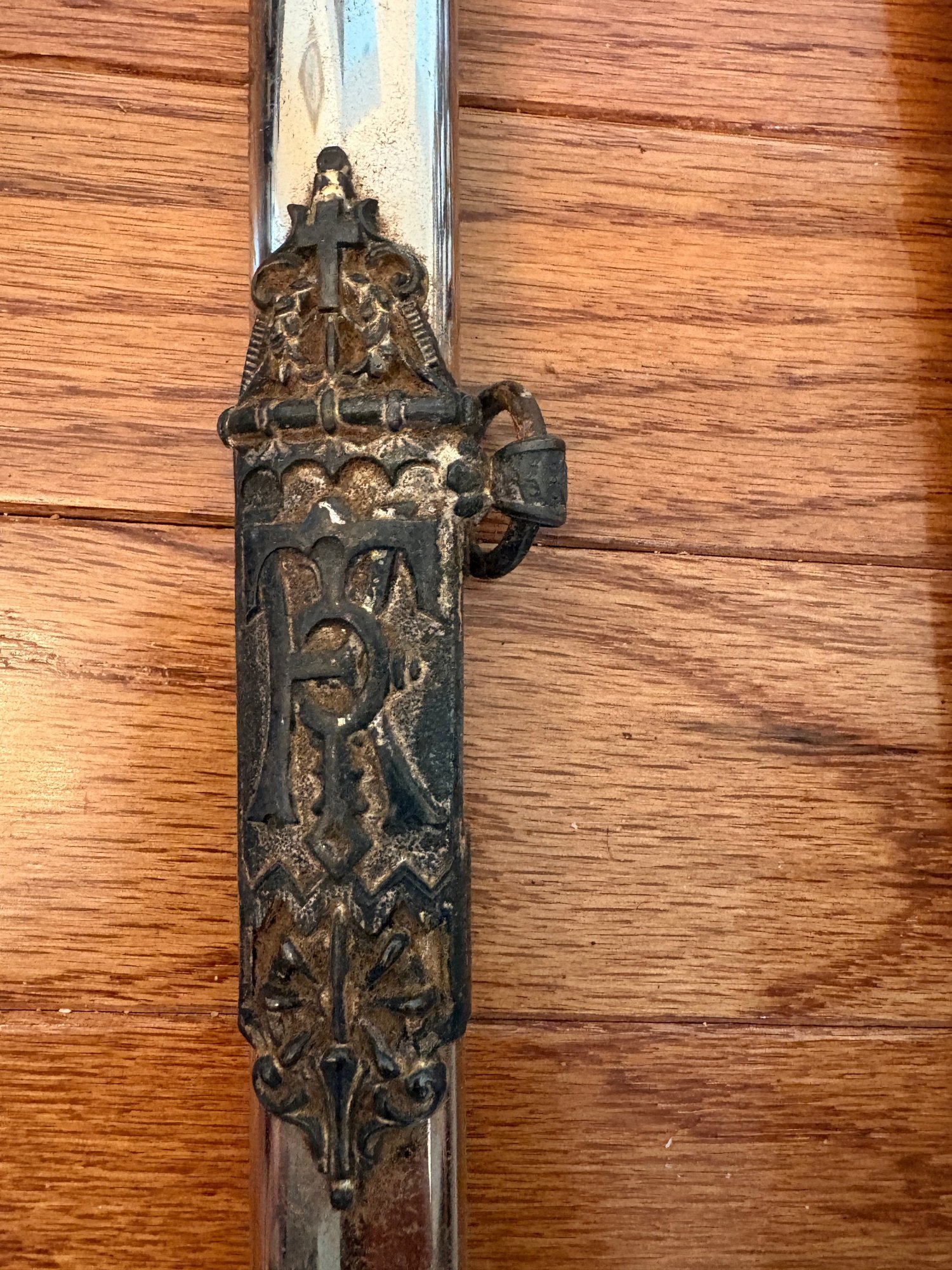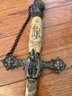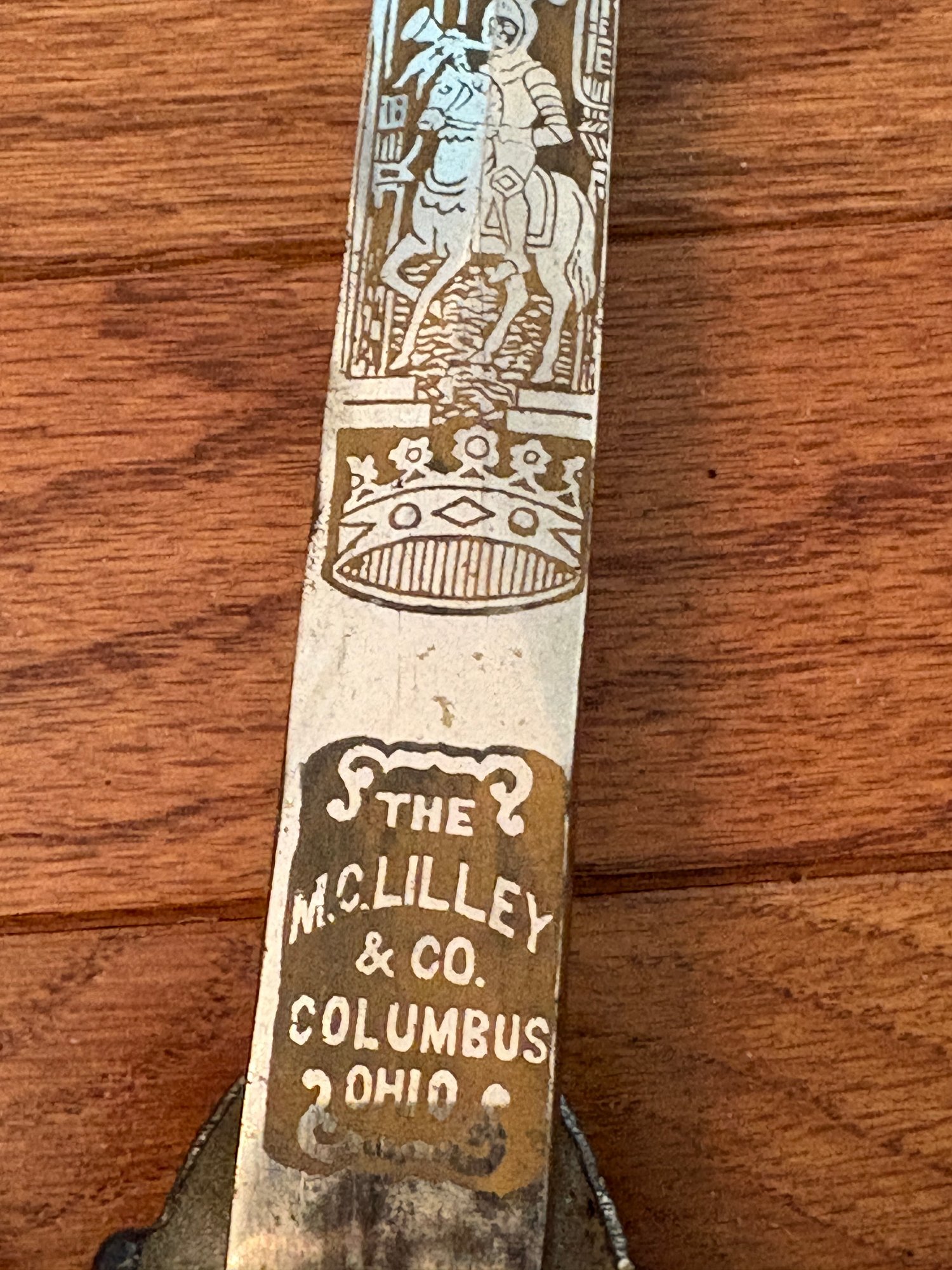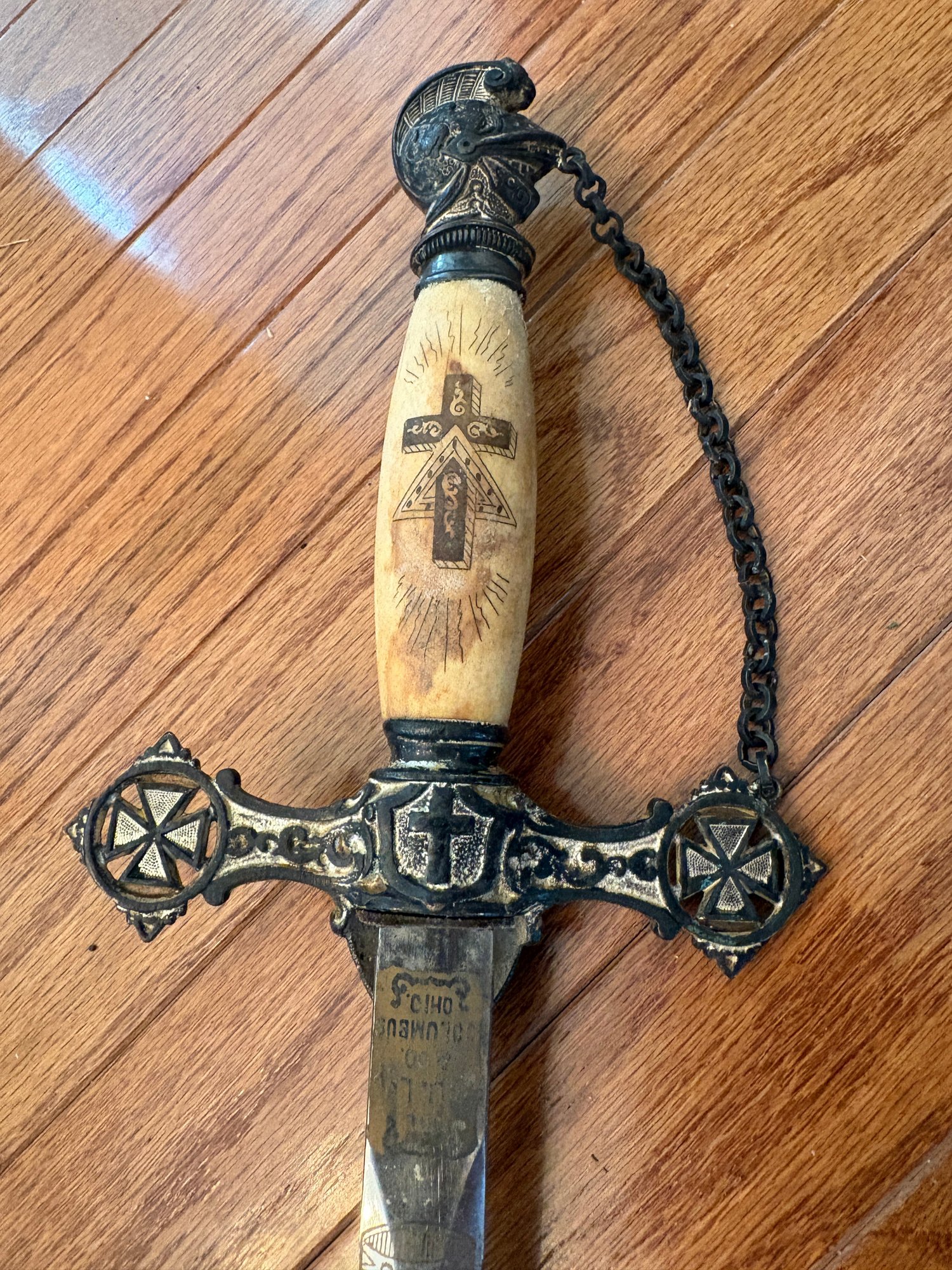 This antique sword featuring captivating etchings . owner name is also on the sword .