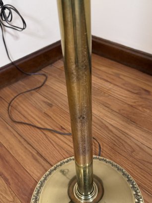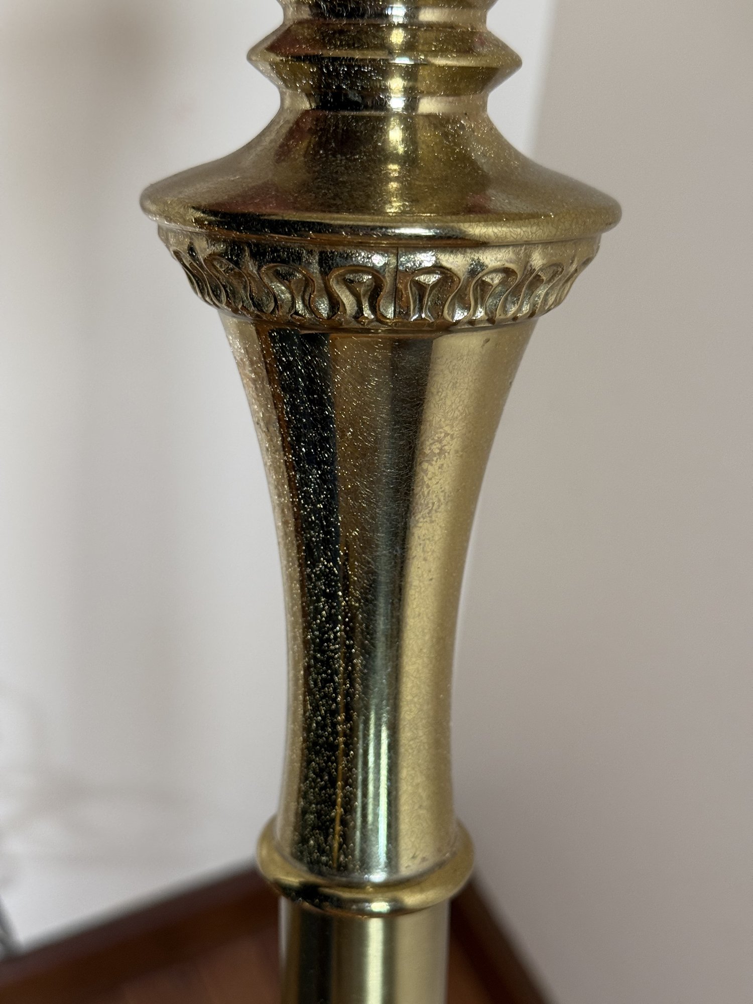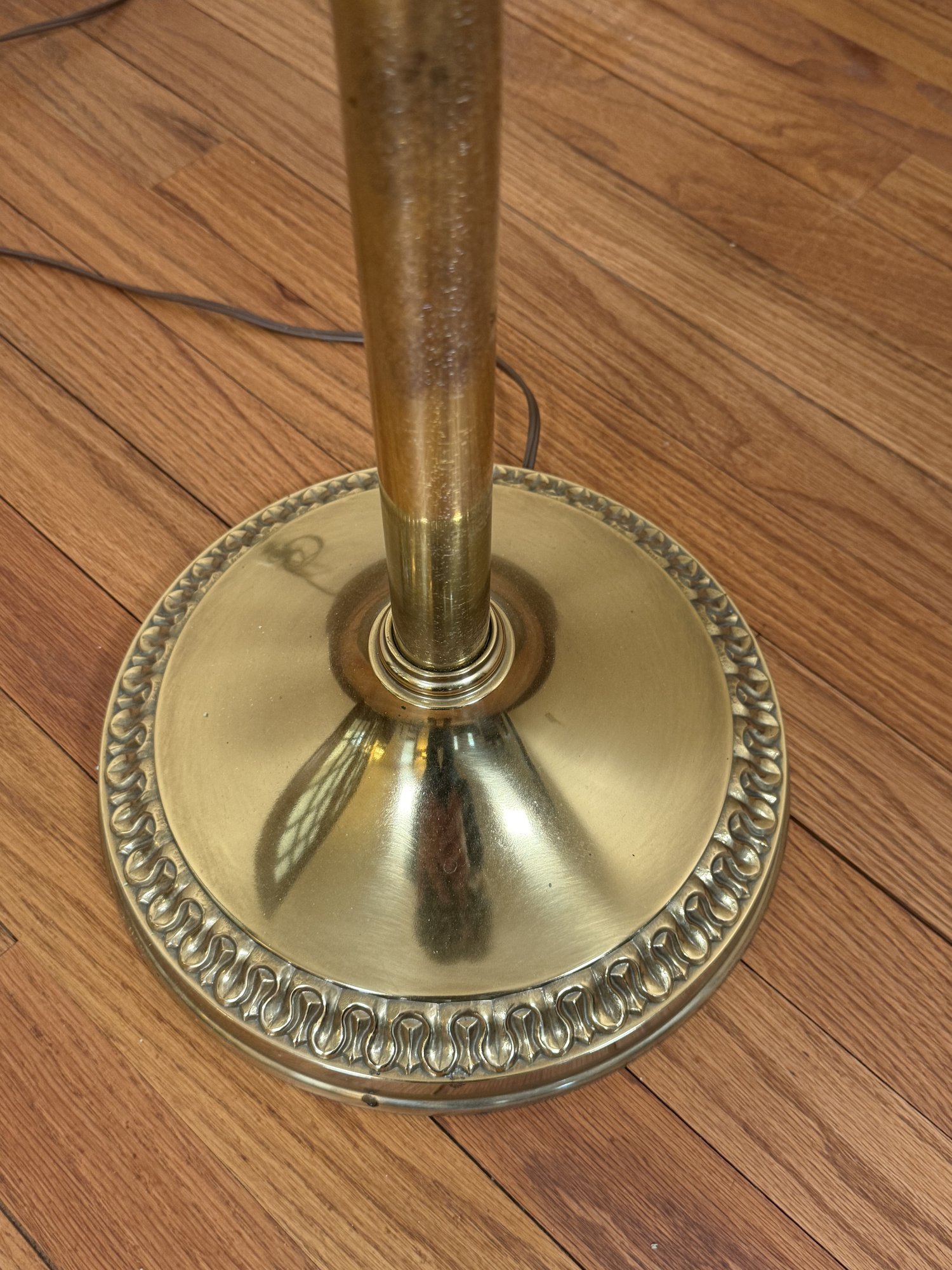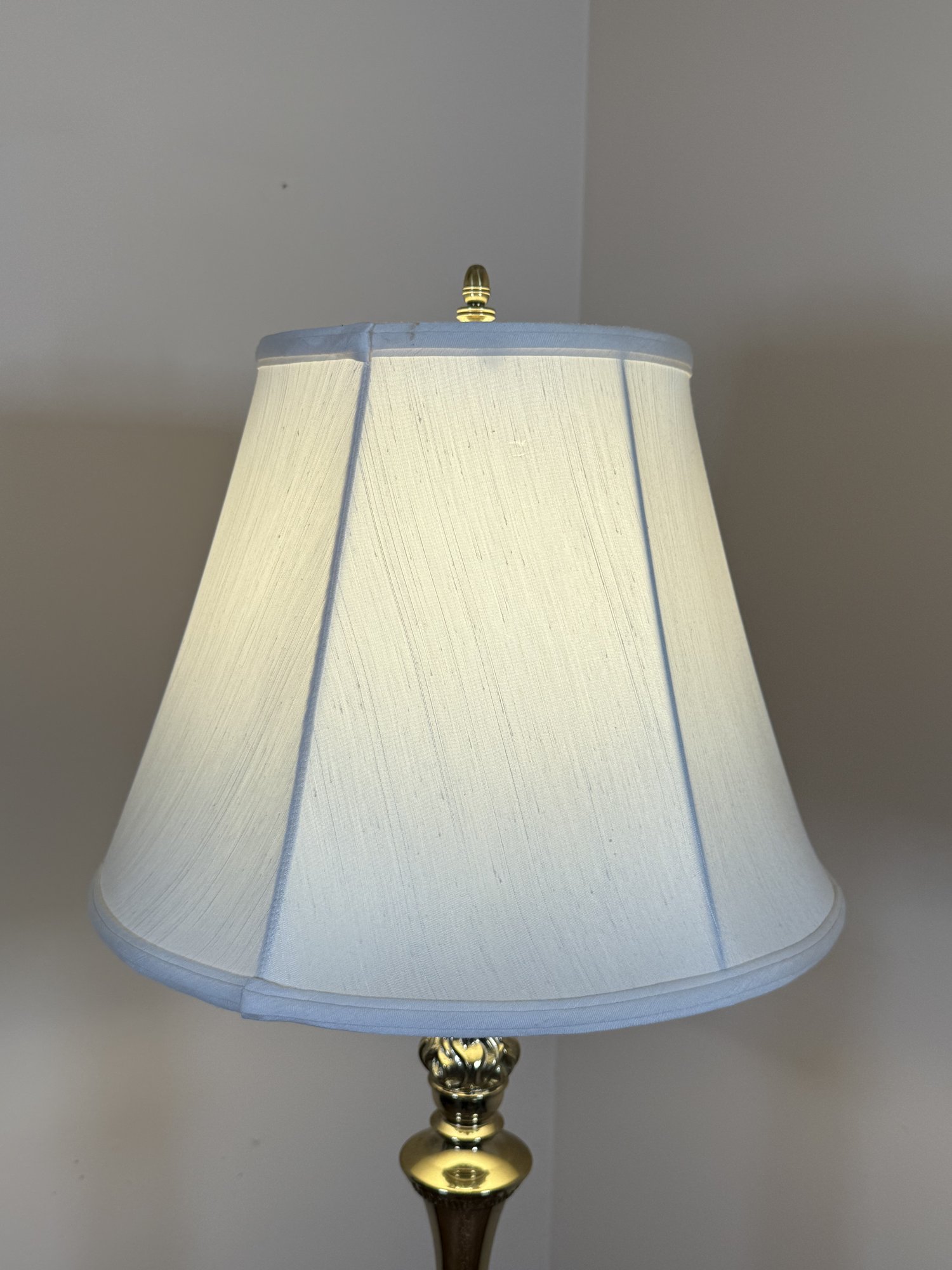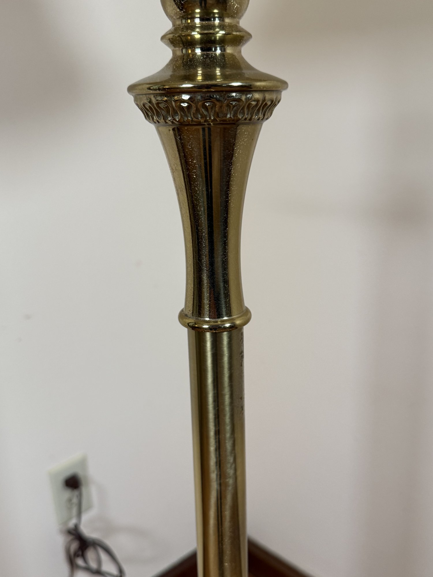 An authentic floor lamp by Stiffel in brass with a deluxe bell fabric shade. Good working condition, please see pics. Measures approx. 60" to top of finnial, 10" base, 16" shade.