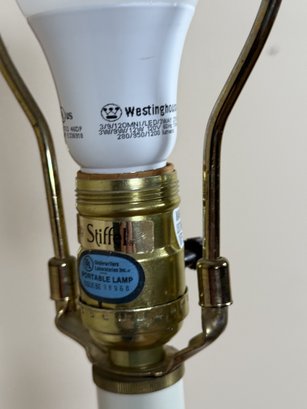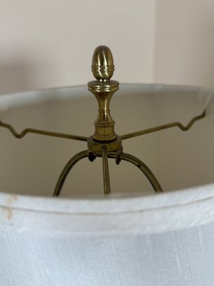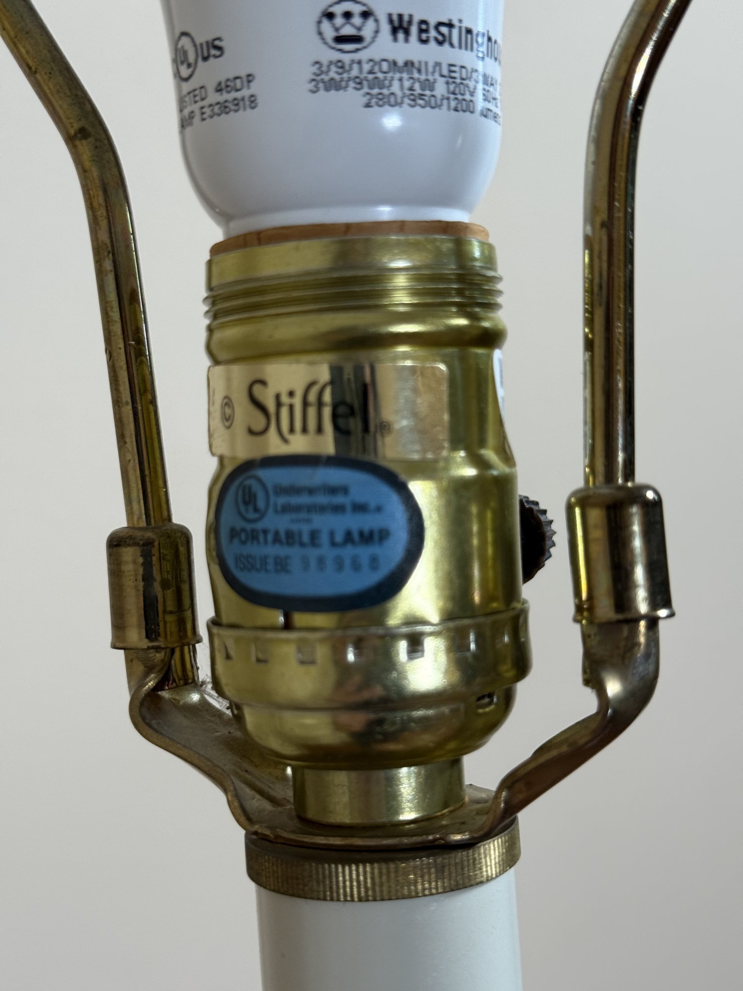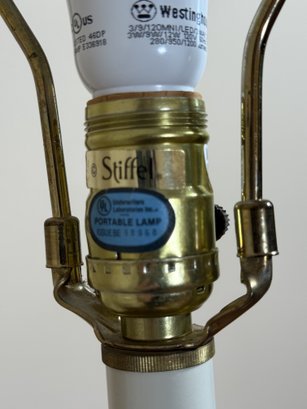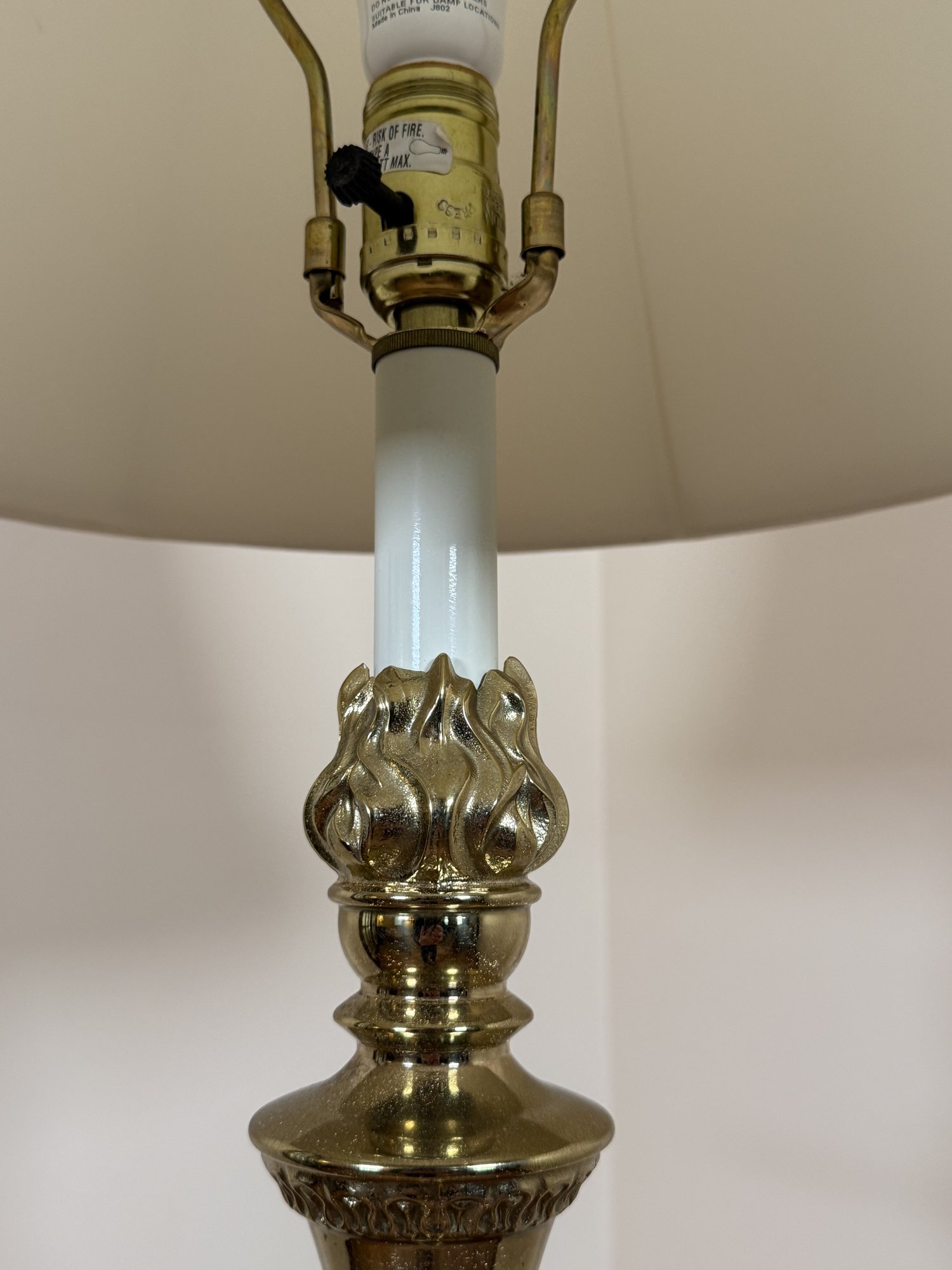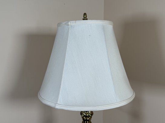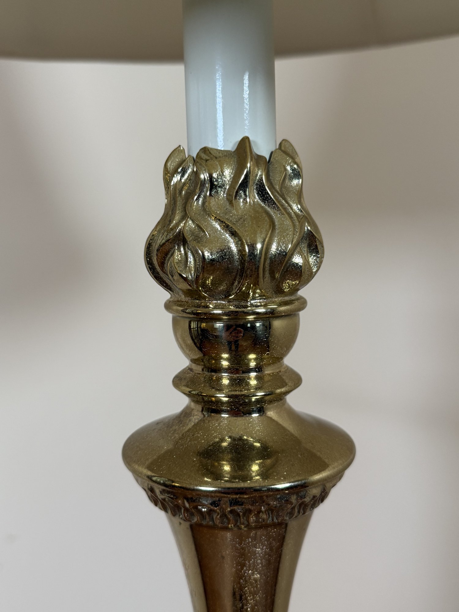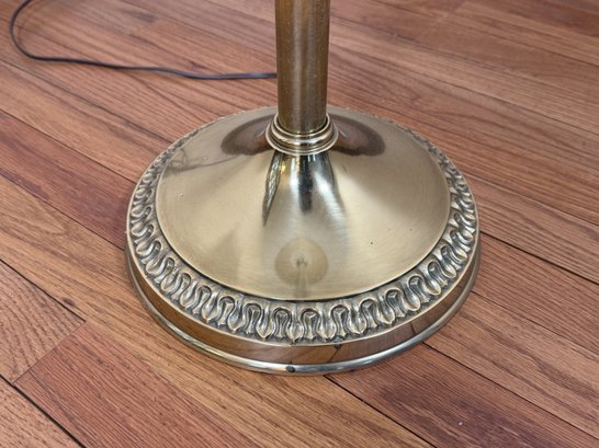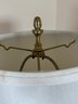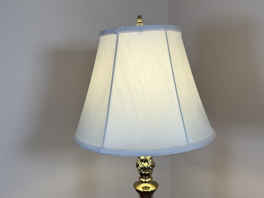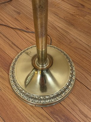 An authentic floor lamp by Stiffel in brass with a deluxe bell fabric shade. Good working condition, please see pics. Measures approx. 60" to top of finnial, 10" base, 16" shade.