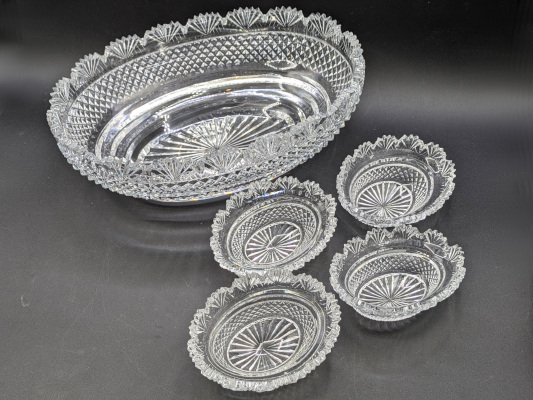 Art Nouveau silver-plated epergne, likely dating from the late 19th or early 20th century. Epergnes are decorative table centerpieces designed to hold fruit, desserts, or other food items. This one has a center bowl and four arms with matching inset small bowls. Beautiful deep cut crystal.