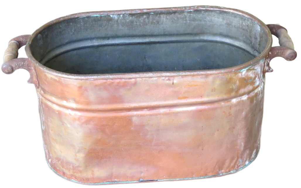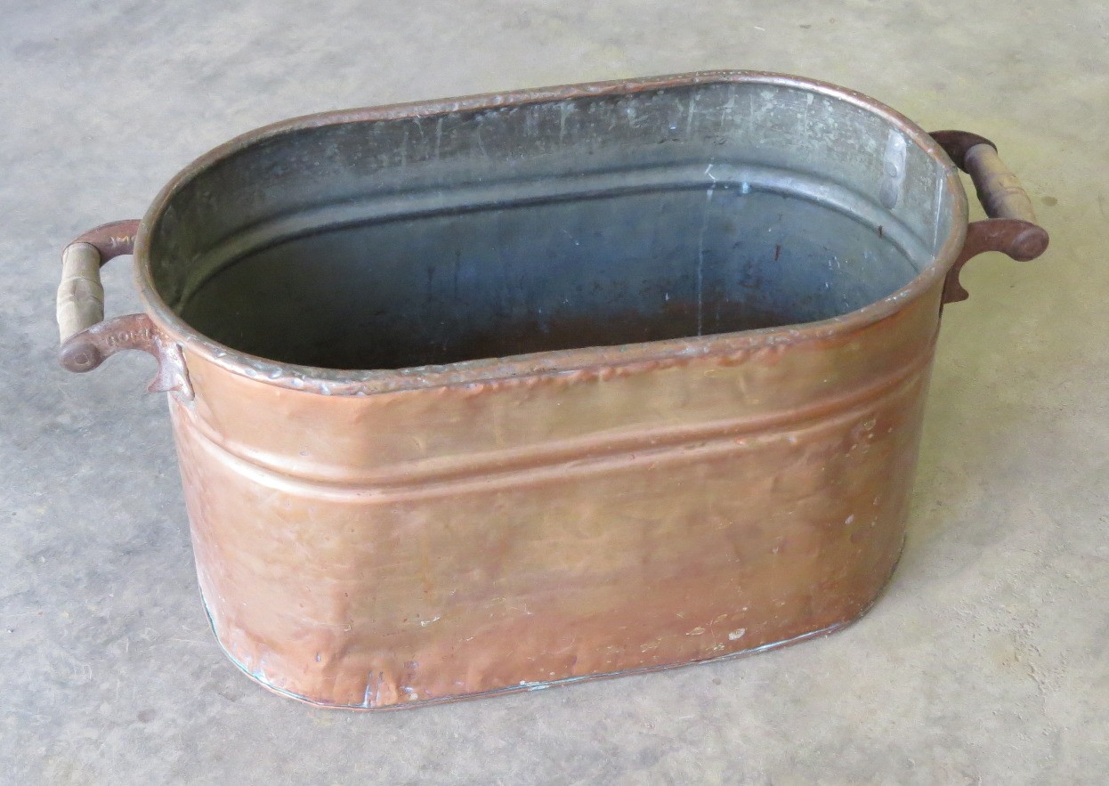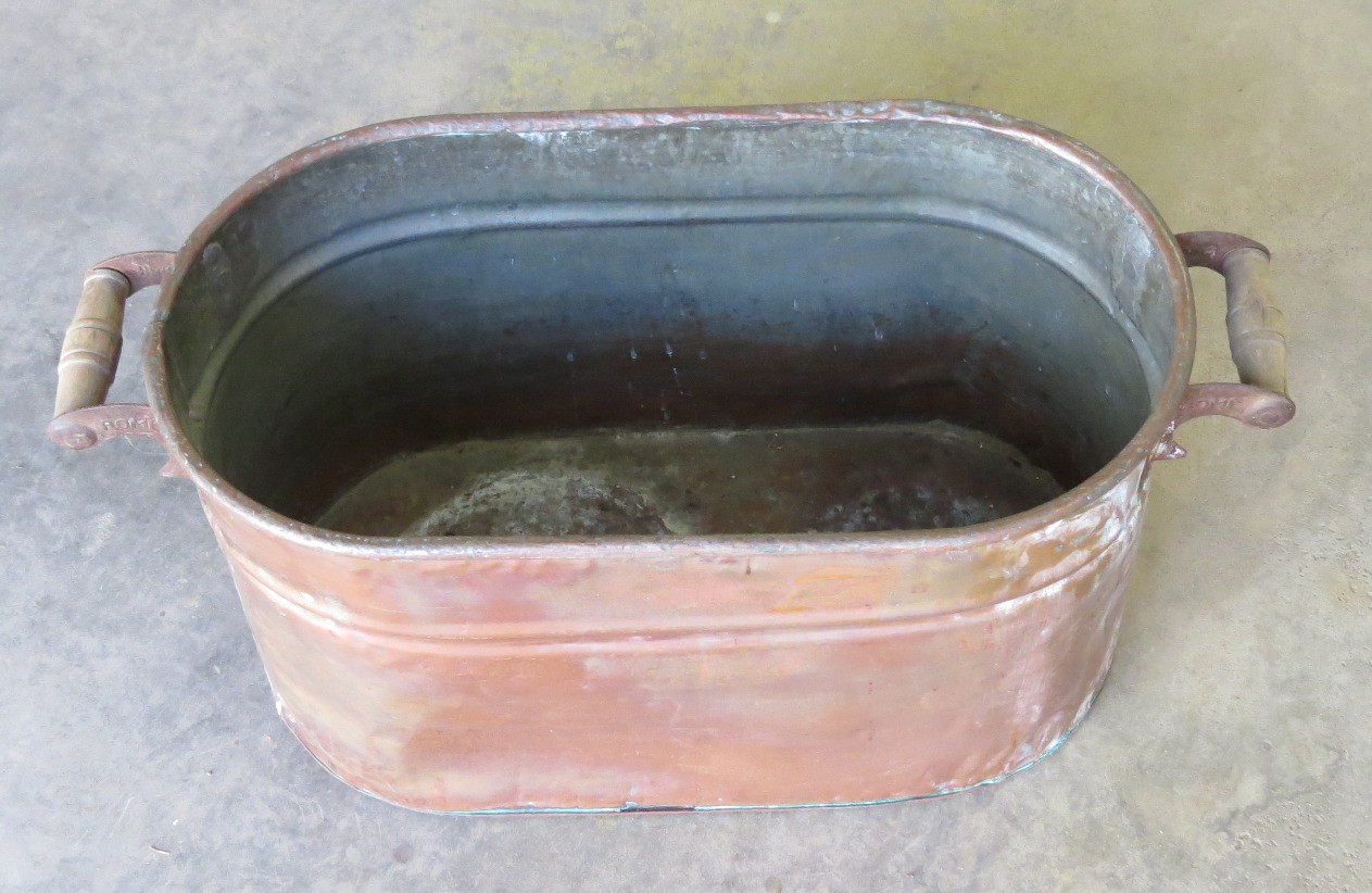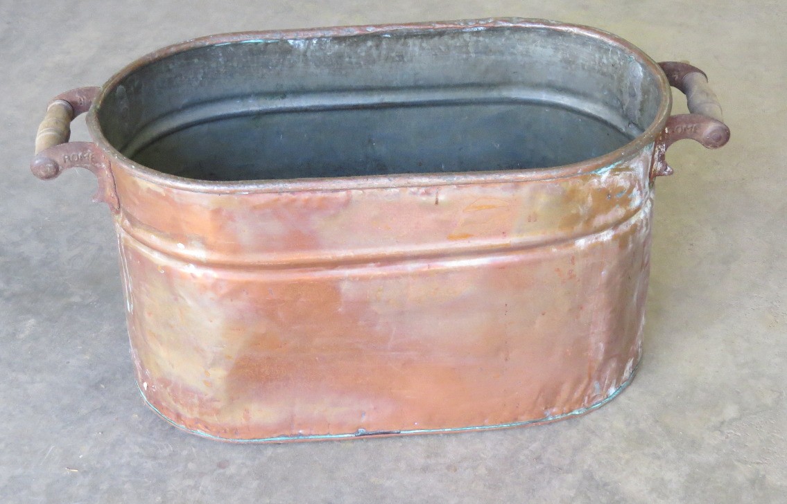 Antique copper boiler / washtub (no lid), and no holes in it either! Measures 25" wide handle to handle, 12" height, 12" depth. A great planter, artificial flowers display or many other uses too.