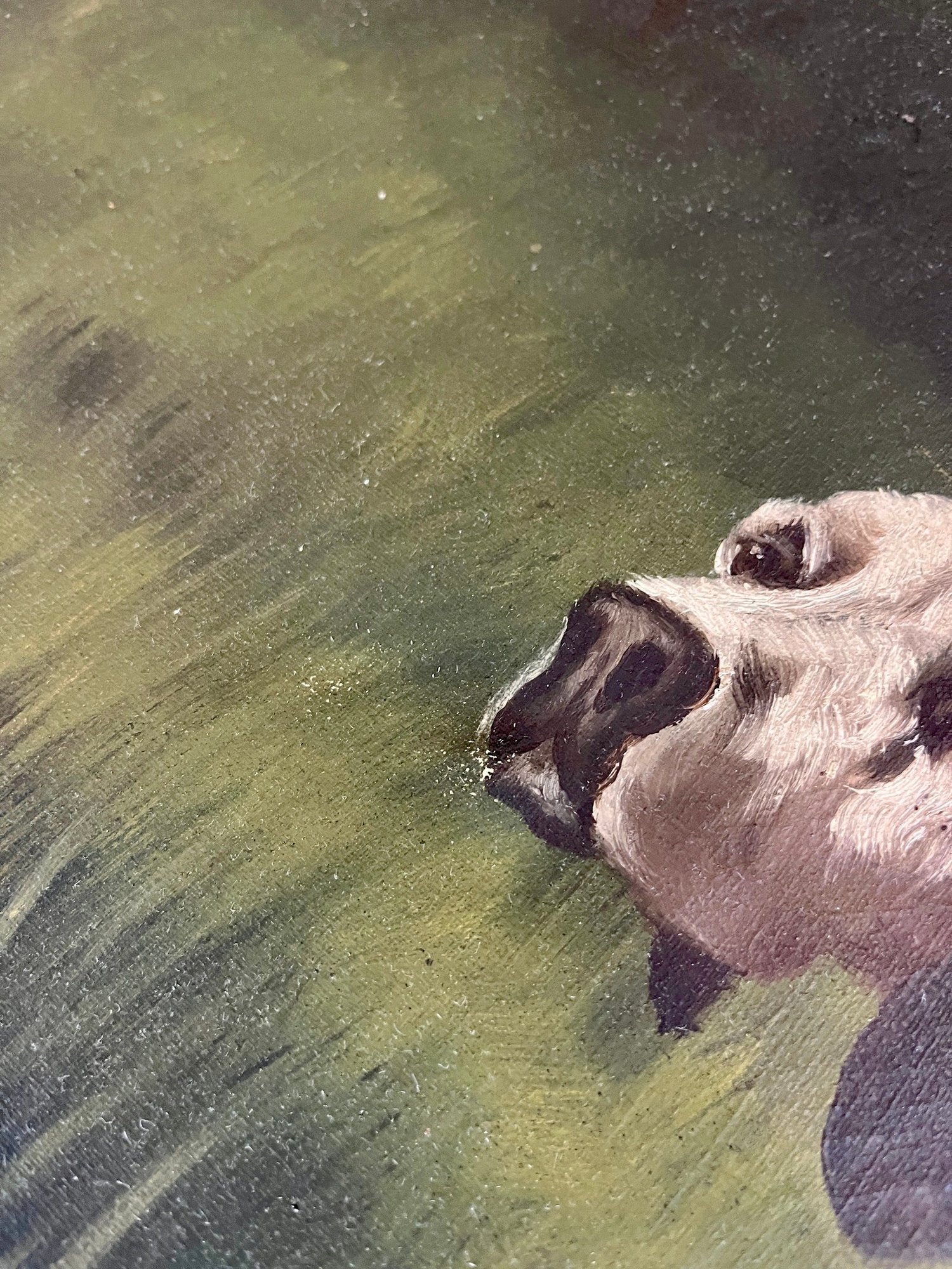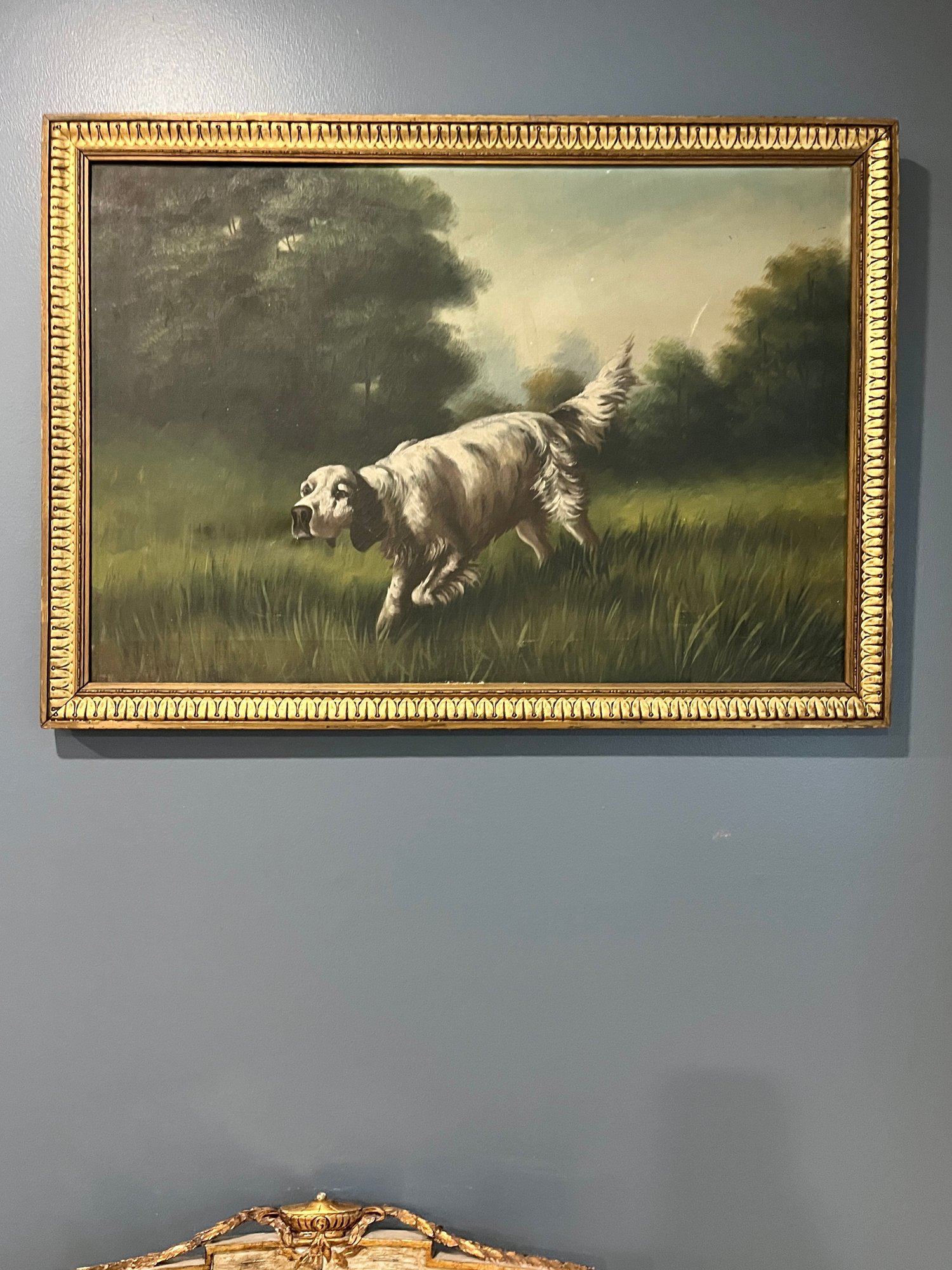 Curious information regarding the signature, it appears there were also maritime paintings in addition to canines. “ Fictitious marine painter. Numerous marine paintings bearing this signature emerged from Boston and Winthrop, MA, between 1910 -38. T. Bailey was a pseudonym invented by Morris Hambro (1860-1938), a London-born sign-painter and salesman who came to the U.S. in 1865 and began peddling the Bailey paintings after 1910. The typical work showed a tall ship on the high seas, its sails unfurled. Hambro created the fictive artist and sold the paintings door to door, mostly to businesses, traveling from Boston to Worcester, to New Bedford, to Portland (ME), to Cape Cod, and to Fall River. Hambro was extremely successful in his endeavor; one gallery in Boston (the Addition Gallery) reportedly bought the paintings "by the dozen." A number of names have been suggested as the actual painter or painters of the marines: Vivian Forsythe Porter, Max Berman (who was married to Hambro's niece), Sears Thompson, J. G. Cloudman, Mae Bennet Brown, Melbourne C. Hardwick; and, in particular, William Frederick Paskell. It is believed that Hambro bought the works from the artists for $15 to $20, added Bailey's signature, and then sold the paintings for up to $50 a piece. Whether the artists themselves even knew about Hambro"s strategy is unknown.”
