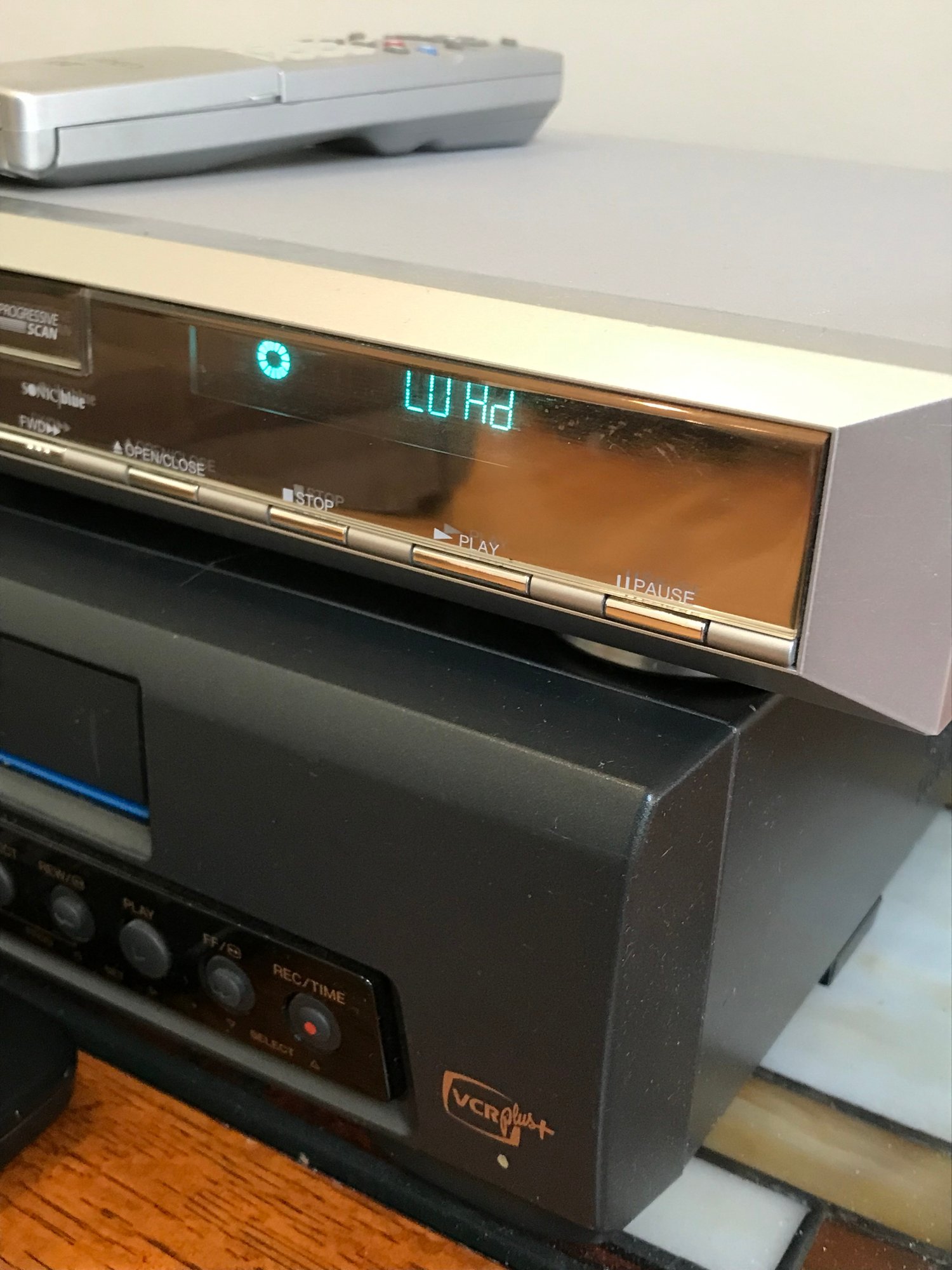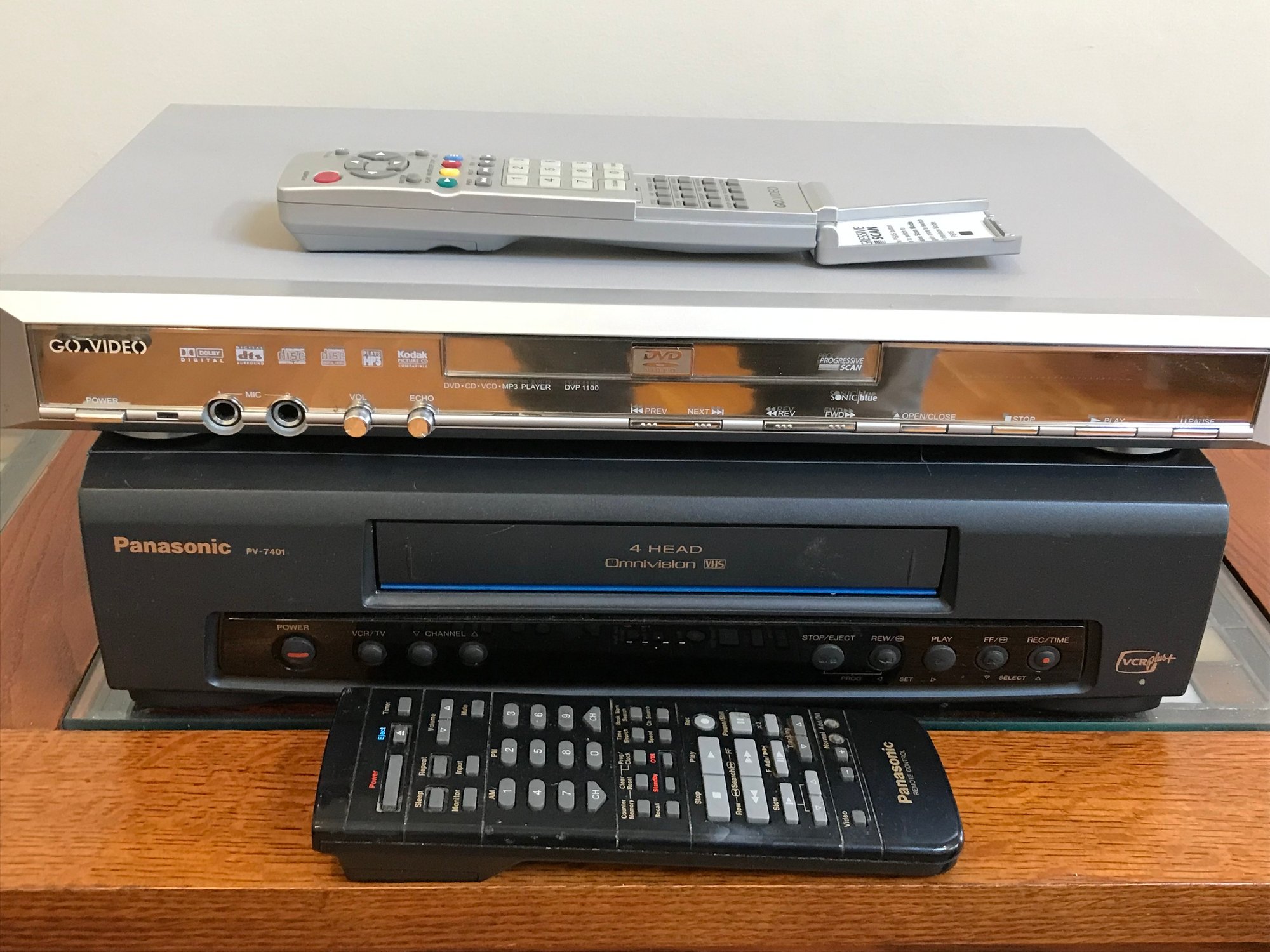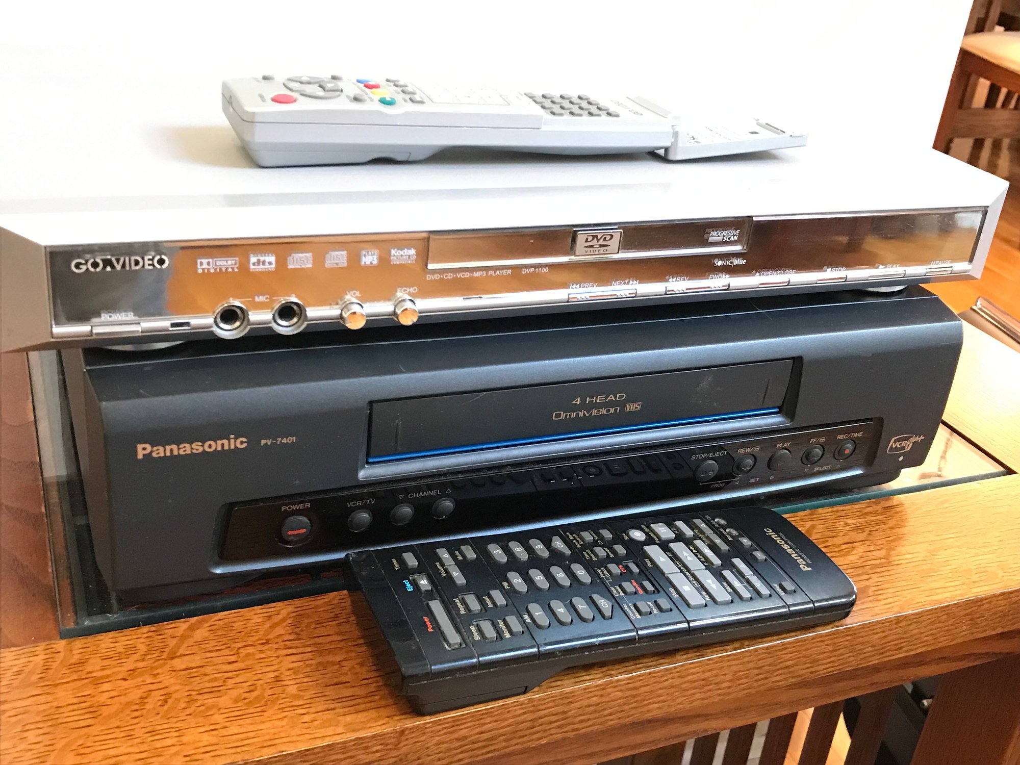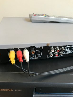 This listing includes a versatile pair of home media players, perfect for enjoying both classic VHS tapes and DVDs. Both units come with their respective original remote controls.