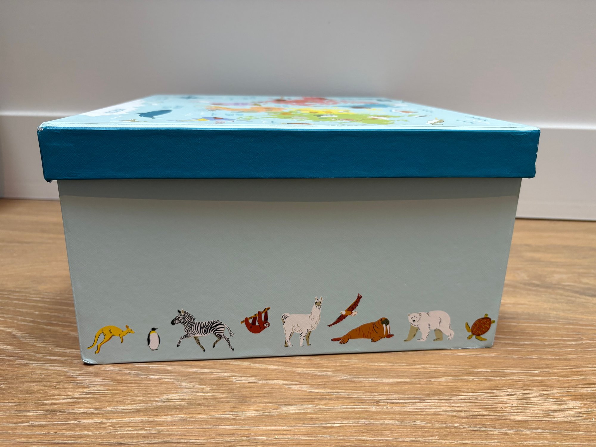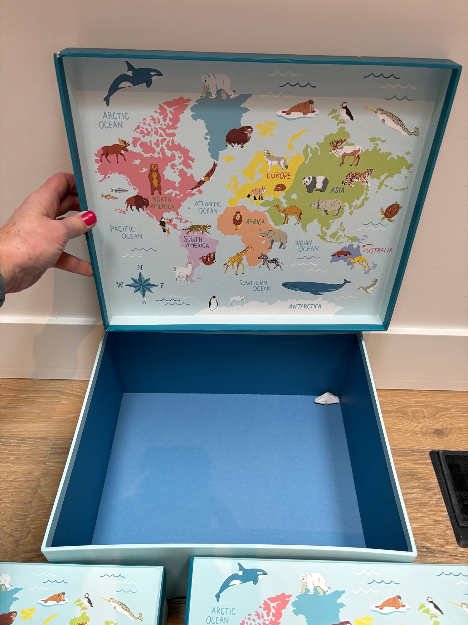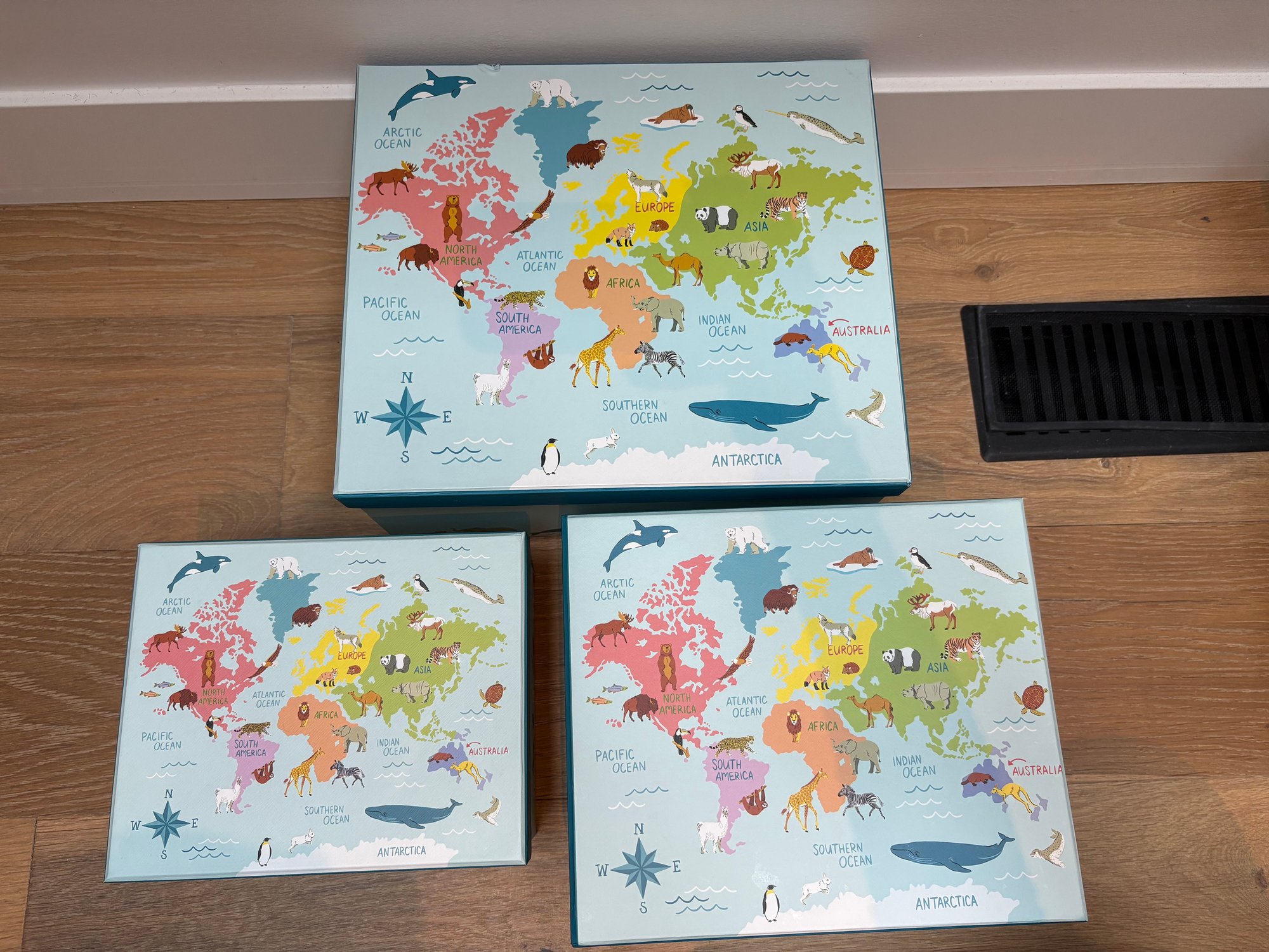 Set of three nesting boxes with maps and animals of the world. (Largest box lid has slight damage)