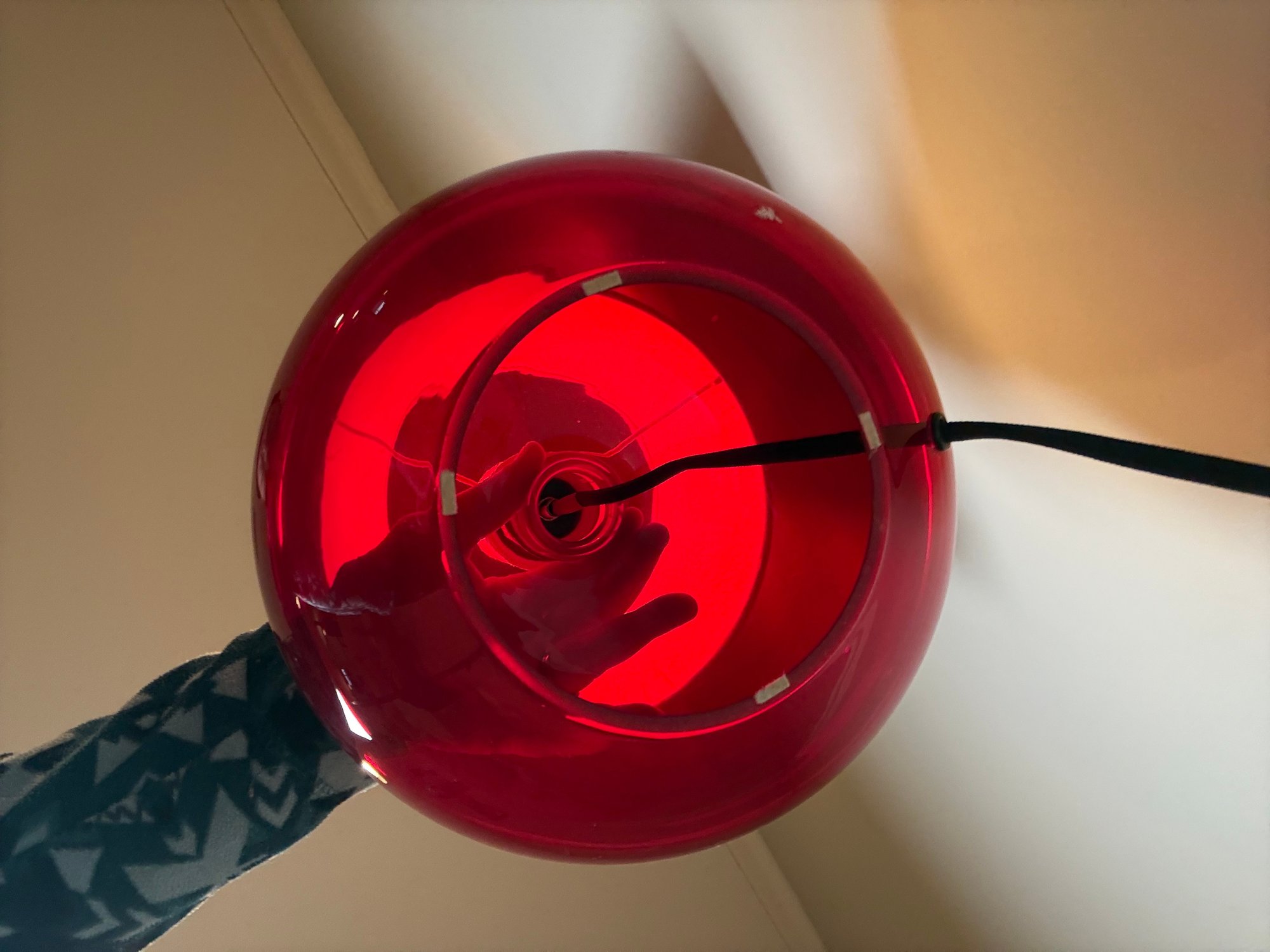 An IKEA Ljusås Uvås table lamp, designed by Swedish designer Anne Nilsson. It features a translucent, hand-blown red glass base with a round, bulbous shape.