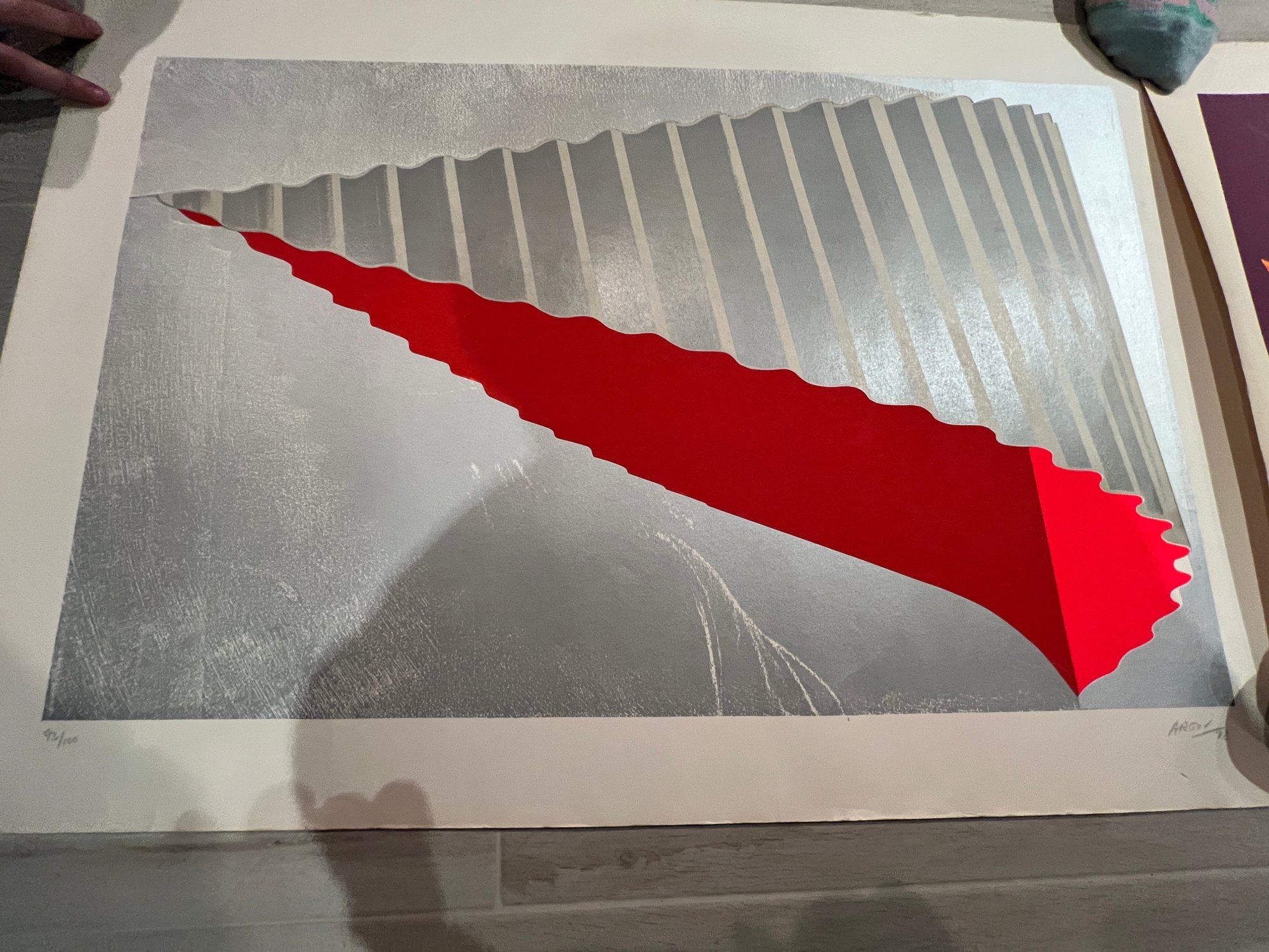 The image shows a limited edition print by the artist Ansdell. It is an abstract serigraph featuring a red shape that appears to tear through a silver-striped surface. The print is numbered 93/100 and signed by the artist.