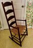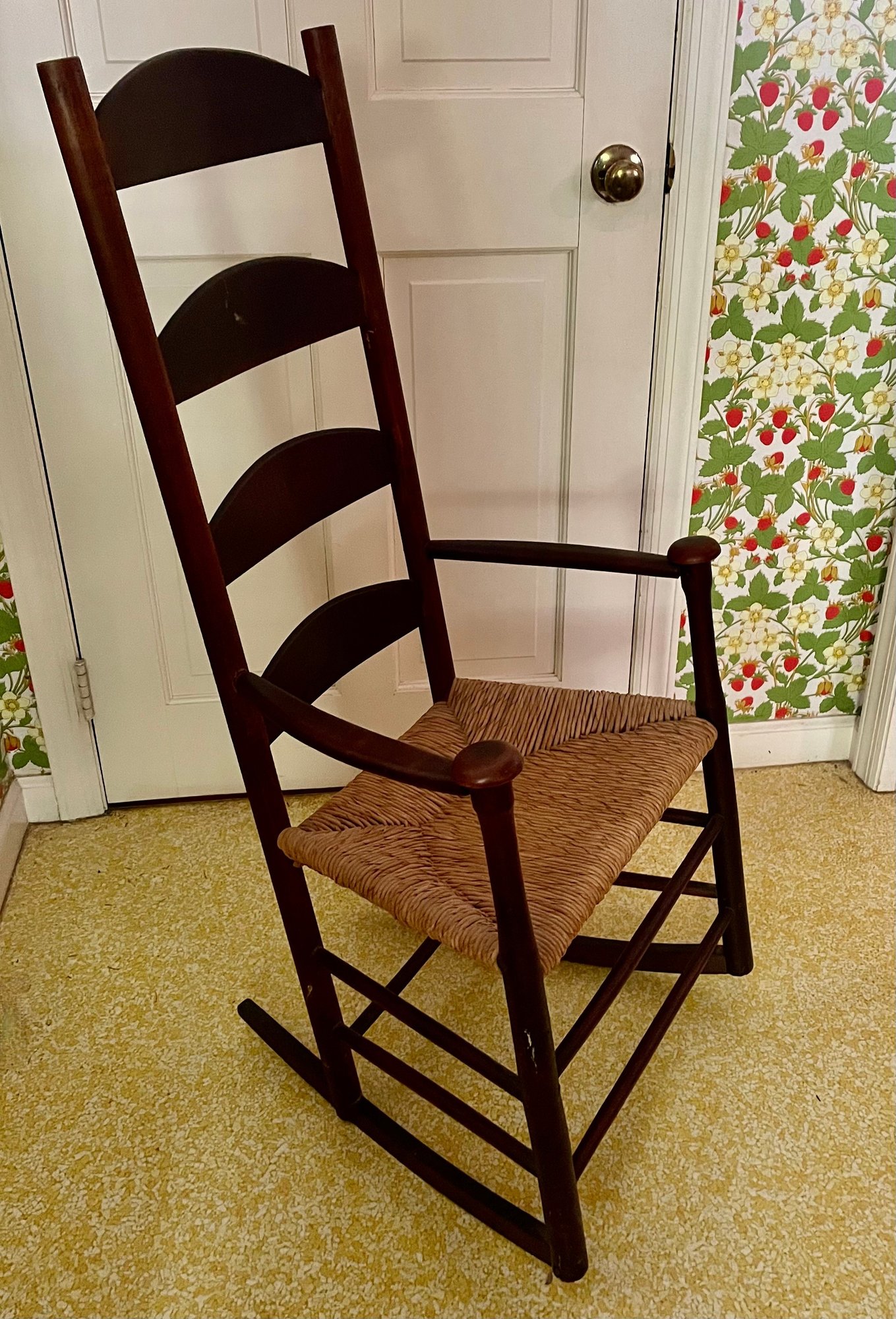 A wonderful early American ladder back rocker with 4 slats and a rush seat and beautiful lines.