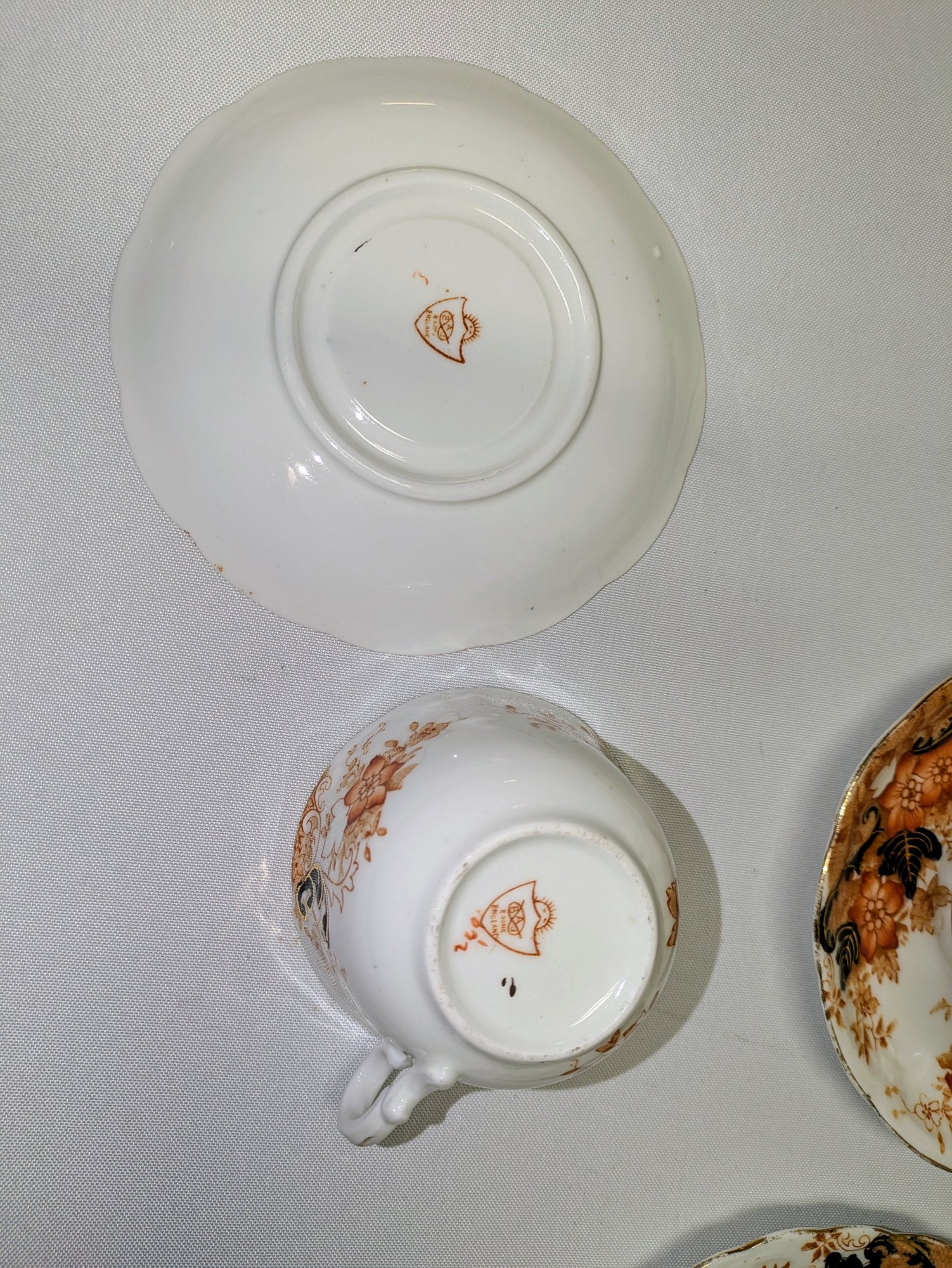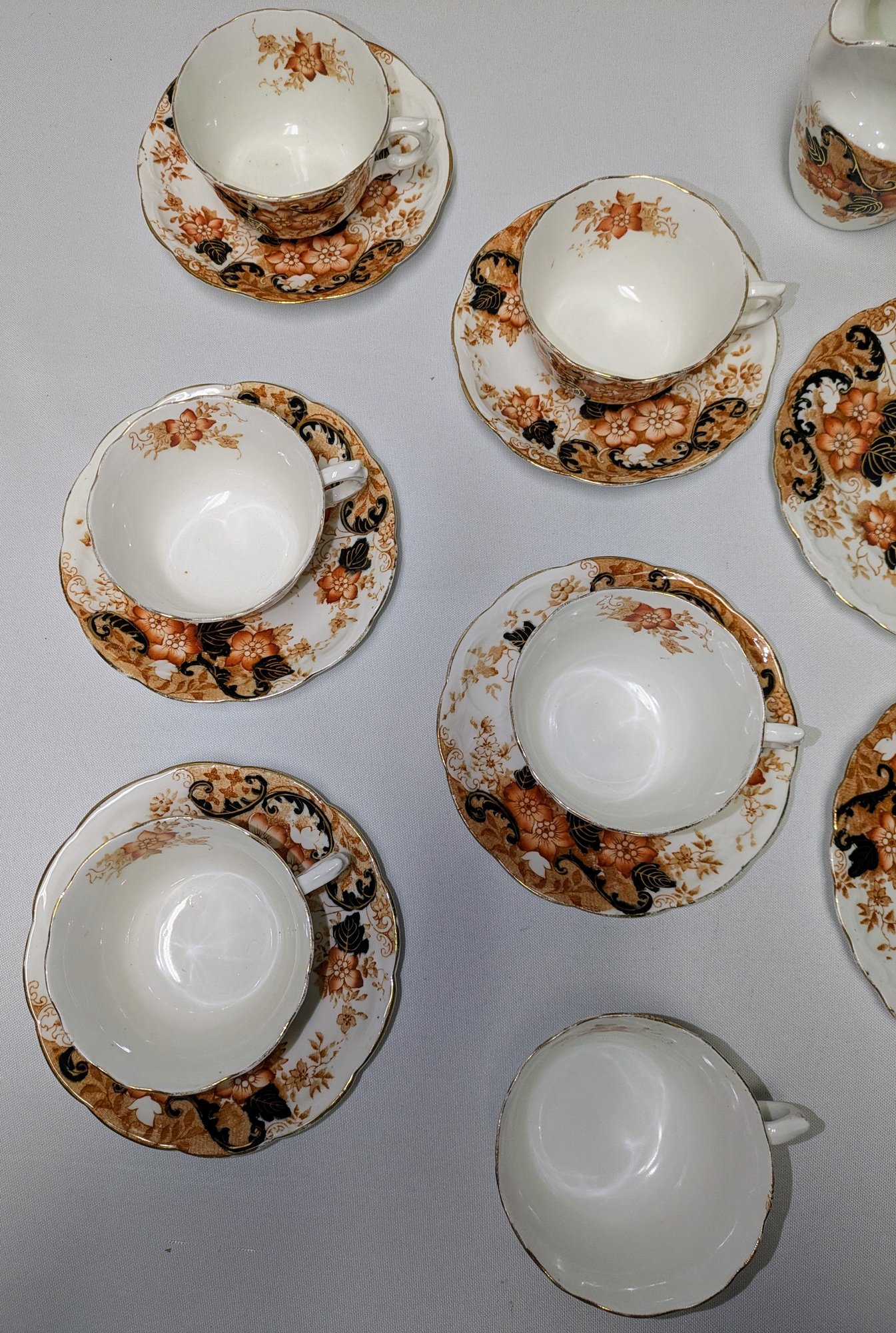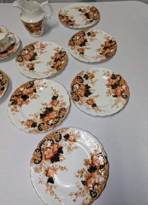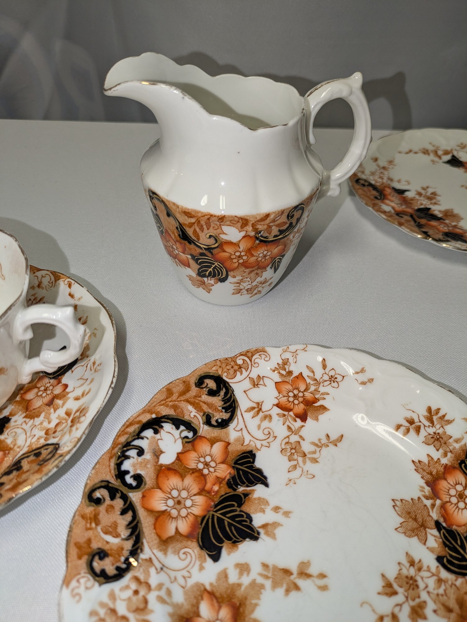 Antique A.B. Jones & Sons, England, English China Tea/Dessert Set with Mitk Pitcher - c. 1900-1913. Imari style pattern in rust, black & gold gilt accented floral pattern. Some very light marks and light loss of gold, all consistent with age and use. No chips or cracks. Overall, Excellent /Very Good Antique Condition. Please see all photos as part of the description and condition. Cups 2.5"H / Saucers 5.5" & Milk Pitcher 4"H x 3.5" Diam. x 4.75" (handle to spout).