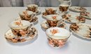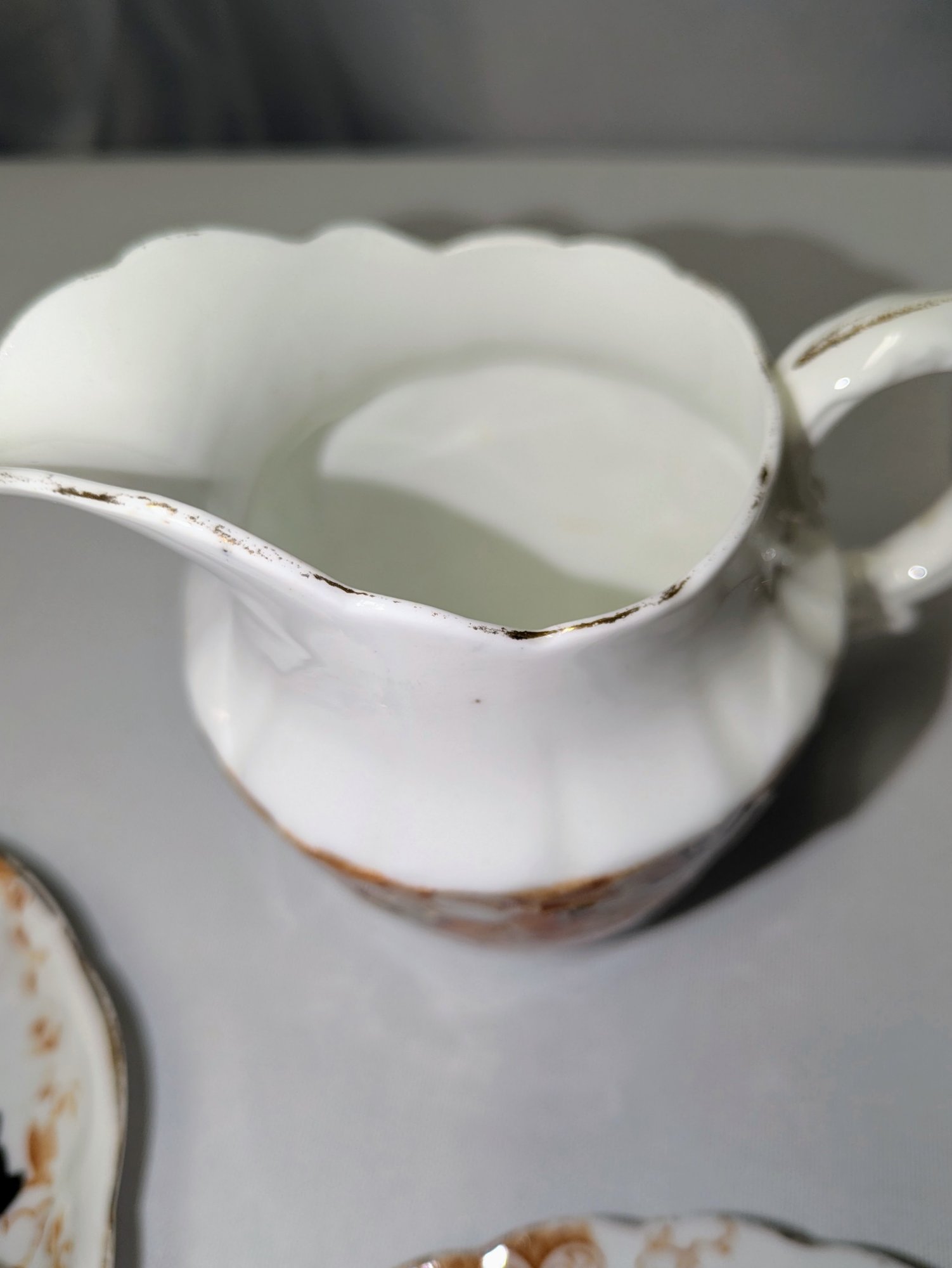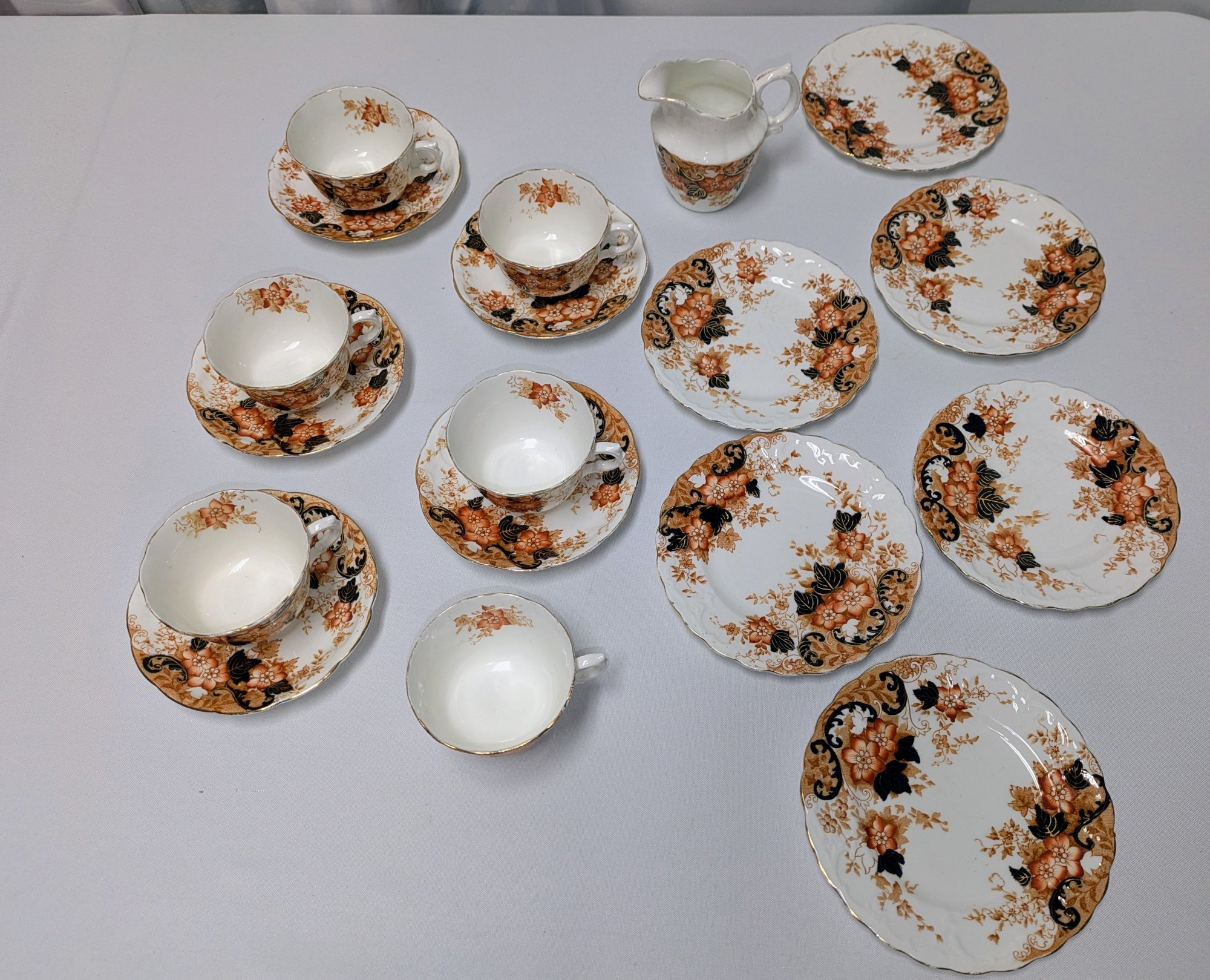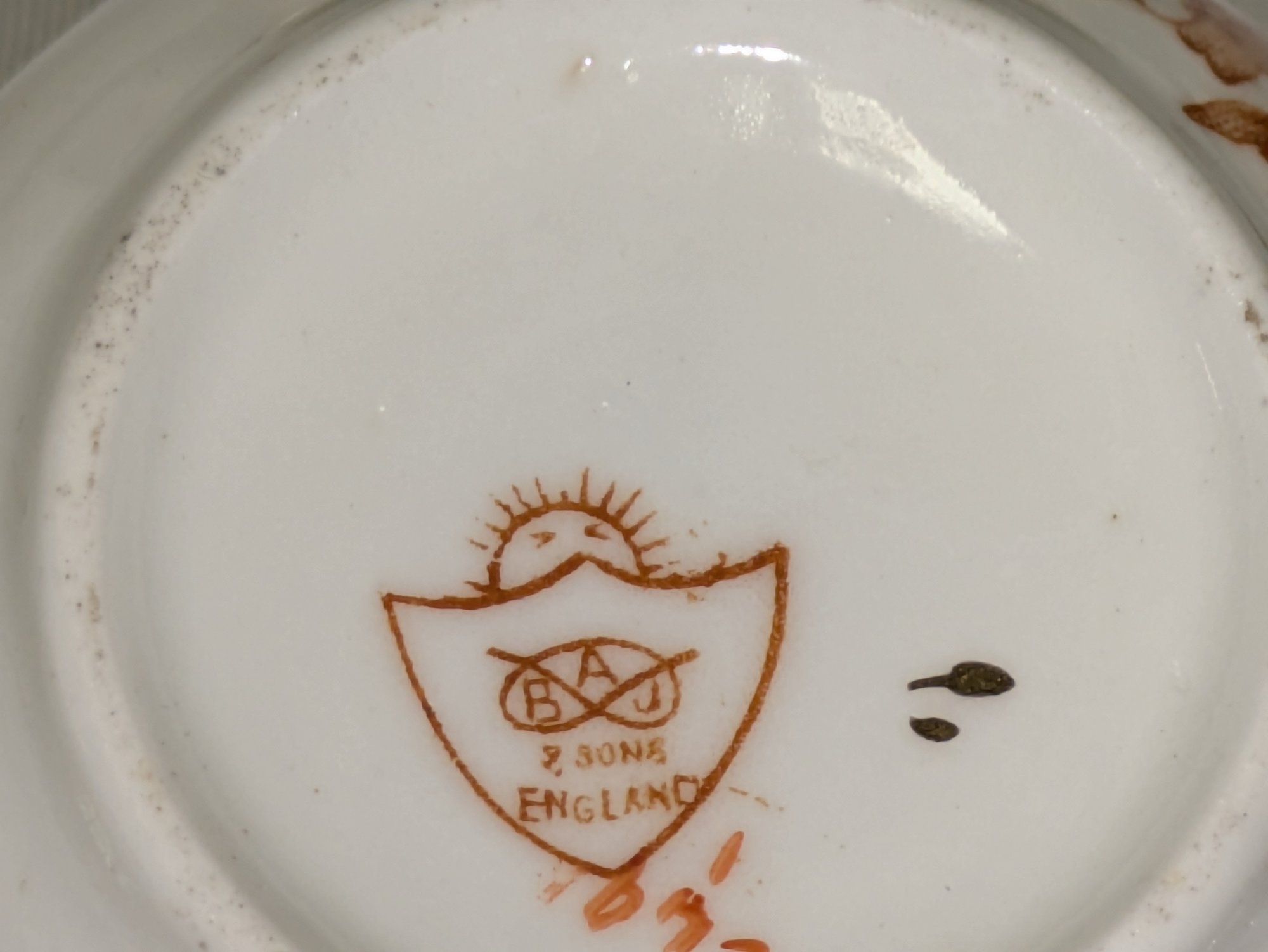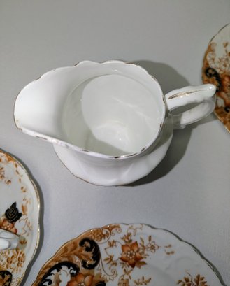 Antique A.B. Jones & Sons, England, English China Tea/Dessert Set with Mitk Pitcher - c. 1900-1913. Imari style pattern in rust, black & gold gilt accented floral pattern. Some very light marks and light loss of gold, all consistent with age and use. No chips or cracks. Overall, Excellent /Very Good Antique Condition. Please see all photos as part of the description and condition. Cups 2.5"H / Saucers 5.5" & Milk Pitcher 4"H x 3.5" Diam. x 4.75" (handle to spout).