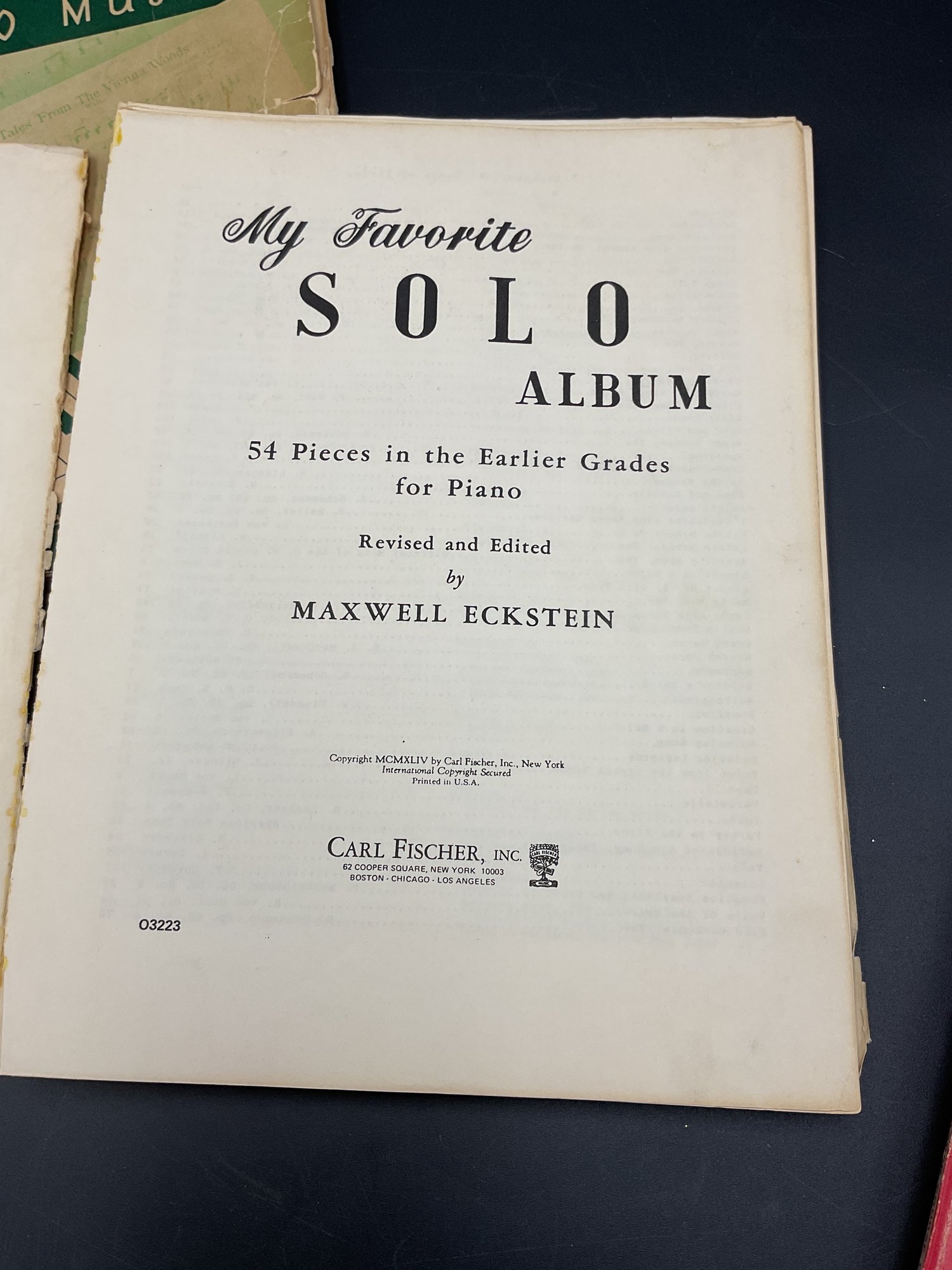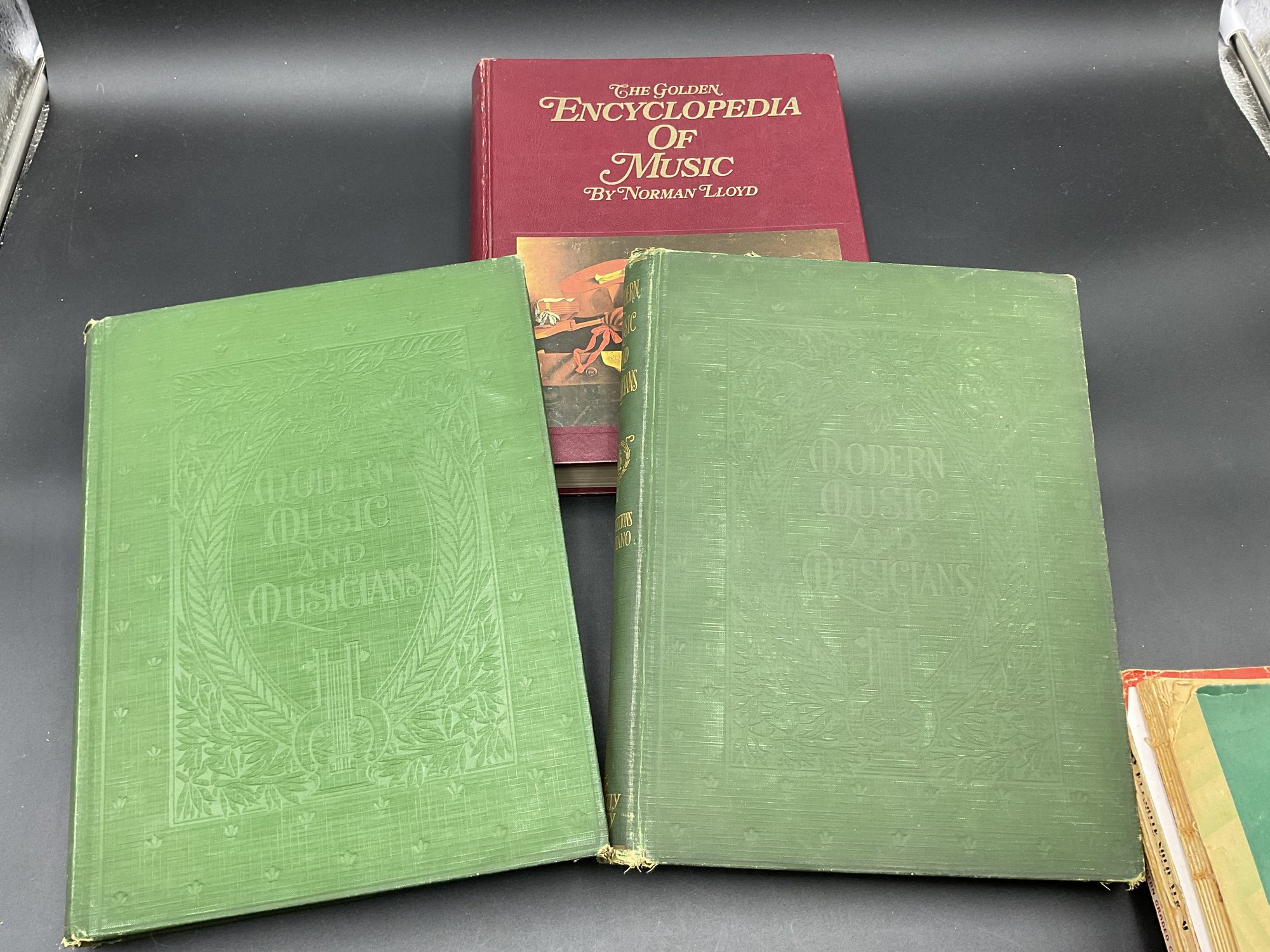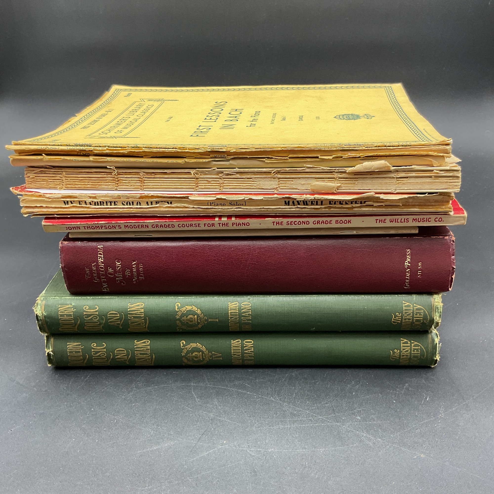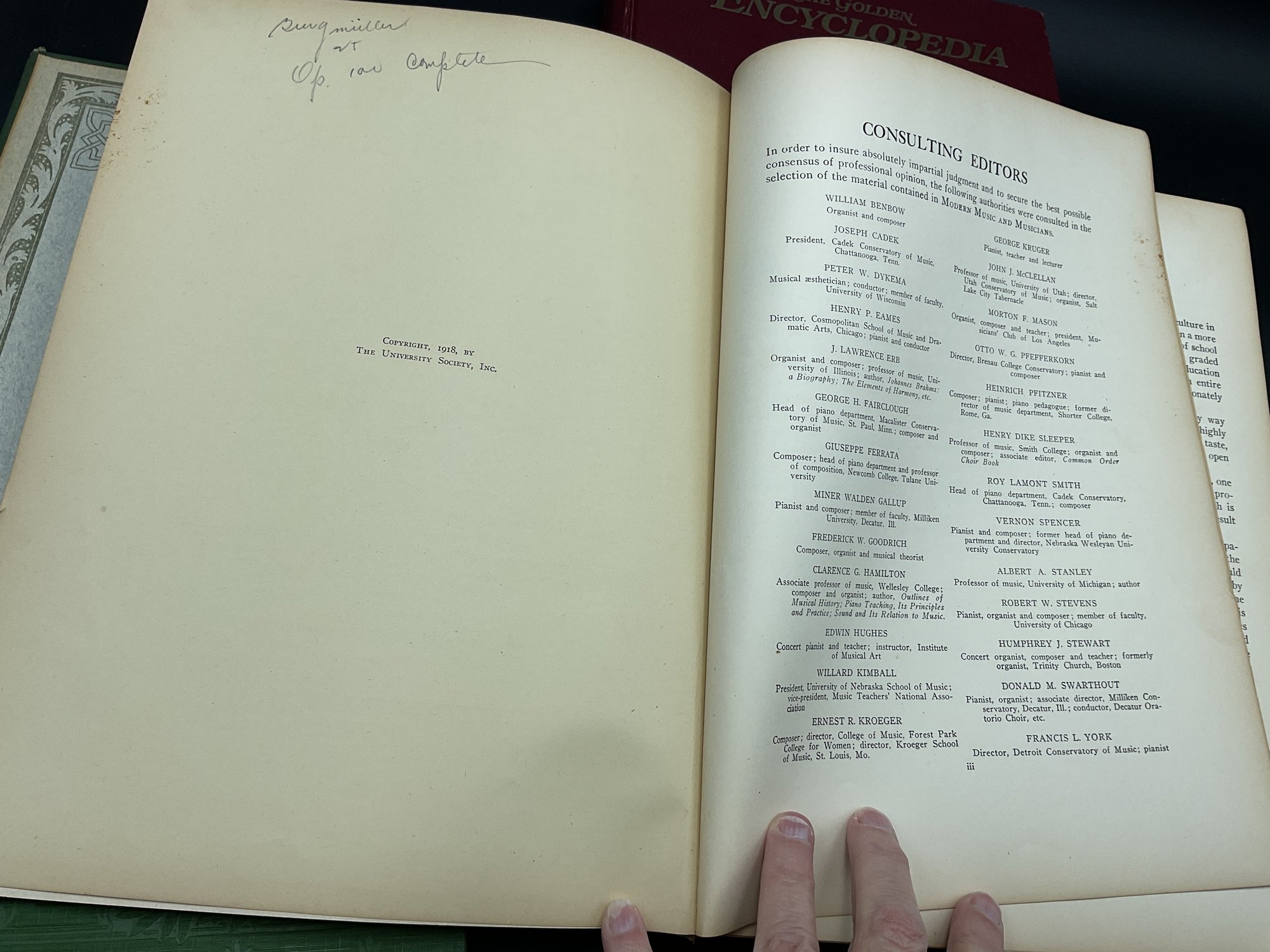 Three 1939 vintage softcover books of classical music: Bach (2) and Chopin (1). Covers loose on two but interior intact, slight discoloration from age but all pages present. Two volumes from the 1918 Modern Music and Musicians series (Vol s 1 and 4, Compositions for Piano). Cover of Vol 1 loose, both vols have some foxing from age, all pages present. The Golden Encyclopedia of Music from 1968 in in very good condition, no problems noted. Lot also includes a very well used Robbins Mammoth Collection of Famous Piano Music from 1936 and "My Favorite Solo Album" from 1944 - we can't guarantee all the pages are present for these two.
