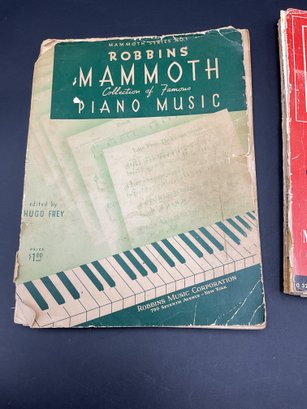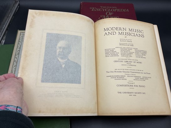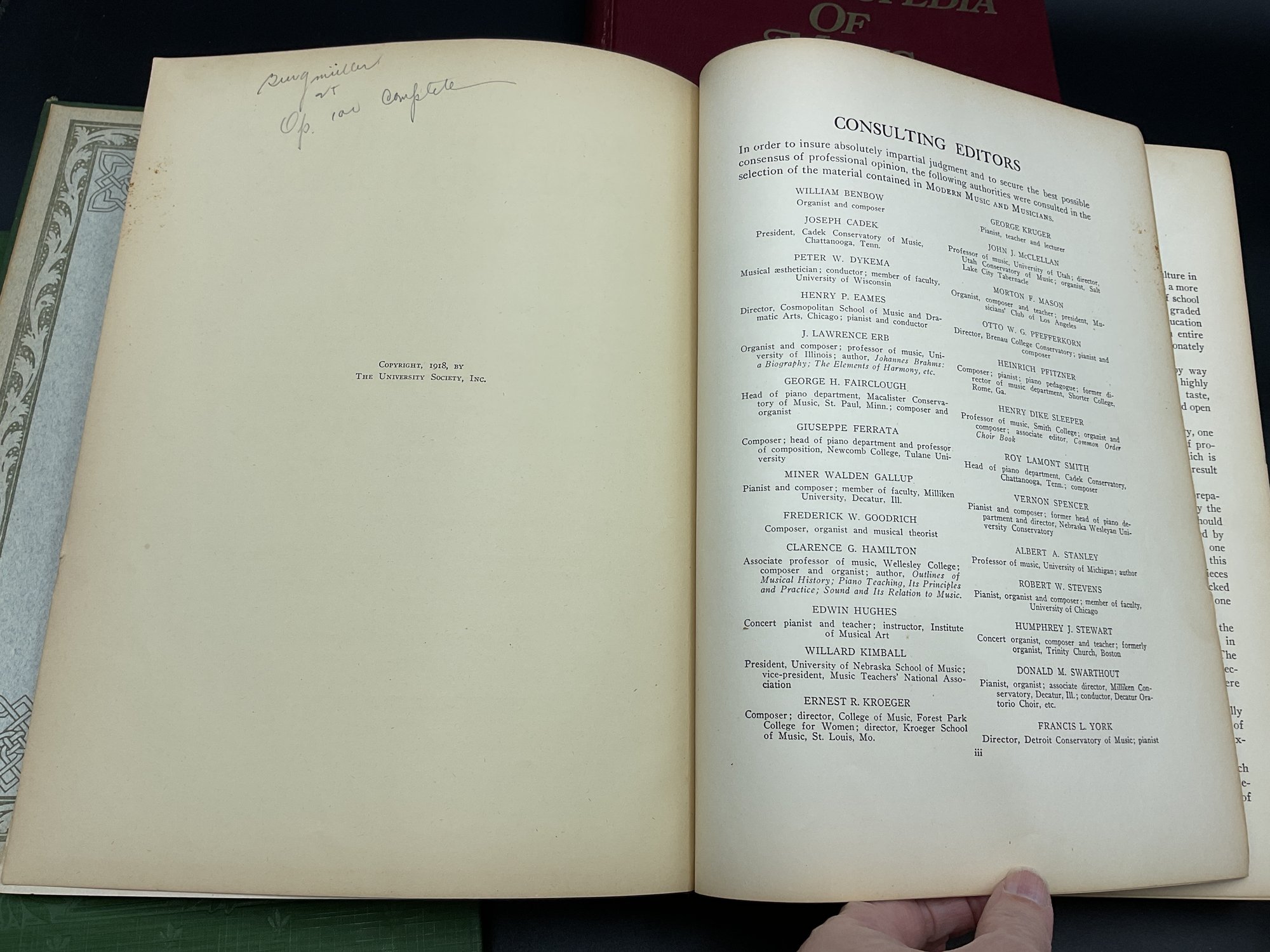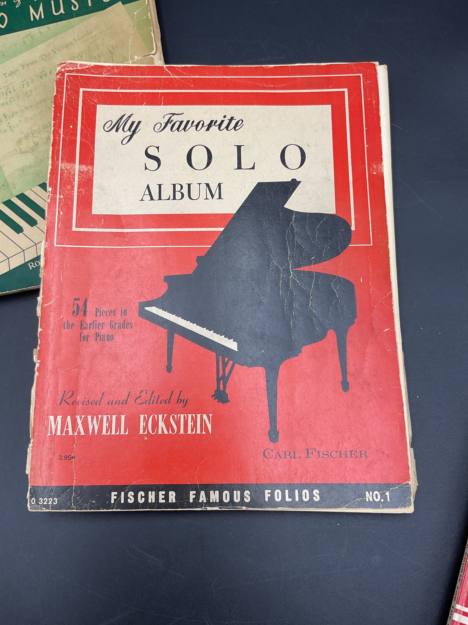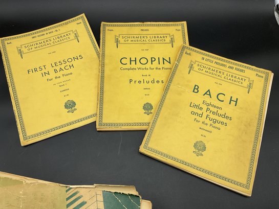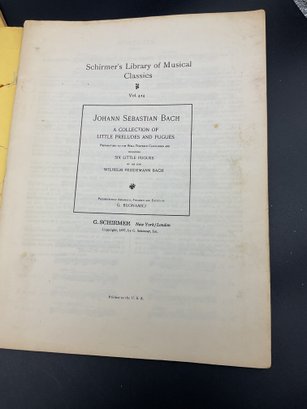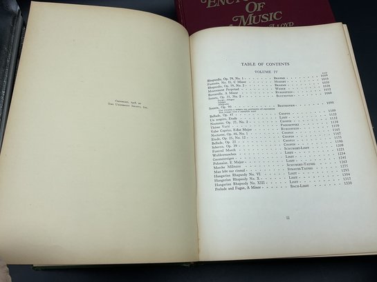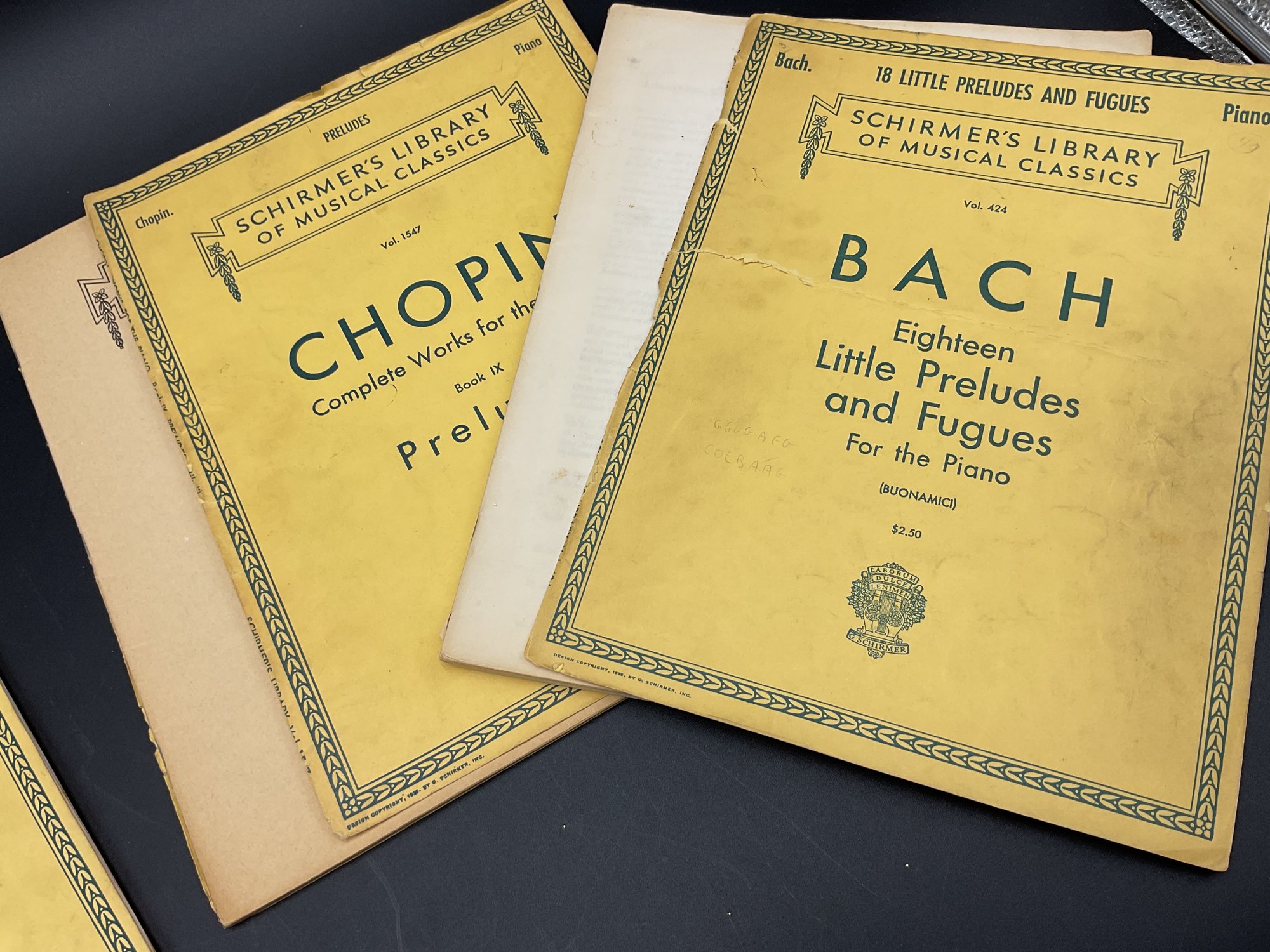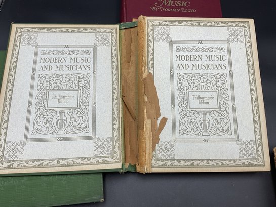 Three 1939 vintage softcover books of classical music: Bach (2) and Chopin (1). Covers loose on two but interior intact, slight discoloration from age but all pages present. Two volumes from the 1918 Modern Music and Musicians series (Vol s 1 and 4, Compositions for Piano). Cover of Vol 1 loose, both vols have some foxing from age, all pages present. The Golden Encyclopedia of Music from 1968 in in very good condition, no problems noted. Lot also includes a very well used Robbins Mammoth Collection of Famous Piano Music from 1936 and "My Favorite Solo Album" from 1944 - we can't guarantee all the pages are present for these two.