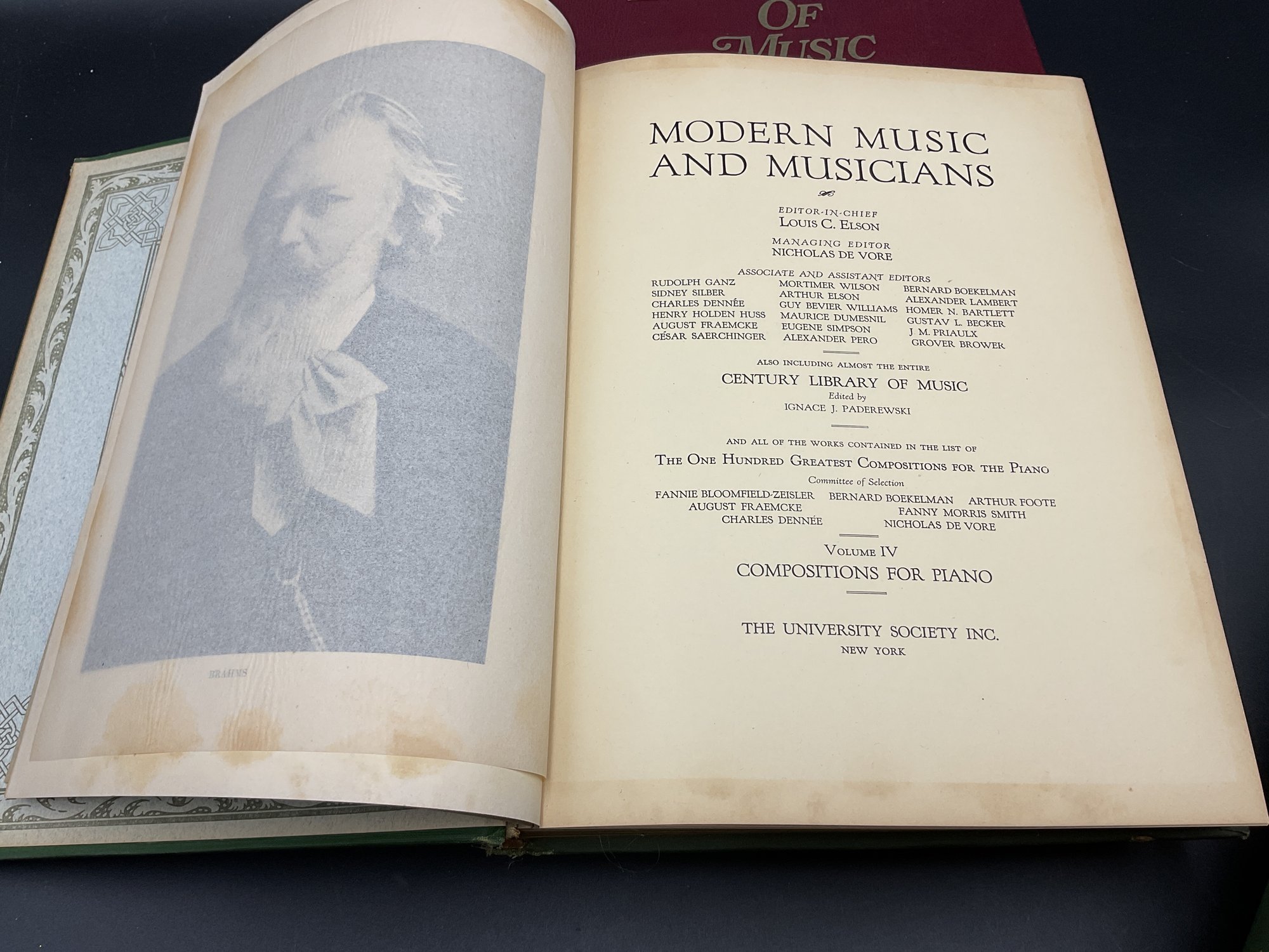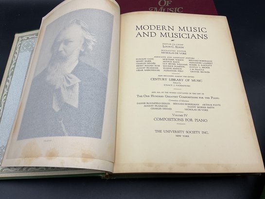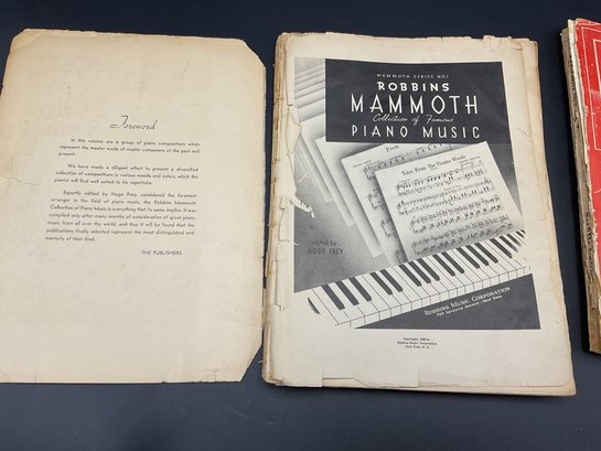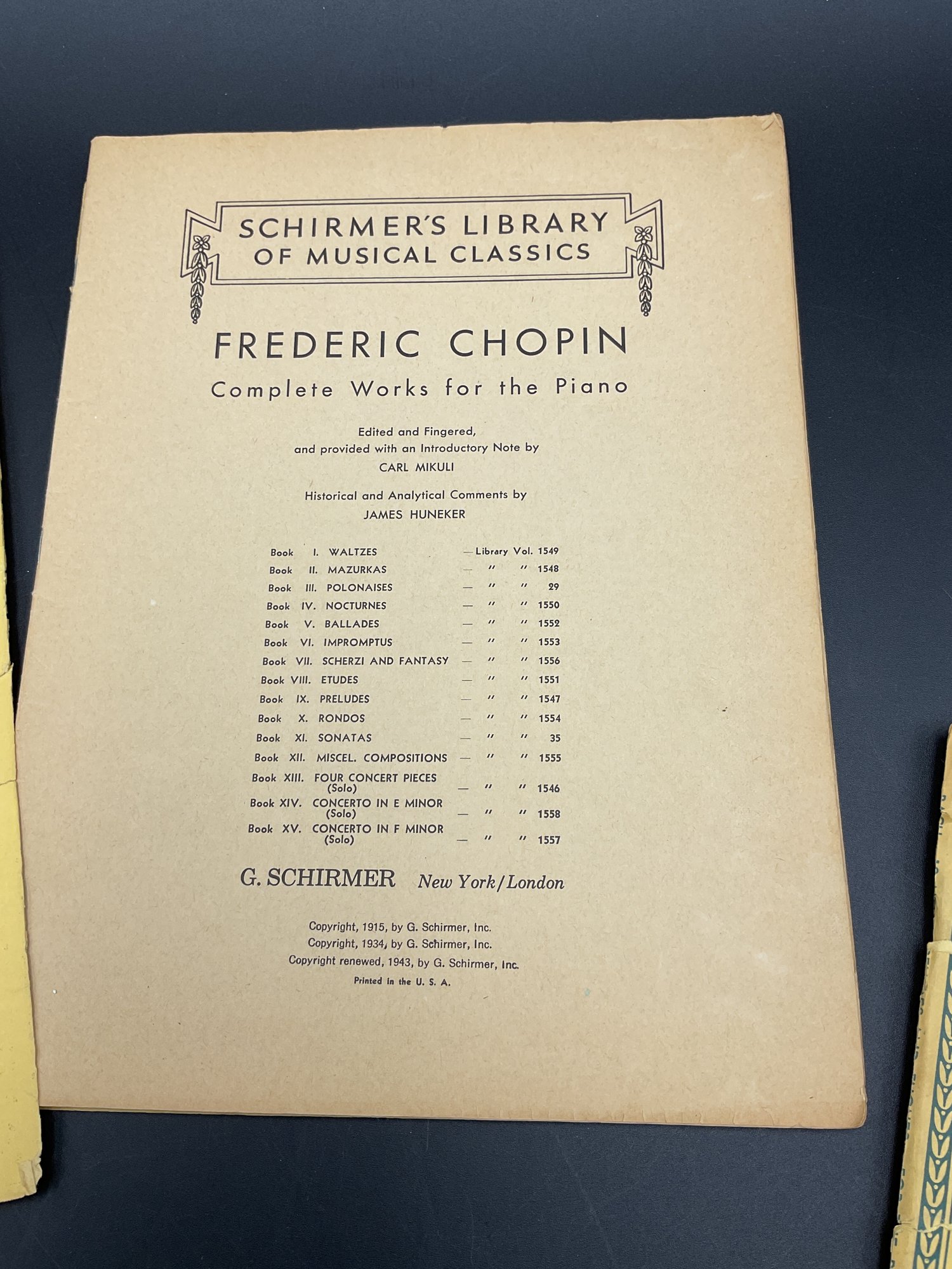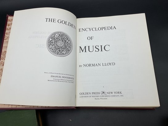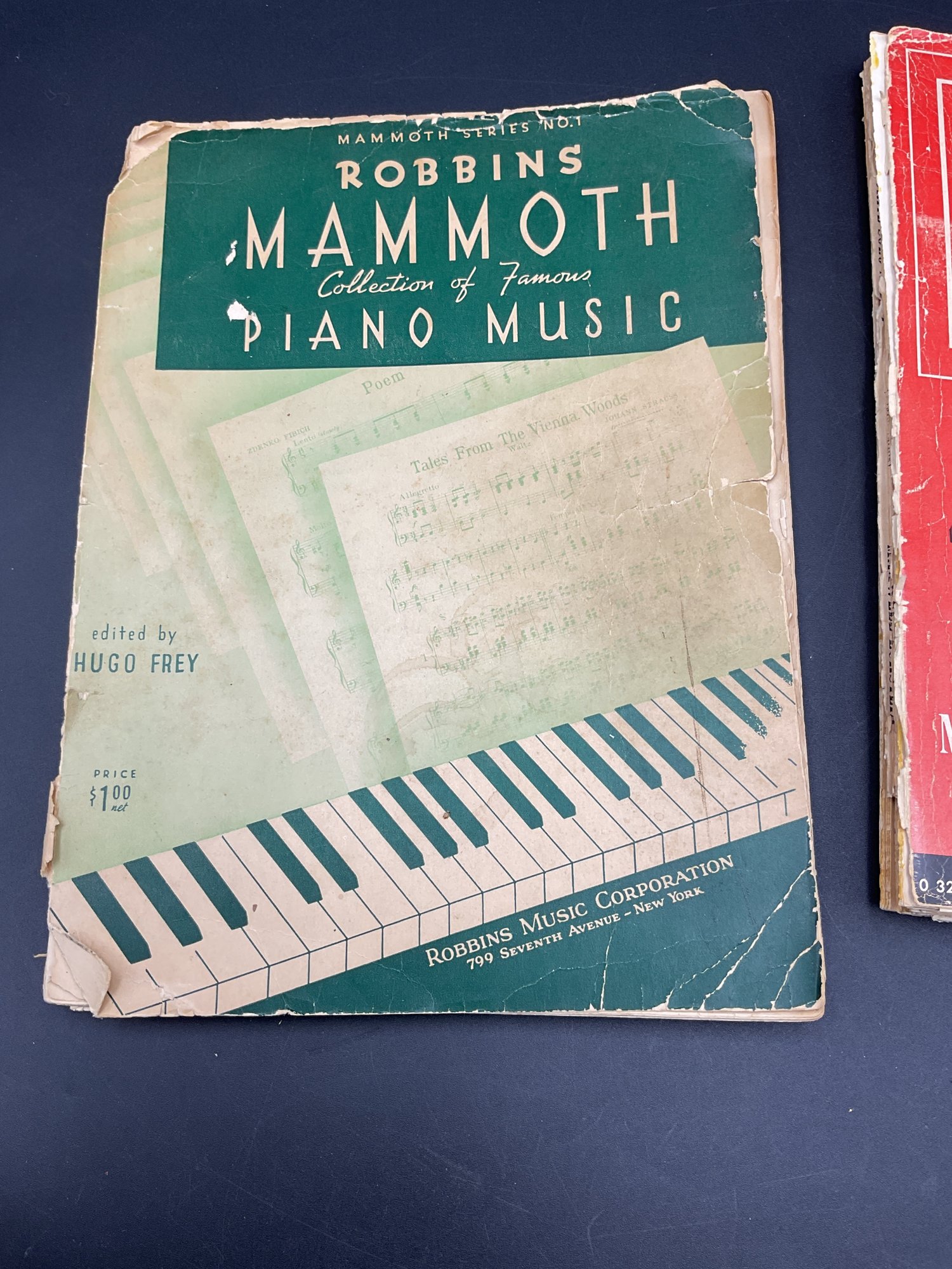 Three 1939 vintage softcover books of classical music: Bach (2) and Chopin (1). Covers loose on two but interior intact, slight discoloration from age but all pages present. Two volumes from the 1918 Modern Music and Musicians series (Vol s 1 and 4, Compositions for Piano). Cover of Vol 1 loose, both vols have some foxing from age, all pages present. The Golden Encyclopedia of Music from 1968 in in very good condition, no problems noted. Lot also includes a very well used Robbins Mammoth Collection of Famous Piano Music from 1936 and "My Favorite Solo Album" from 1944 - we can't guarantee all the pages are present for these two.