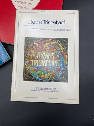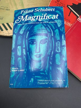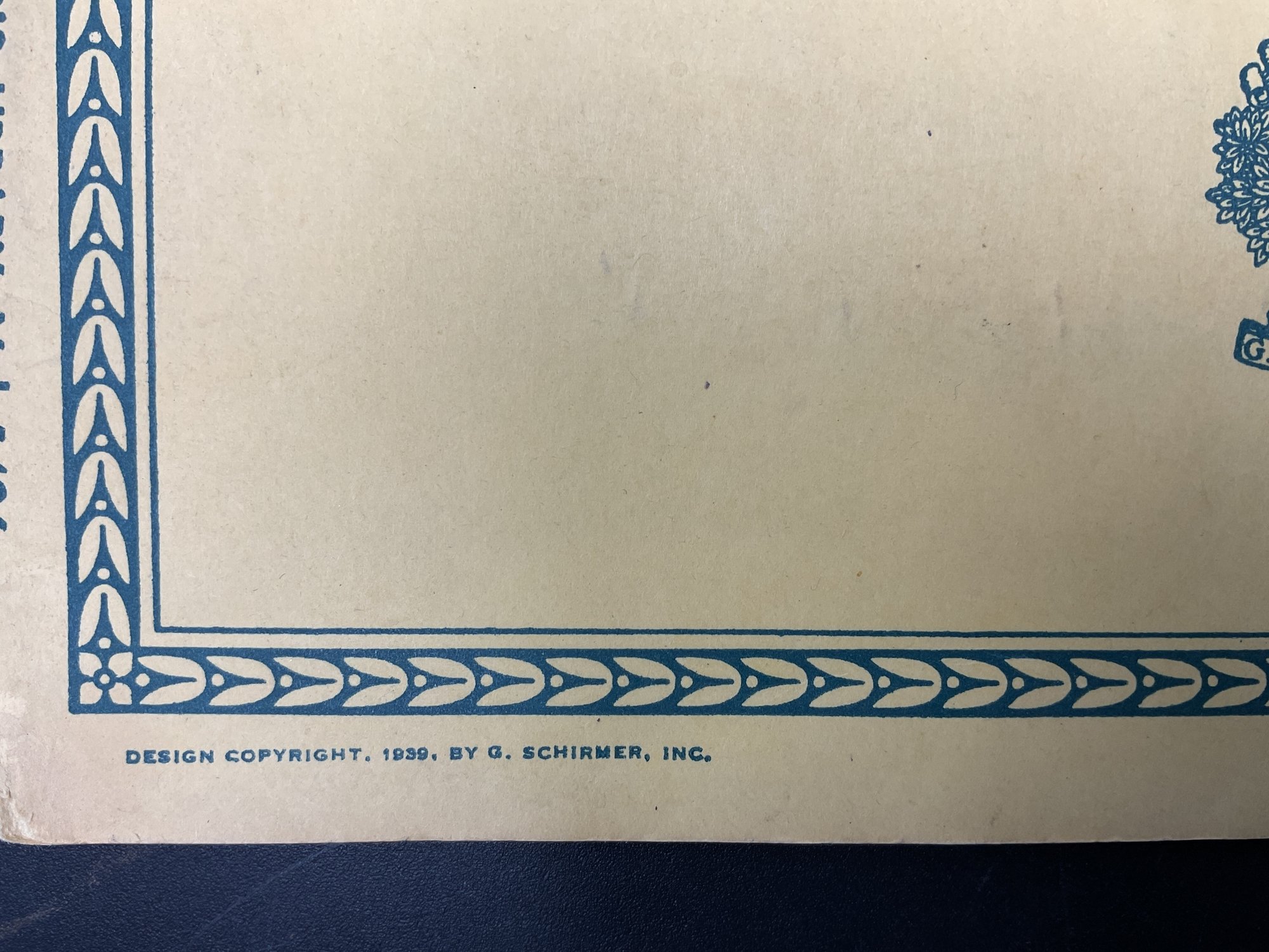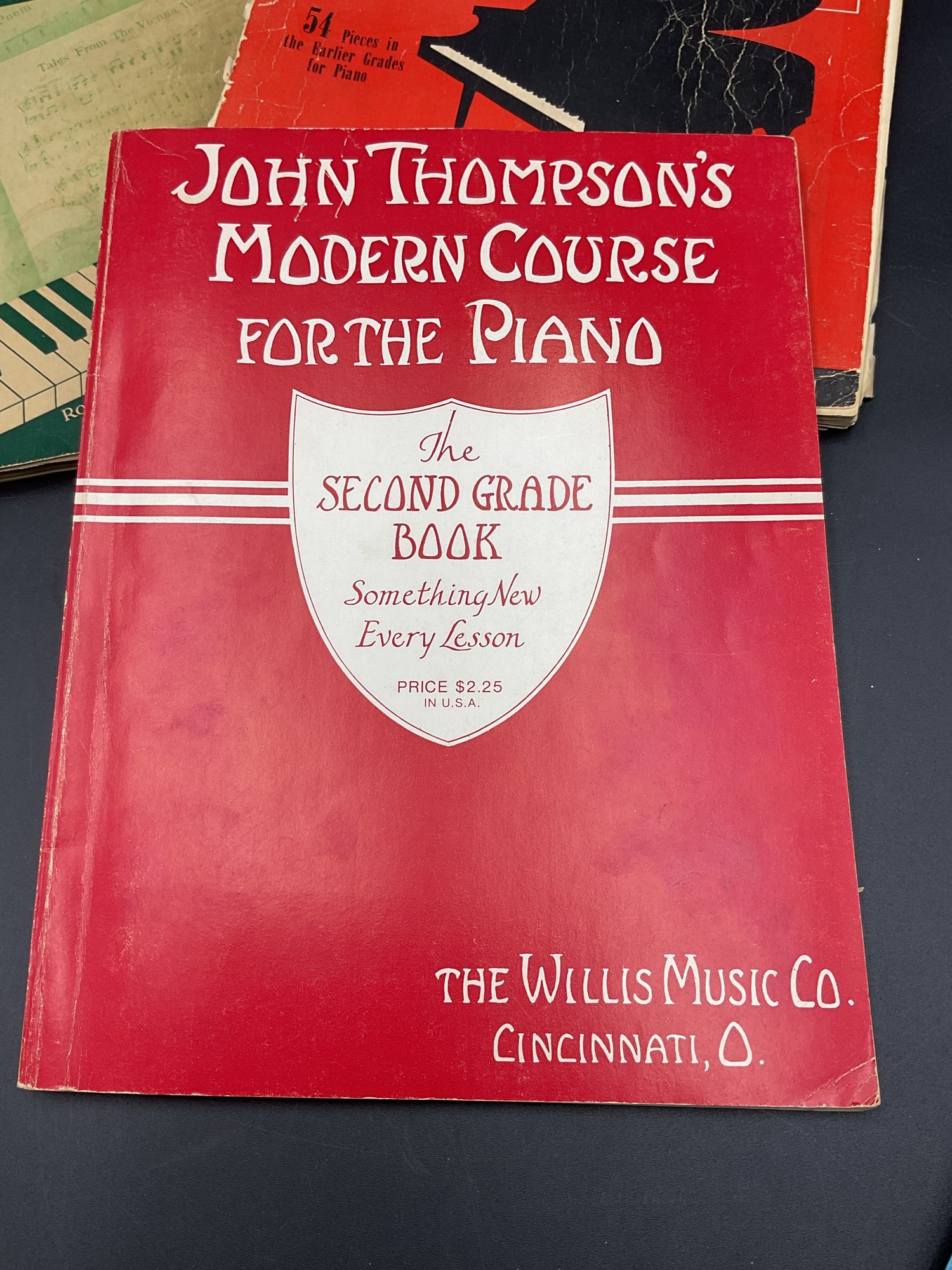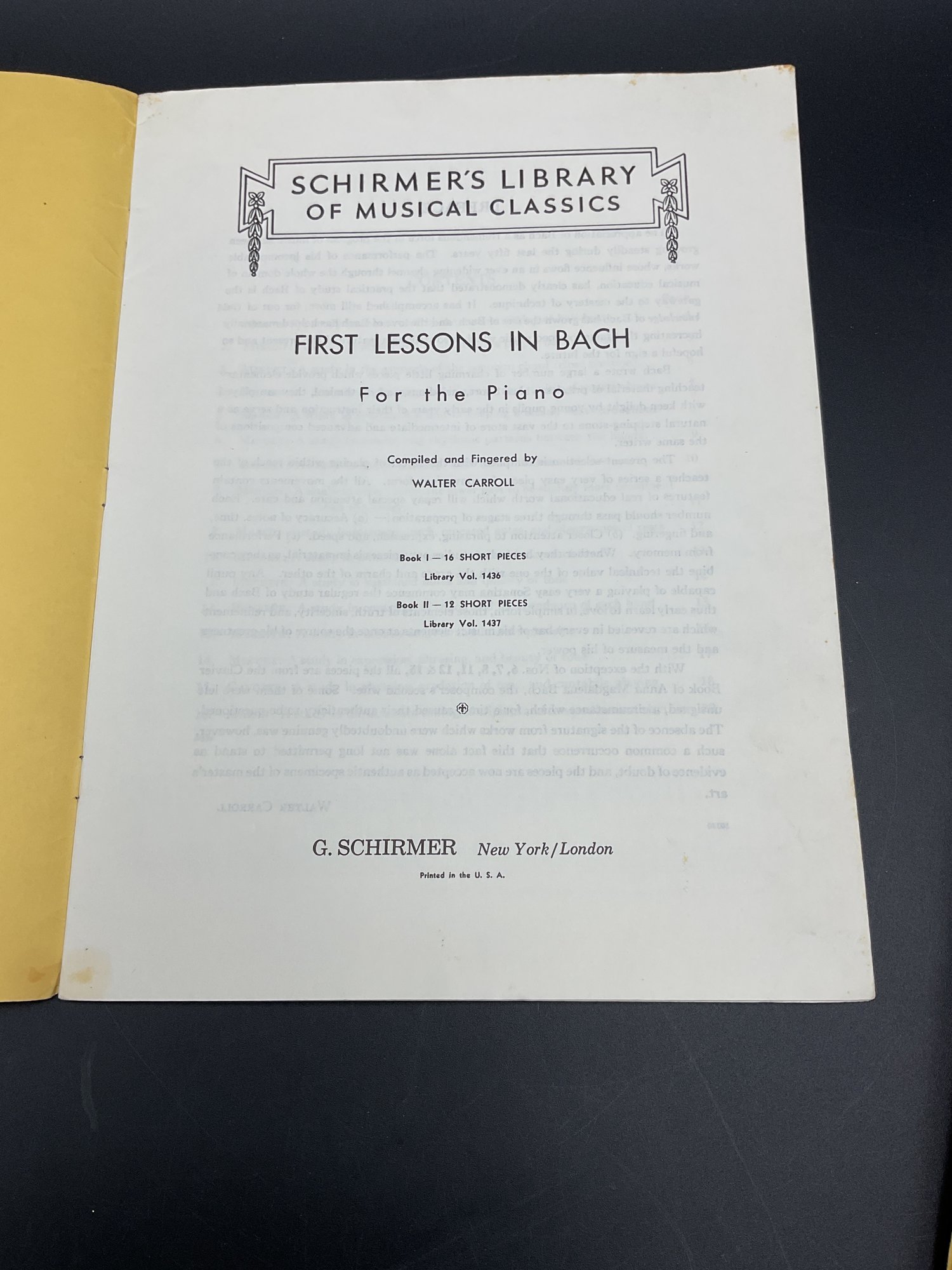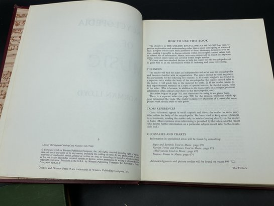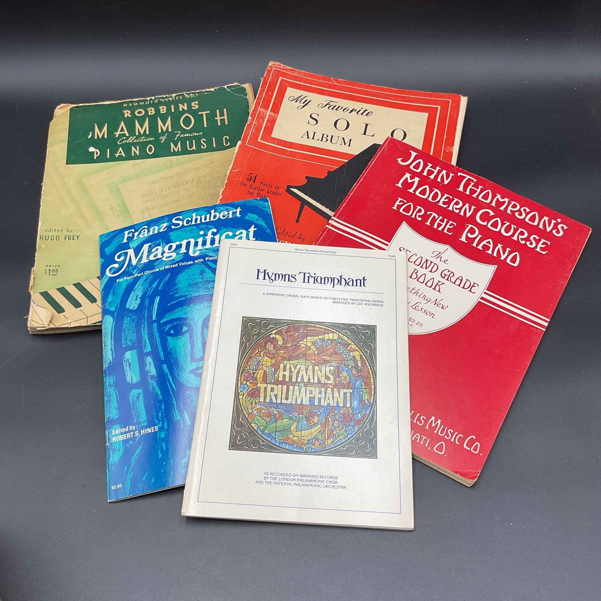 Three 1939 vintage softcover books of classical music: Bach (2) and Chopin (1). Covers loose on two but interior intact, slight discoloration from age but all pages present. Two volumes from the 1918 Modern Music and Musicians series (Vol s 1 and 4, Compositions for Piano). Cover of Vol 1 loose, both vols have some foxing from age, all pages present. The Golden Encyclopedia of Music from 1968 in in very good condition, no problems noted. Lot also includes a very well used Robbins Mammoth Collection of Famous Piano Music from 1936 and "My Favorite Solo Album" from 1944 - we can't guarantee all the pages are present for these two.