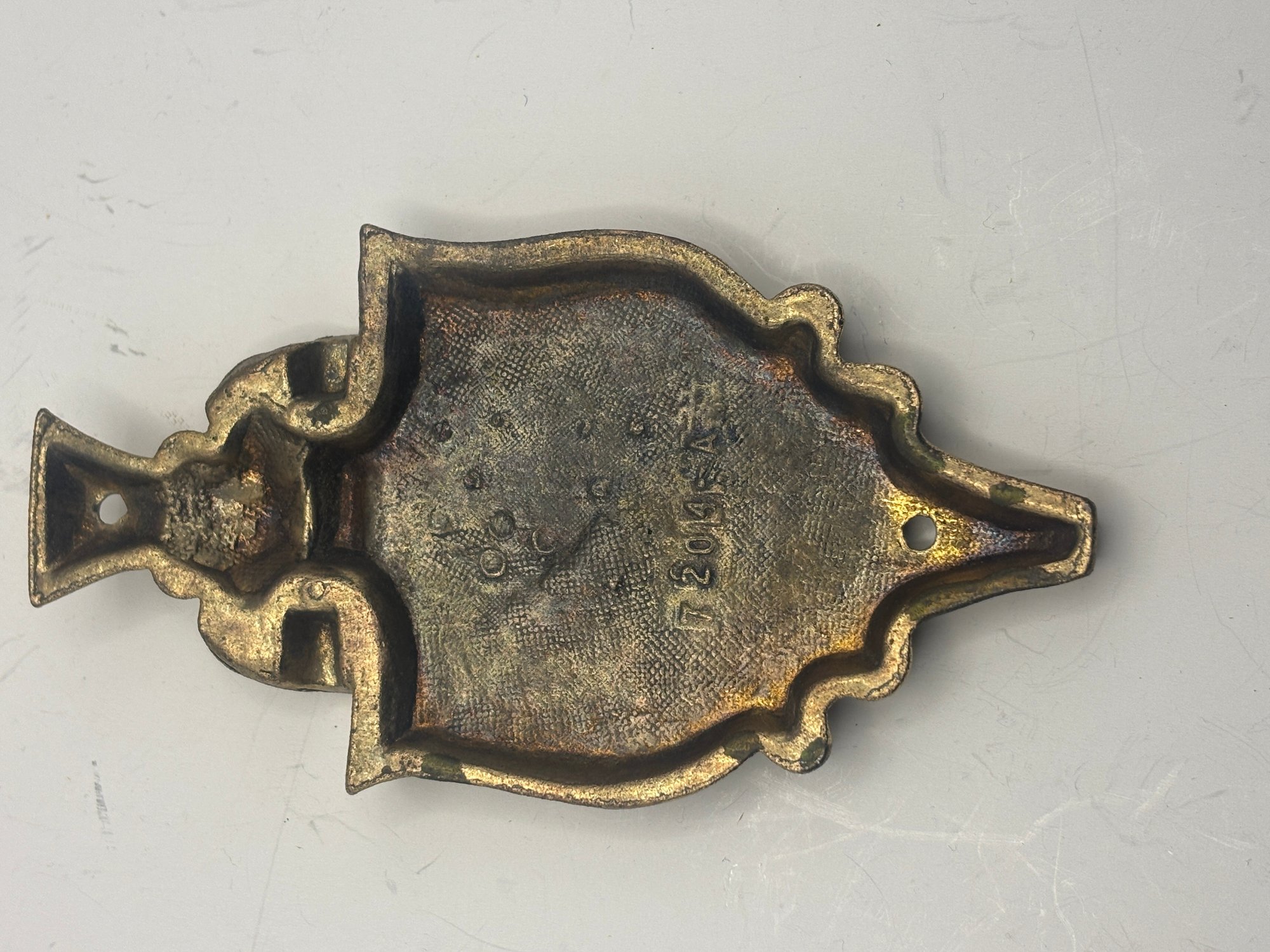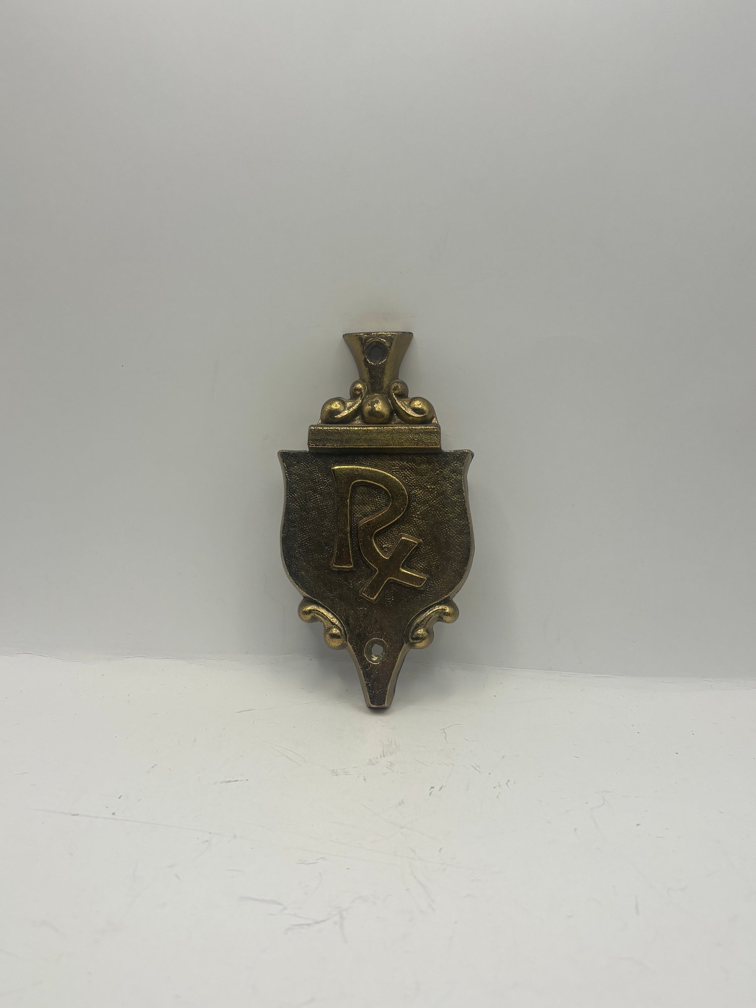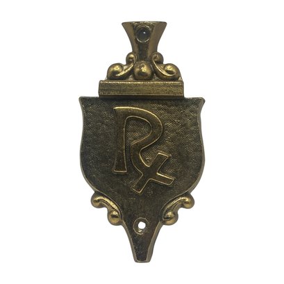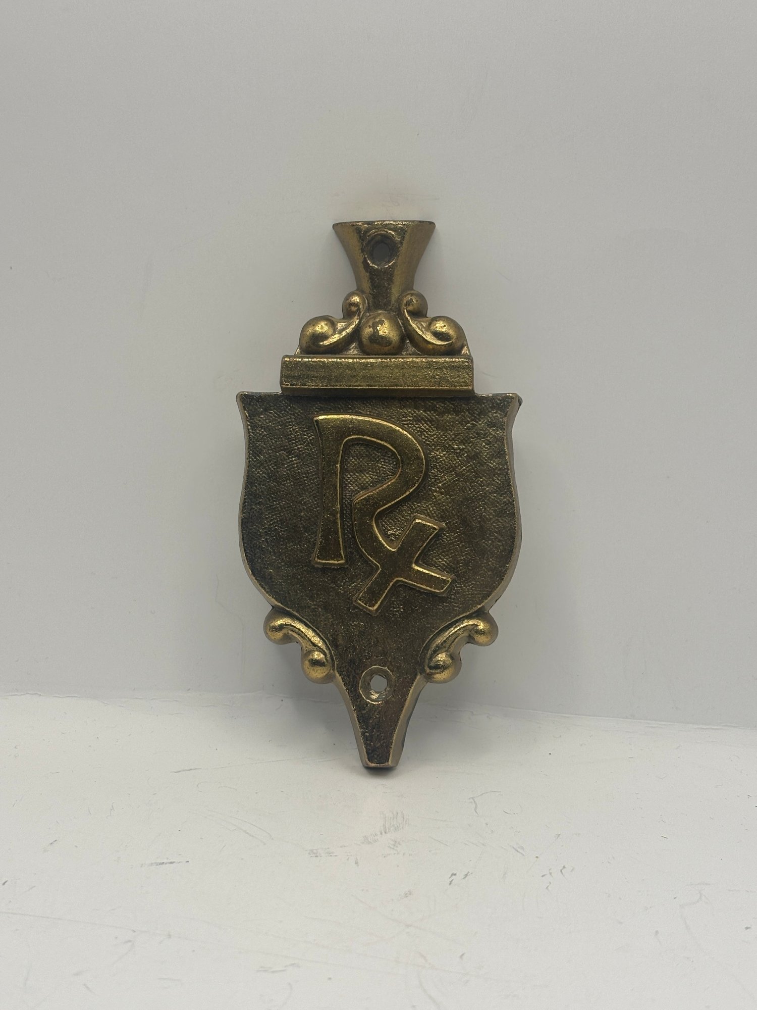 Small but mighty, this cast brass wall plaque features a bold raised “Rx” symbol set within a shield-like cartouche, finished in a warm, aged brass tone with rich surface texture. The form nods to old-world apothecaries, pharmacists’ signage, and mystical alchemical markings—perfect for adding a wink of curiosity to a gallery wall, library nook, or curiosity cabinet.