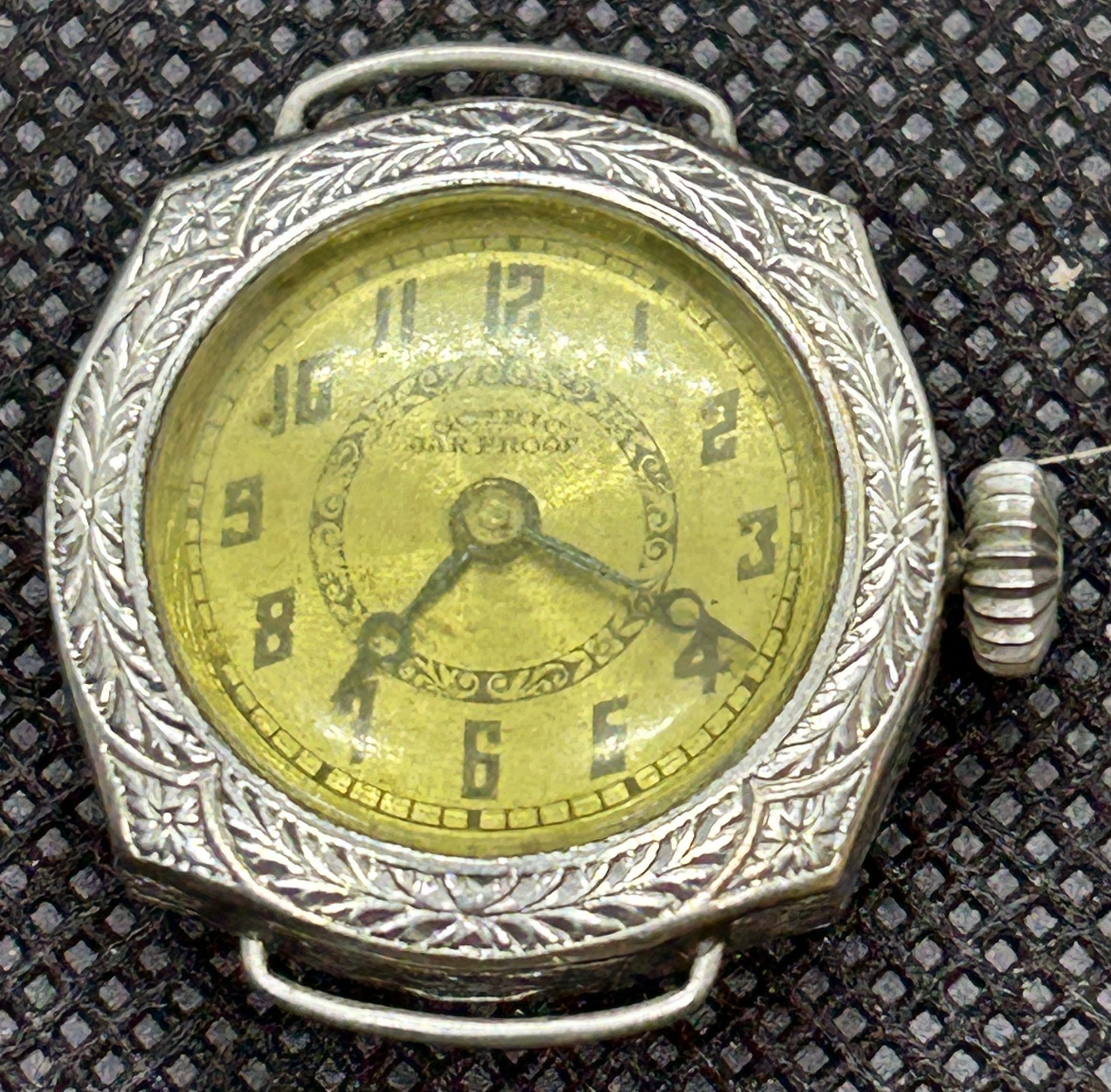 Circa 1920, Art Deco era. It is in good working order, with a clean movement. Ornately chased case is plated in 19 1/2 carat gold. An early wristwatch, with elements that resemble period pocket watches [watchmakers were still figuring out design]. Good overall condition.