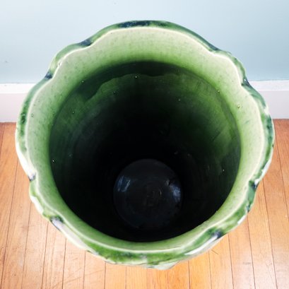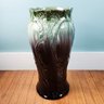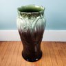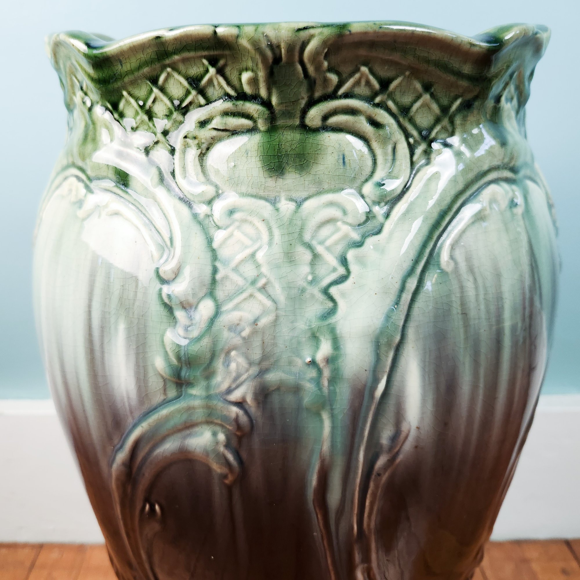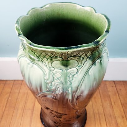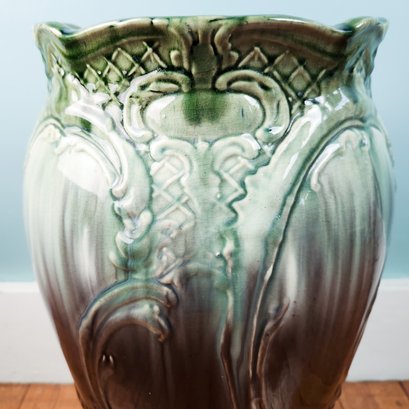 Pretty art nouveau umbrella stand, or floor vase, possibly by Weller or Roseville, with a majolica type glaze.