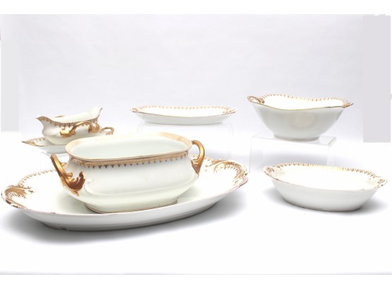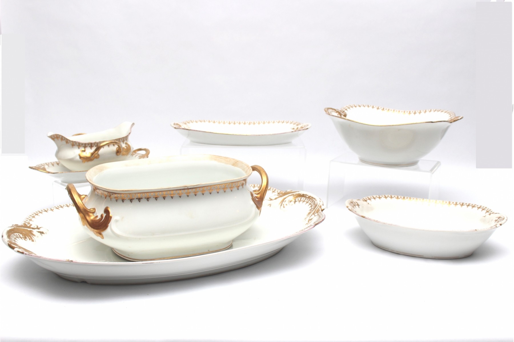 Antique assortment of Limoges, France porcelain pieces with gold Fleur-de-lis pattern and scalloped edges, market Wilhelm & Grafe, New York,D&Co France, R.Deklineirtes & Co, Limoges.