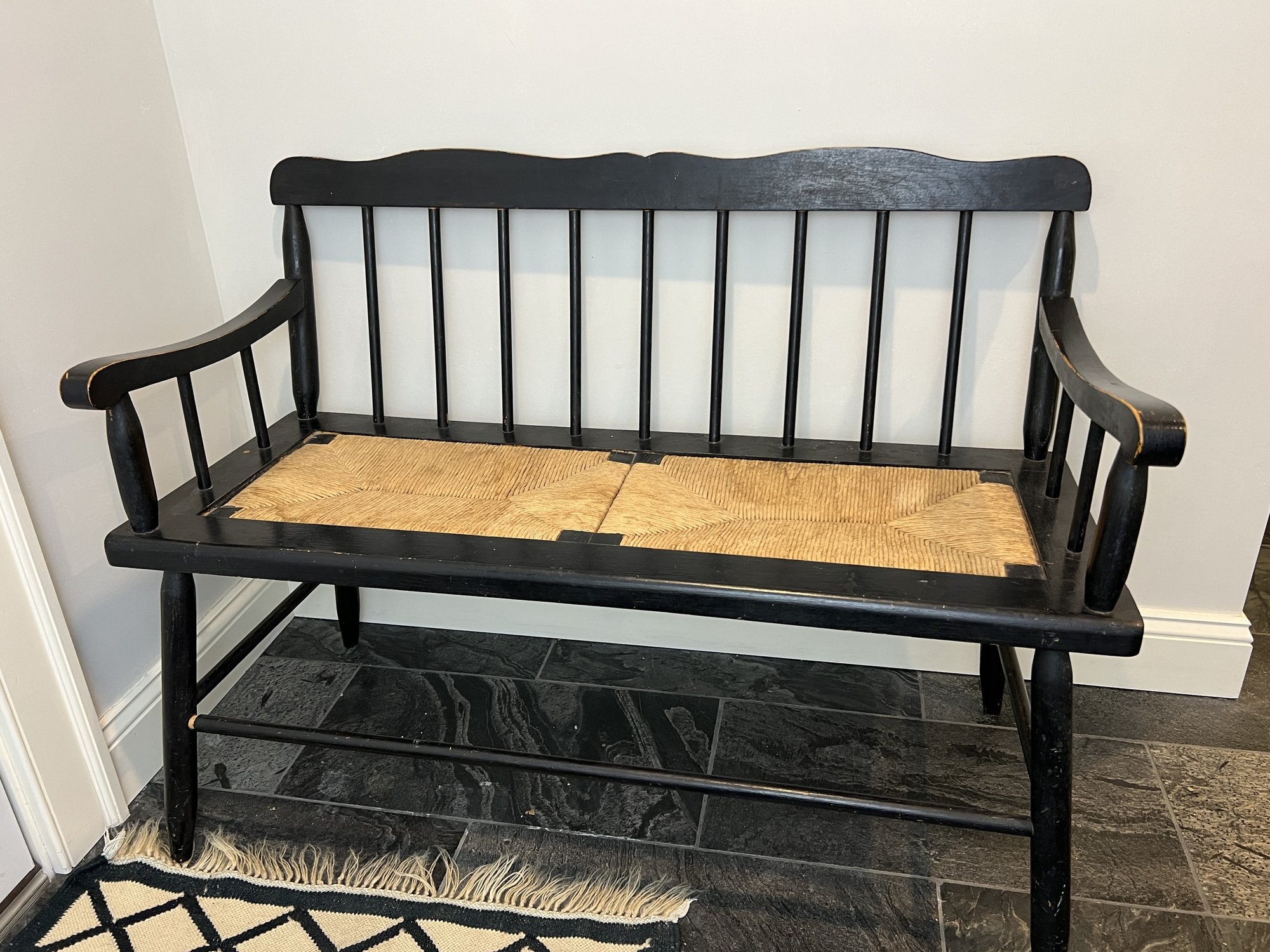 Charming country chic antique bench - perfect for entryway or mudroom - in a distressed black paint finish with rung-back and woven rush seat.