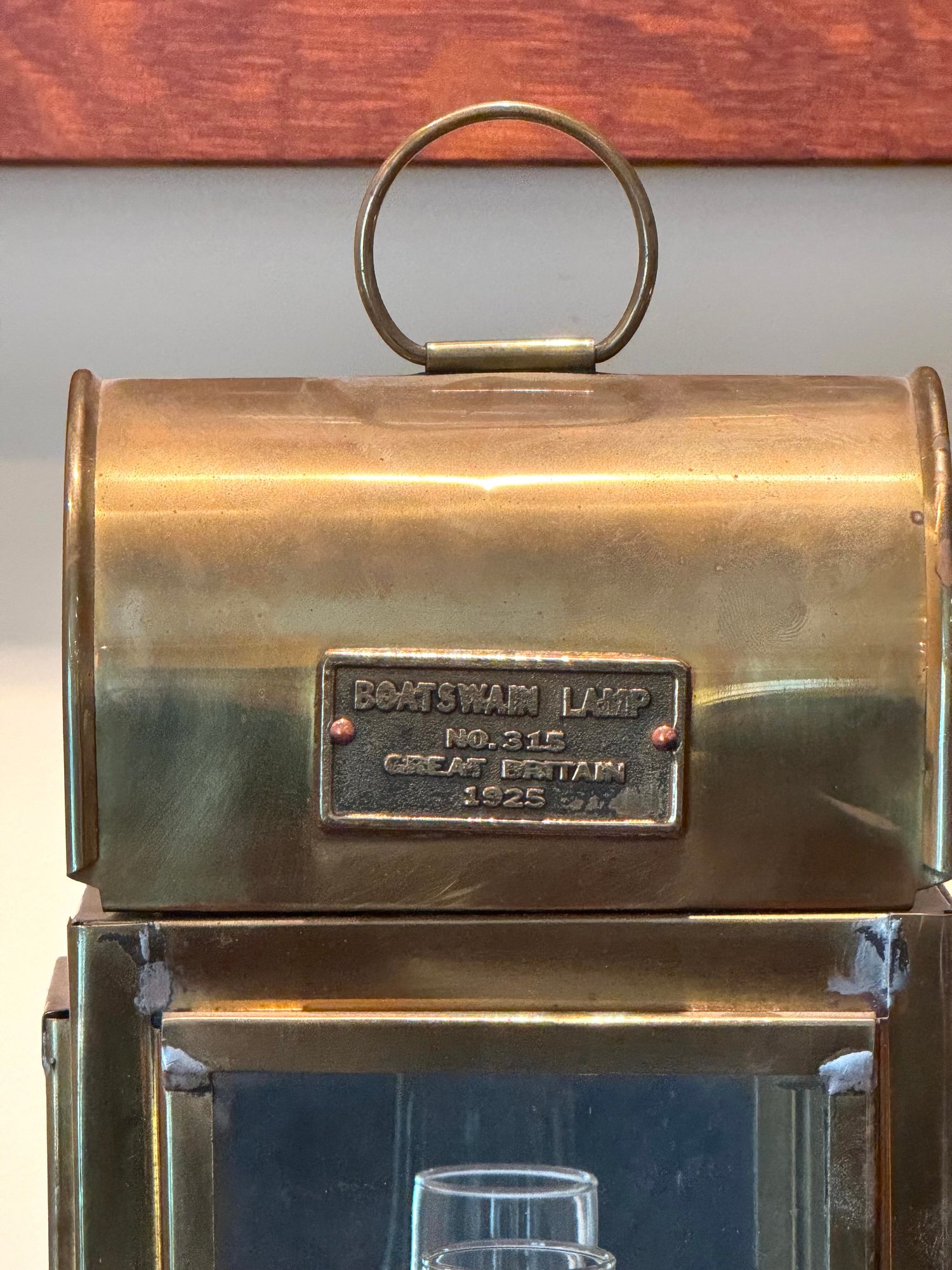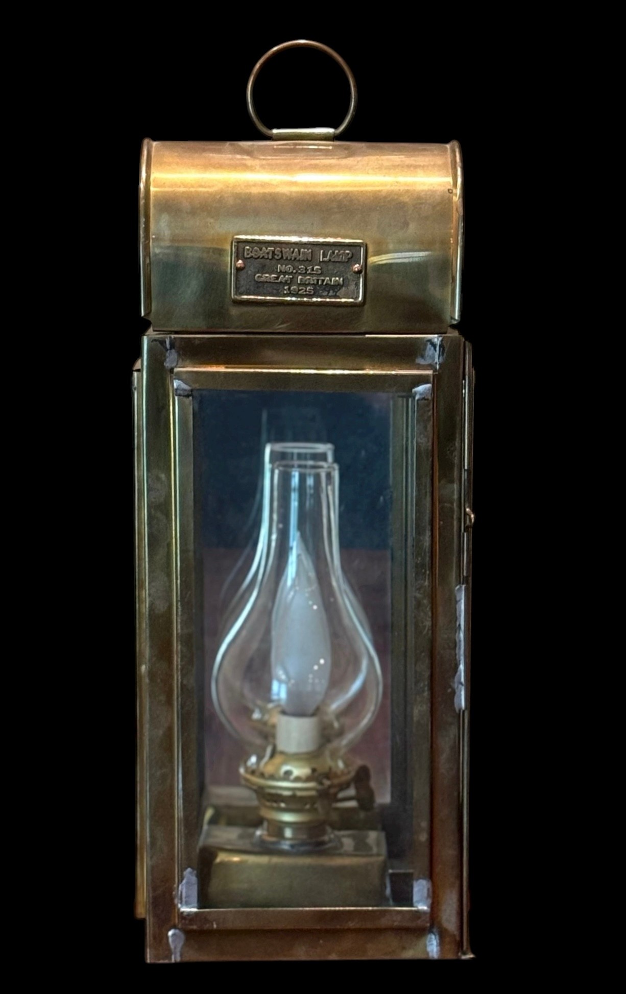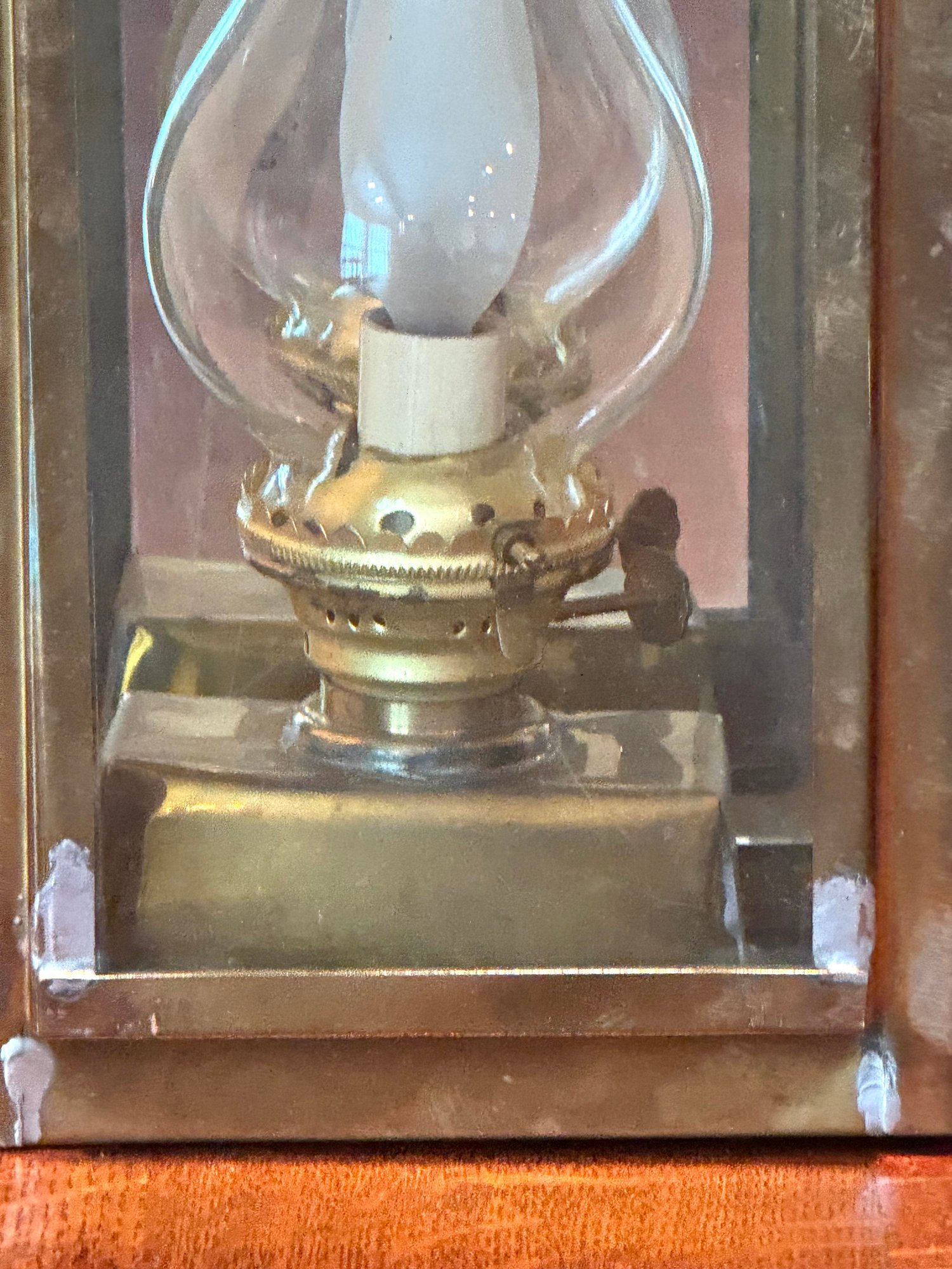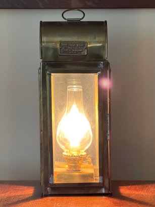 Utterly charming vintage nautical oil lamp that has been electrified. Made of brass with a glass window panels.
