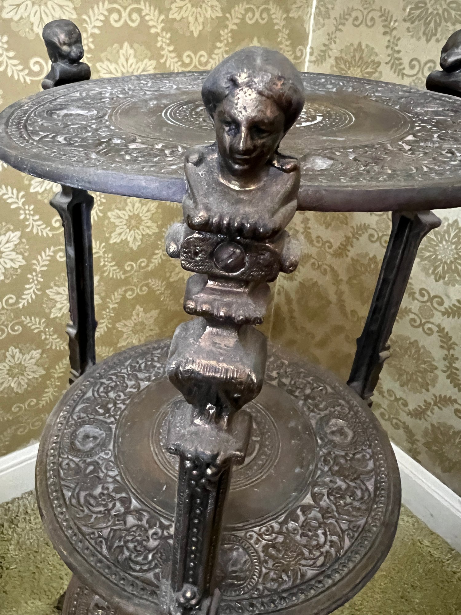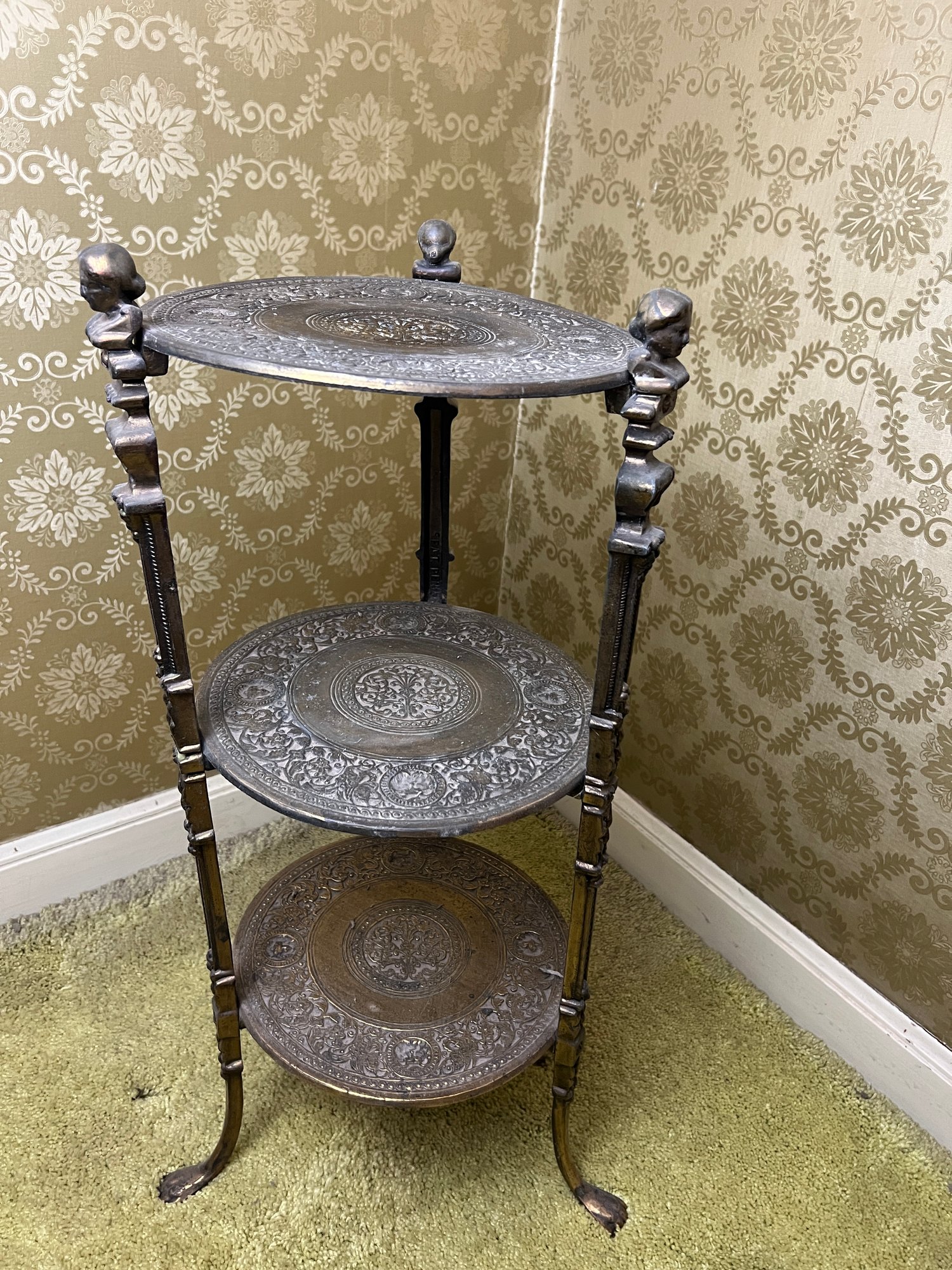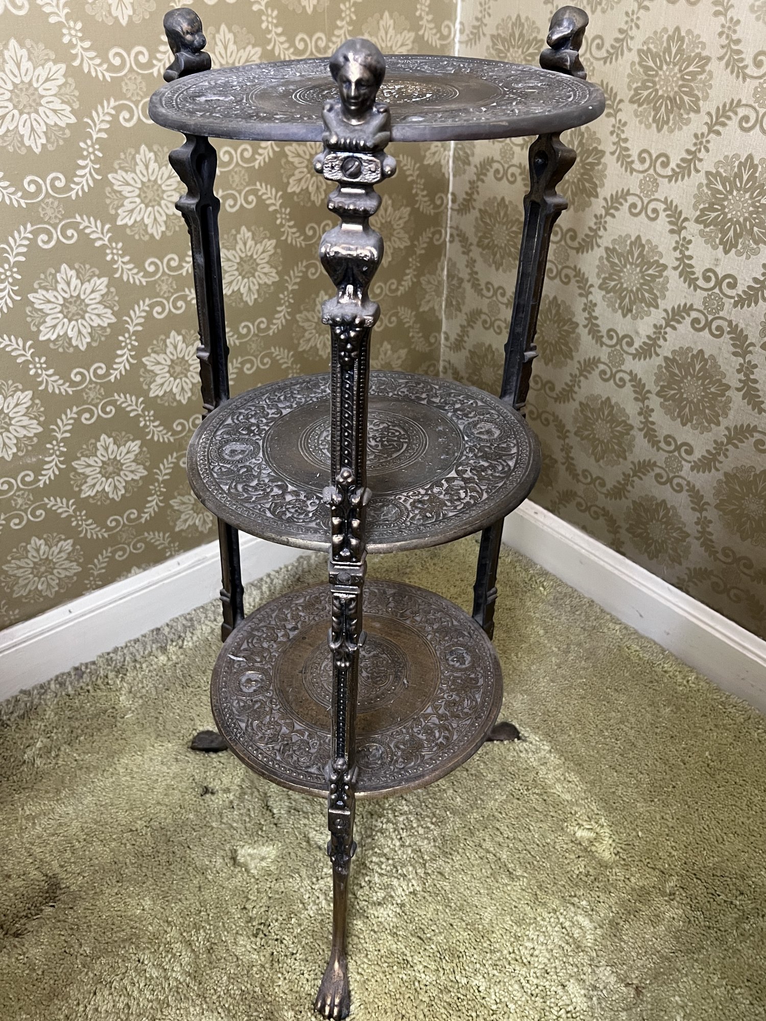 Antique cast brass finish metal three-level plant stand each with an ornate chased design and three figural legs featuring a woman's face at the top and a creature's paw foot at the bottom.