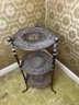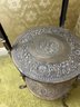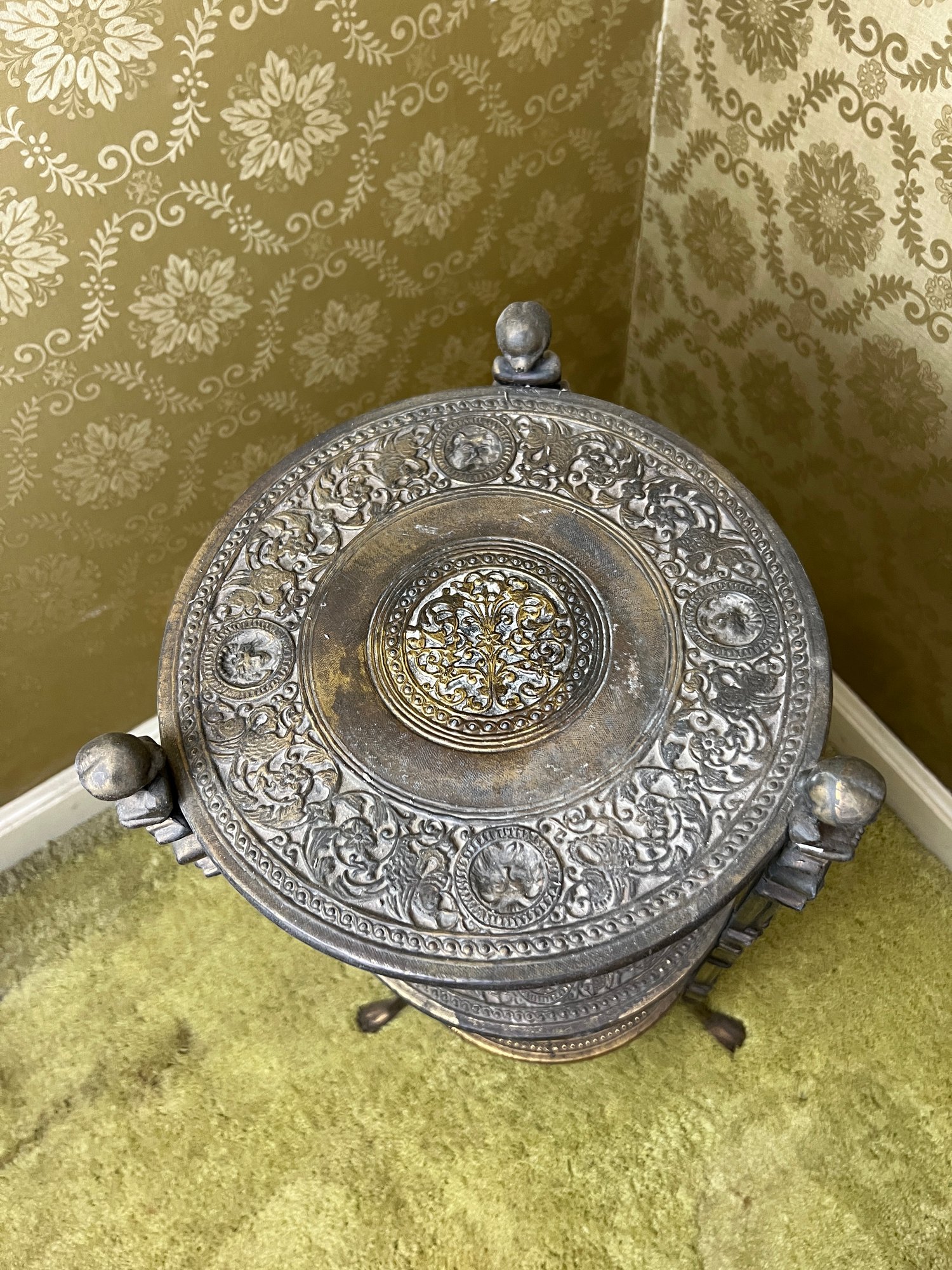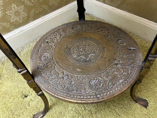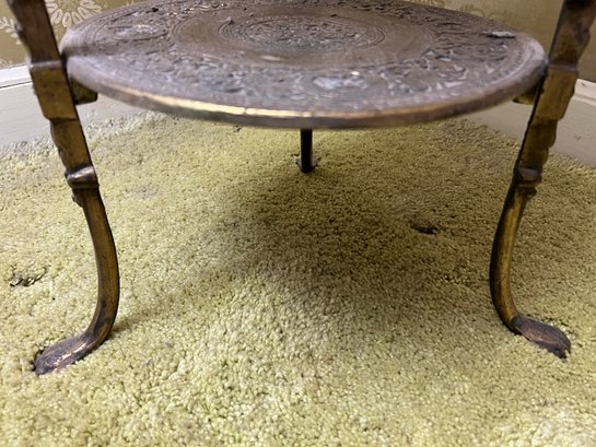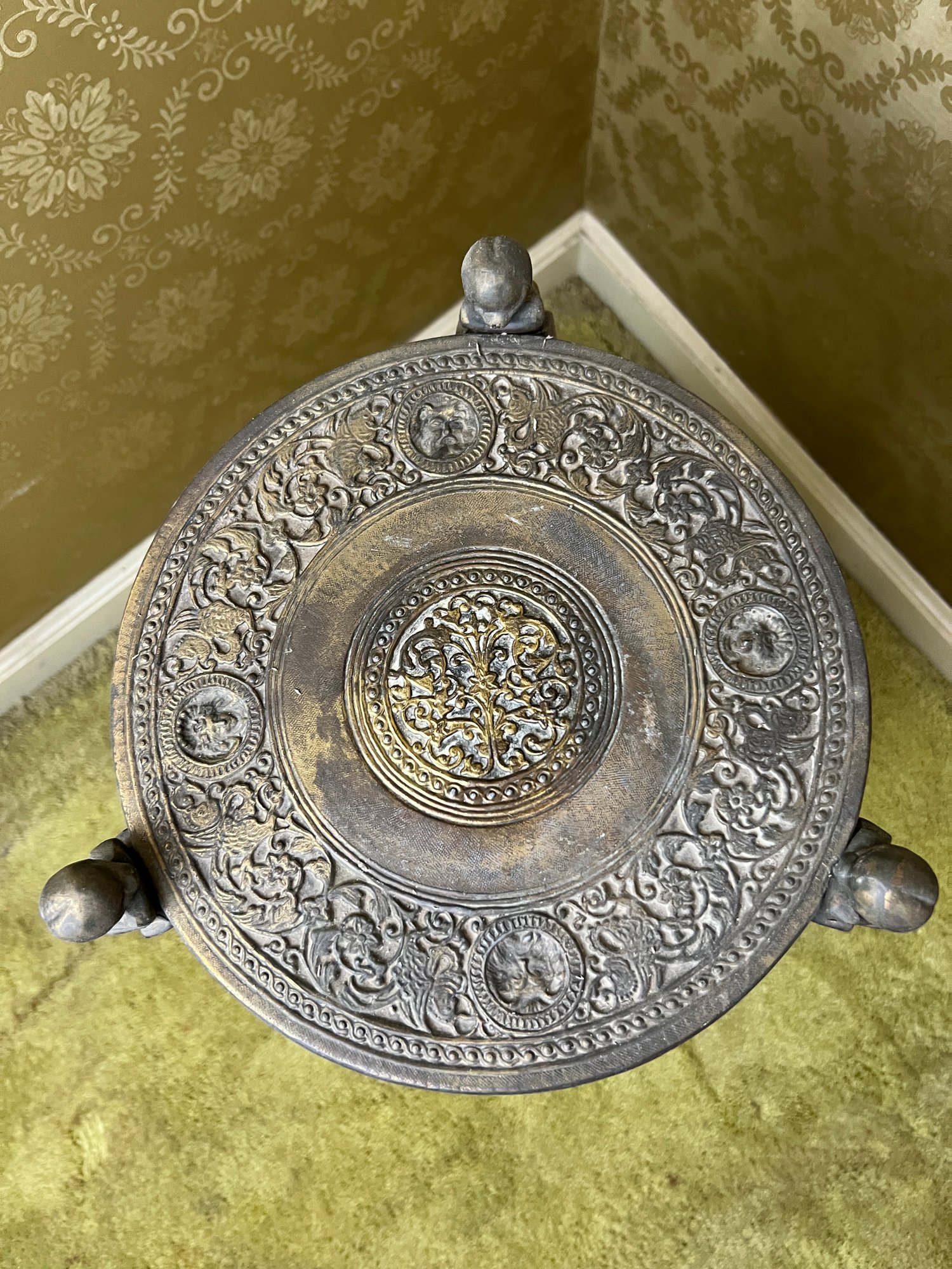 Antique cast brass finish metal three-level plant stand each with an ornate chased design and three figural legs featuring a woman's face at the top and a creature's paw foot at the bottom.