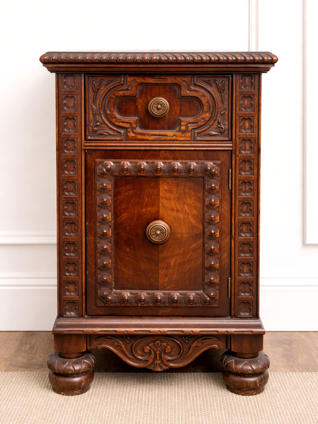 A finely crafted antique nightstand cabinet featuring richly figured mahogany veneer in a striking flame/crotch pattern, accented by bold carved detailing throughout. The piece includes a single upper drawer over a cabinet door, framed by geometric and carved motifs, and rests on substantial carved bun feet with an ornate apron.