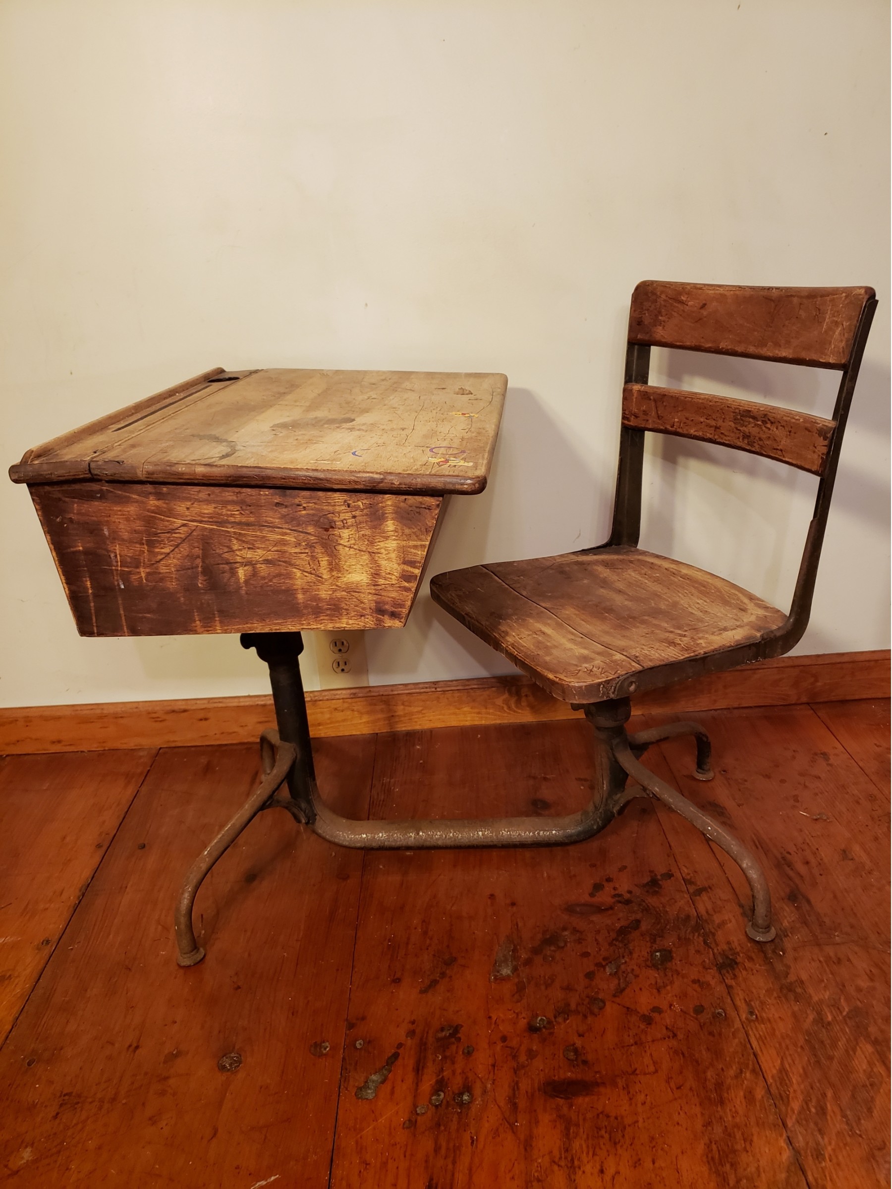 Antique Child Student Desk With Attached Swivel Chair and Iron base 2. Inkwell and hinged top. Desktop and interior graffiti which give this student's desk true character. Solid Oak Desk, Chair slats and seat with Iron chair frame and base.