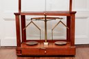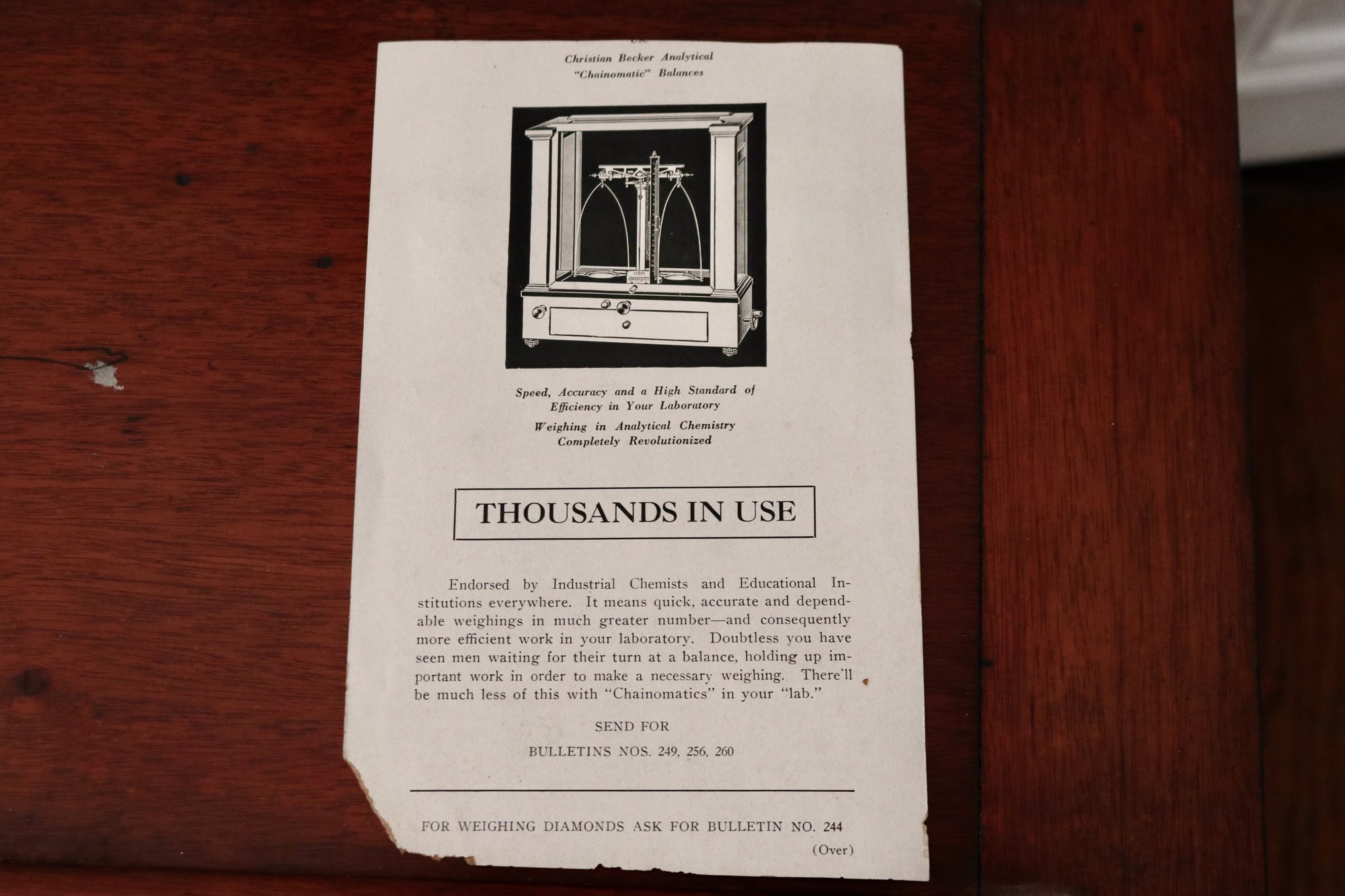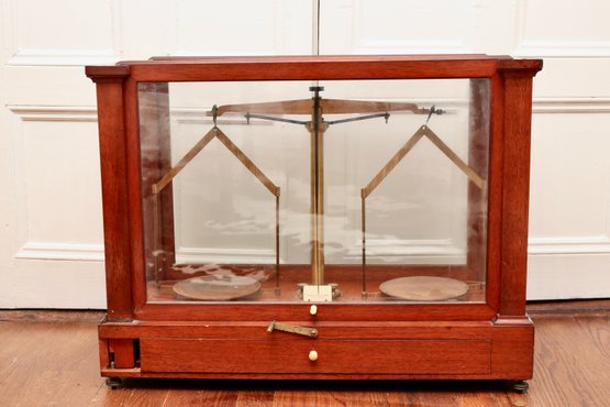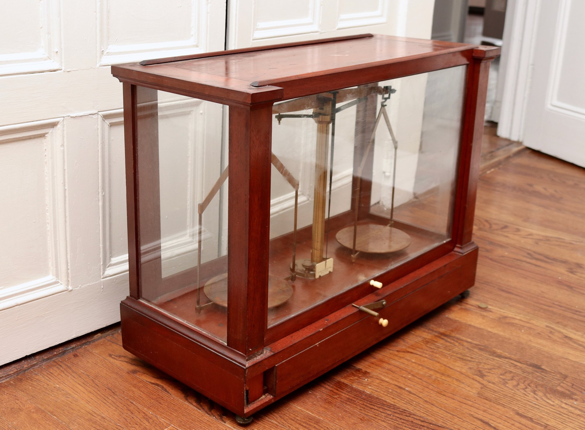 Condition: Good antique condition with age-appropriate wear. Mahogany shows light surface marks and patina from laboratory use. Glass intact. Mechanism appears complete; calibration/accuracy not tested. Drawer present. Missing piece on front bottom. An excellent decorative and collectible example.
